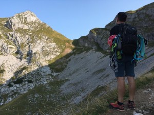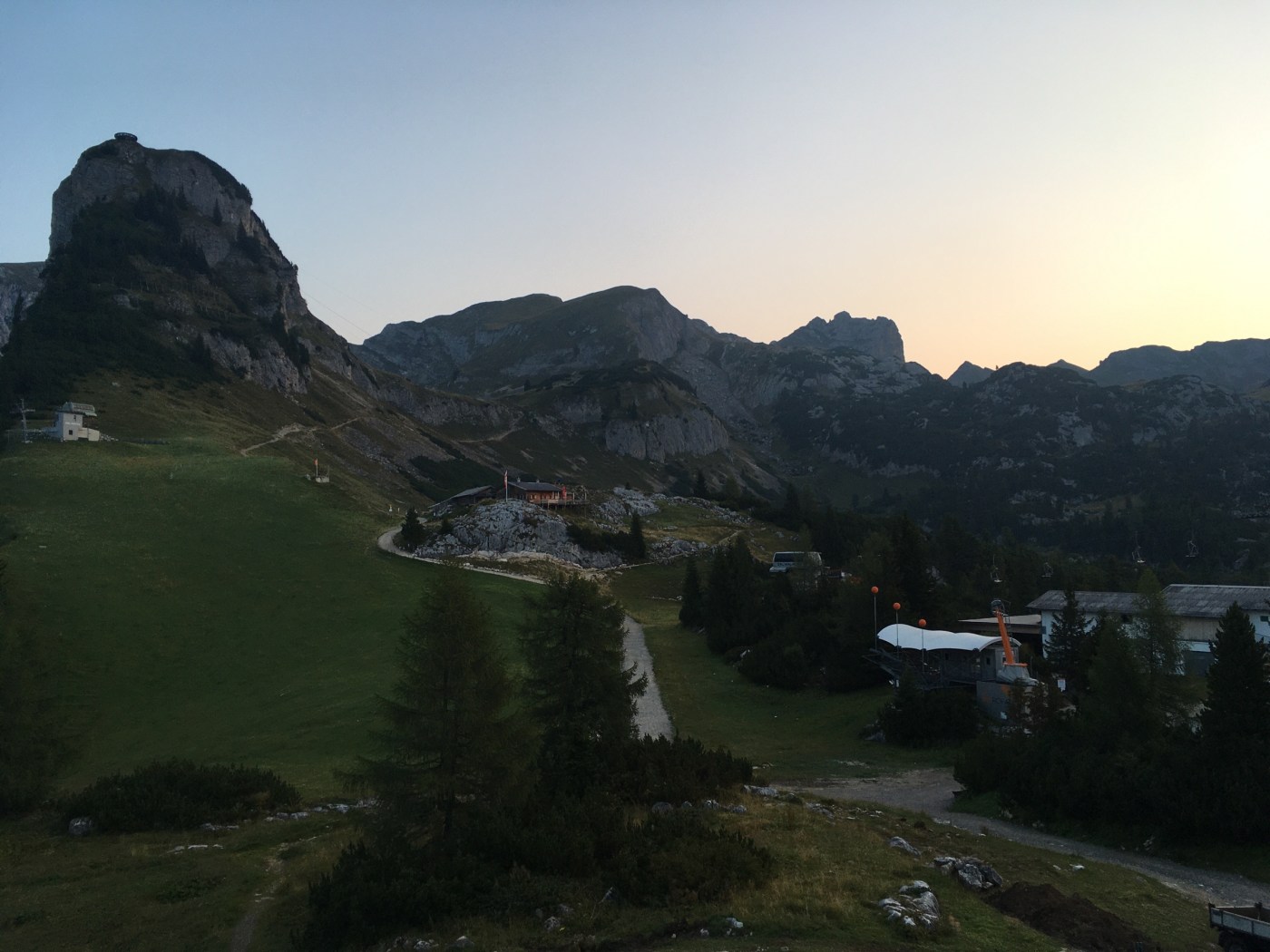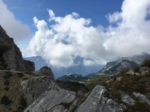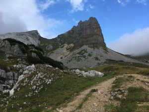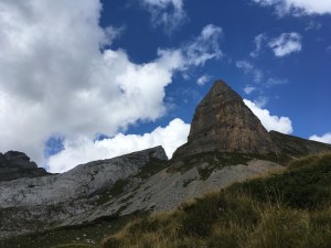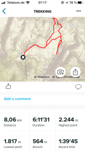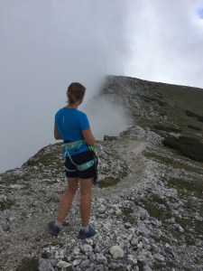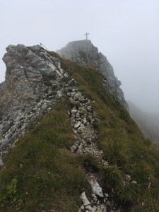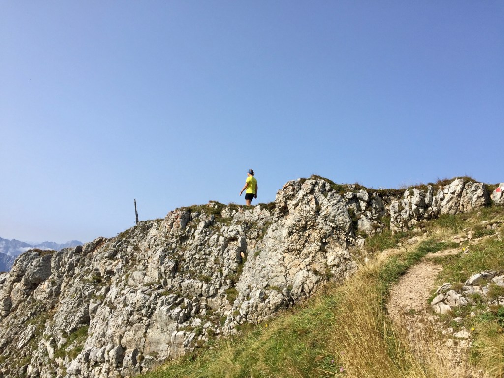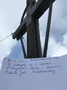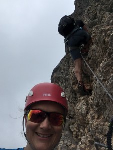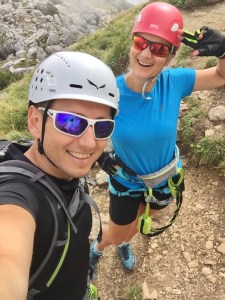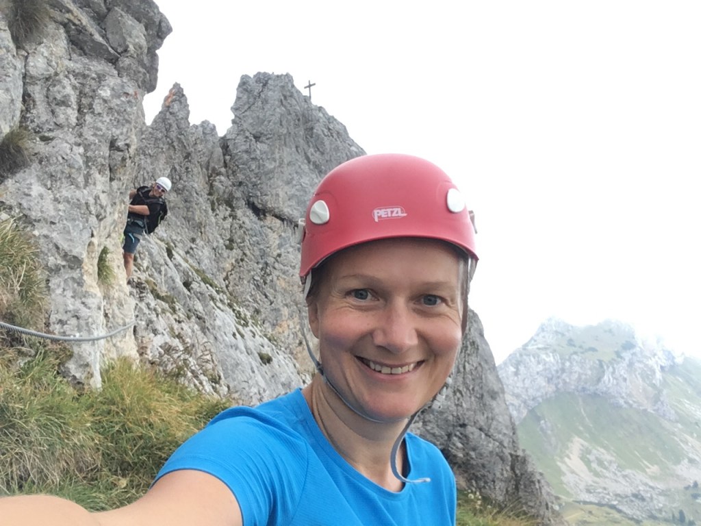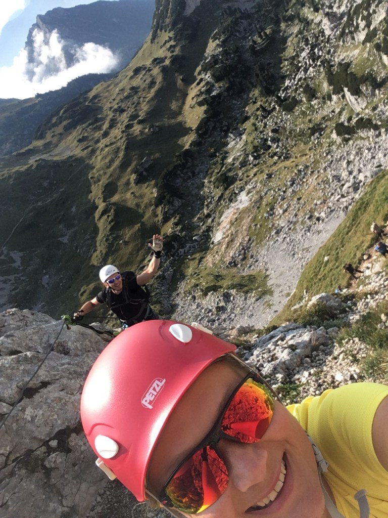 Podładowani pierwszym sukcesem postanawiamy zrobić podejście na najtrudniejszy KS tej rundy, Rosskopf. Tu już jest C/D czyli dla nas nie bele co. Pod wejściem spotykamy ojca z synem, którzy podejmują próbę, ale szybko się wycofują. Ok, to teraz my… Marcin rusza przodem, łydki szybko zaczynają drgać, ja za nim i dołączam do drgawek 😉 Ale, wszystko da się opanować i idziemy dalej: sporo kombinowania i szukania oparcia dla rąk i nóg i sporo podciągania – trochu strasznie chwilami, ale jednak super! Docieramy na szczyt w środku chmury – może to i dobrze, bo szczyt wąski, a widoki w dół na pewno głębokie… Przechodzimy szczyt i gratem schodzimy w dół – stromo! Ale nietrudno. Starczy emocji na dziś! Odpuszczamy już Seekarlspitze i schodzimy do huty – po drodze jeszcze highlight: skrót przez osypisko. Znowu wychodzi słońce, błękitne niebo i Rosskopf pokazuje się w pełnej krasie – dałeś nam w kość, bratku! Chwila na selfie i schodzimy. Po drodze głaskam jeszcze pięknego blond konia – M oczywiście nie robi mi pamiątkowej fotki więc foch! Jeszcze chwila i huta: checkujemy się w naszym pokoju z widokiem na Rosskopf właśnie, szybki prysznic i rozsiadamy się na tarasie przy zachodzie słońca: chill pełno gembo i przepyszne jedzenie. Co za dzień! Było dosko 😍