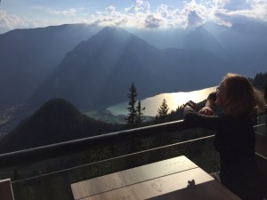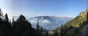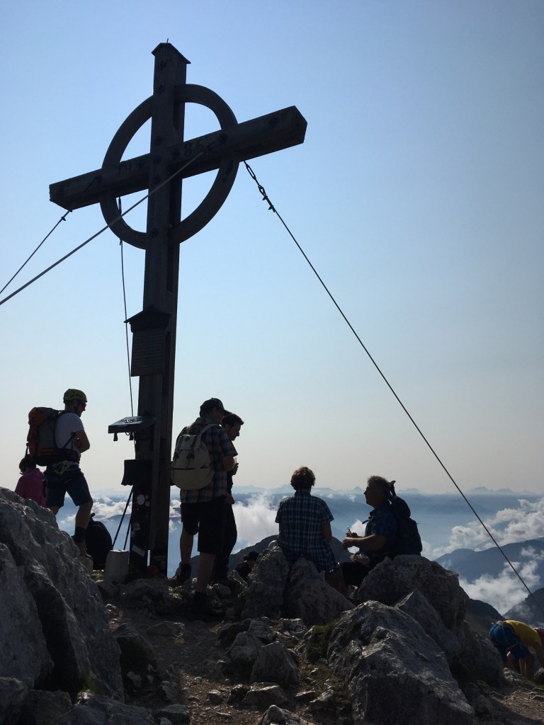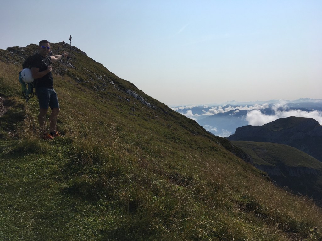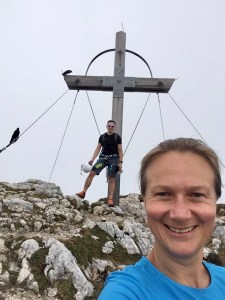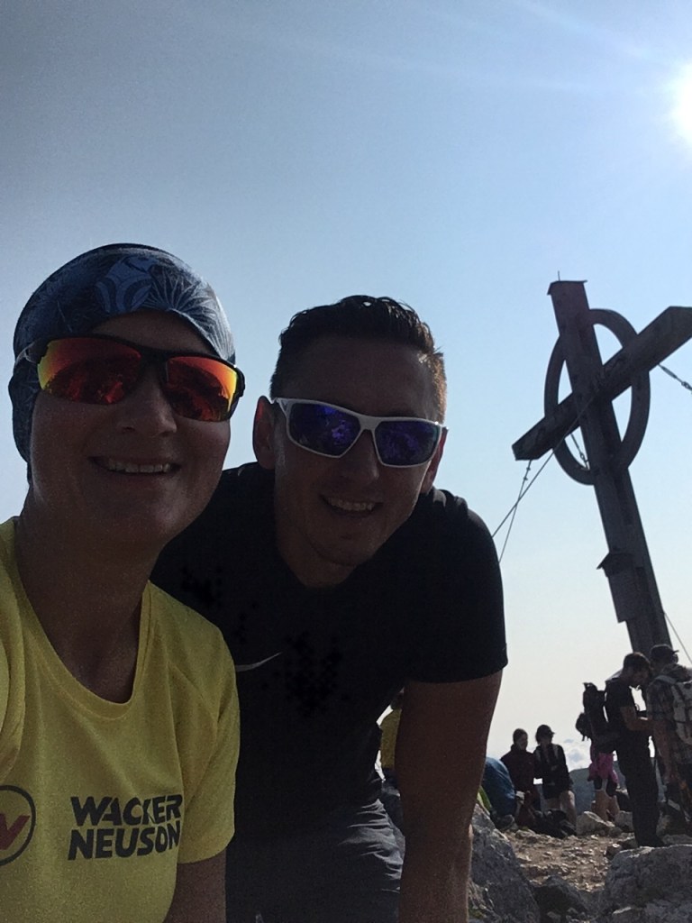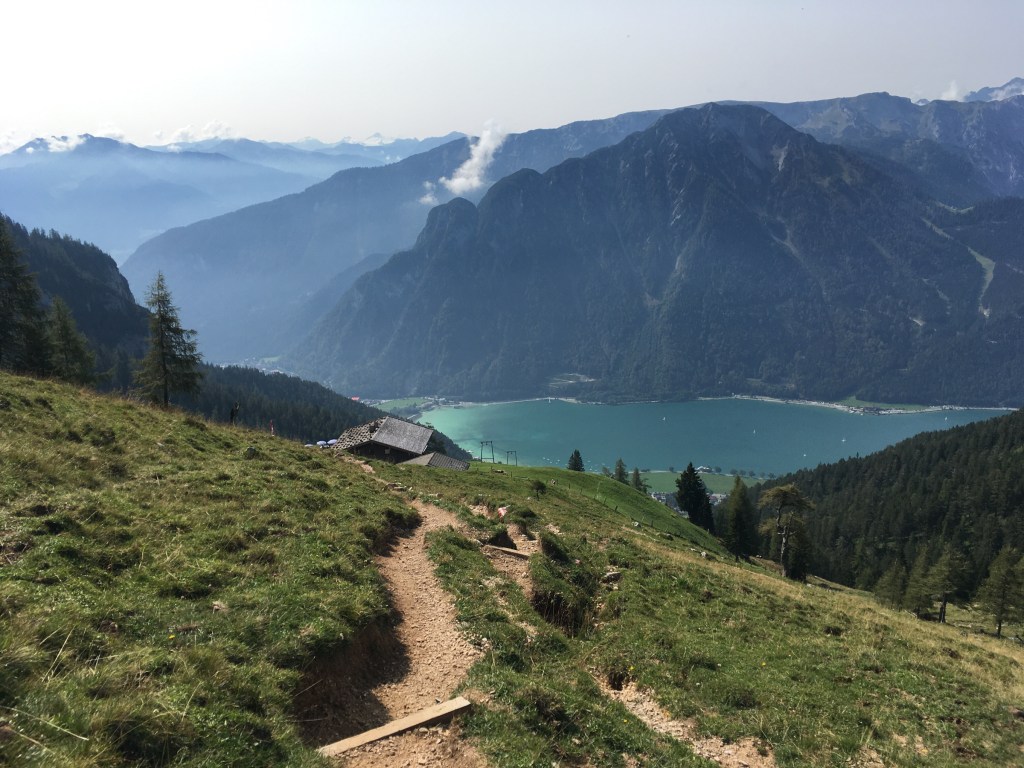 Niedzielny wczesny poranek: piękna pogoda! Dziś wreszcie się ponacieramy widokami z góry: ruszamy na Hochiss, ostatni i najwyższy z 5 szczytów. Jest przed 9, zadziwiająco ciepło, przepiękny poranek. Na KSie jest parę osób, w tym rodzice z dziećmi, więc trochę to trwa… Ale, udaje się ich obejść i w końcu szybciej, niż byśmy sobie życzyli, jesteśmy na szczycie! Bardzo fajna feratka, szkoda, że taka krótka, bo poziomem stresu absolutnie nie do porównania z Rosskopf… Widok ze szczytu obłędny! Schodzimy jeszcze do w pełni obłożonego tarasu DalfazAlm, tam pogawędka z zapoznanym emerytowanym instruktorem jazdy z Goerlitz, który jak się okazało, zna Sudety lepiej od nas, i ruszamy z powrotem do ErfurterHütte – czas na nas! Kolejką w dół i po chwili rozkładamy się na Achensee. Niewiele ludzi, słońce świeci, ale temperatura wody mocno alpejska, 17c… Mimo to, pełne zanurzenie! Warto było, wisienka na torcie tego mega wkendu 😍