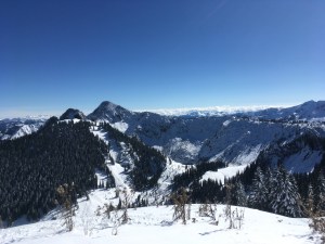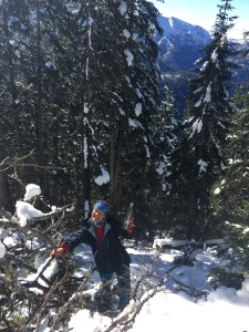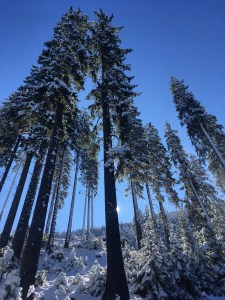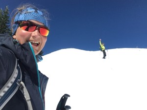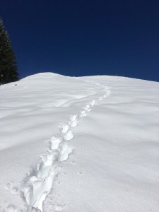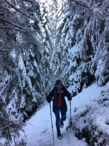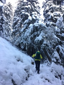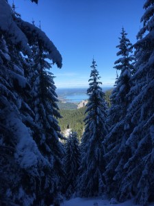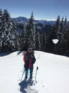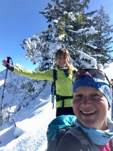 Wchodzimy na właściwy szlak i drzemy przez śnieg – którego coraz więcej! – do góry. Wreszcie wychodzimy na punkt widokowy na kozice (kozic brak) i odbijamy w prawo na Risserkogel, jeszcze 1h15 – ale już po 10min musimy zawrócić, bo ślady się kończą i kompletnie nie widać, którędy dojść na grań. Szkoda, ale nie ma sensu próbować, więc zawijamy na Setzberg, 45min. Śnieg kapie z drzew – w zasadzie to leje 😉 Ale w końcu wychodzimy z lasu: mega błękitne niebo, wielka biała połać śniegu i pojedyncze ślady w górę. I zaraz już krzyż i widok na Tegernsee i wszystkie białe ośnieżone szczyty, jak na wyciągnięcie ręki, jest przepięknie! Obowiązkowa foto sesja i wracamy w dół tą samą trasą, przez roztopy, w rakach.