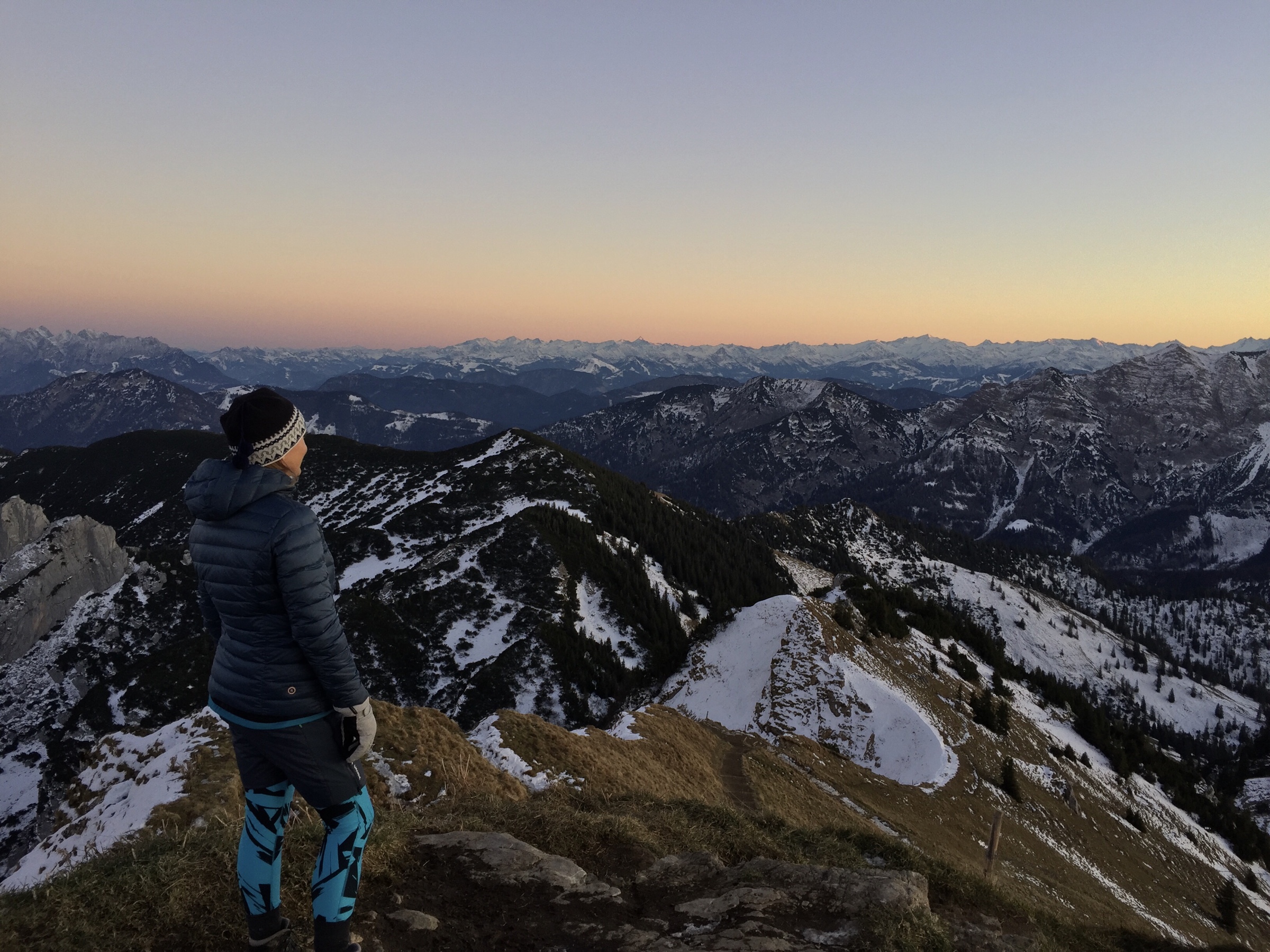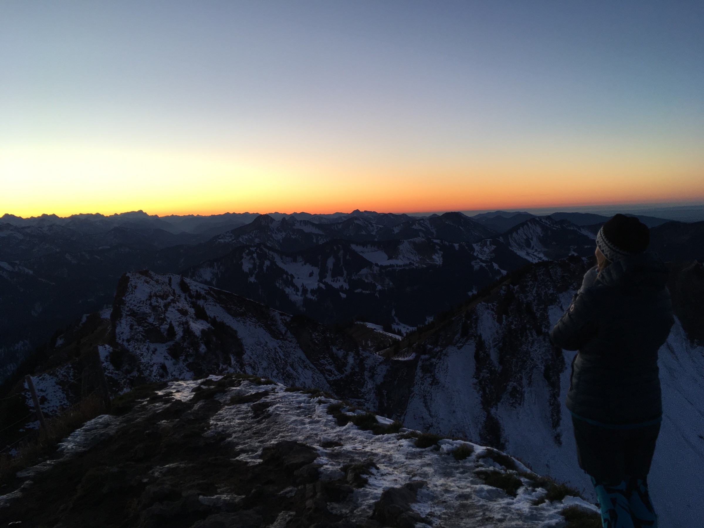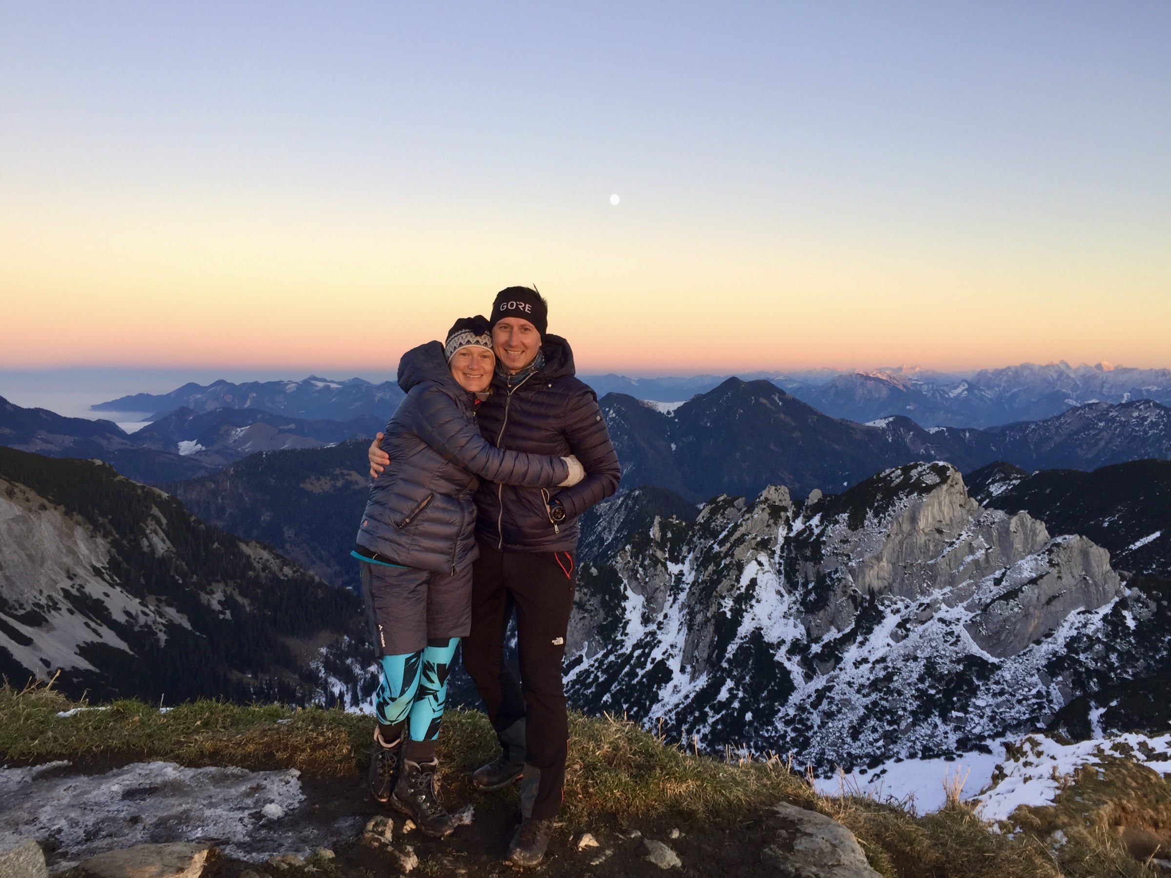 Trasa na Rotwand piękna jest, 3 lata temu tu byliśmy i nie miałam w pamięci, że taki mega widok i po drodze, i z góry! Szaleństwo. Po drodze ciepło bardzo, ale na szczycie, jak tylko zaczęło zachodzić słońce, zaraz powiało chłodem… Ale, mieli ubranka, oraz grzane wino, więc chłód niestraszny! Na szczycie przez chwile byliśmy tylko w 3 i ta cisza i kolory zapierają dech w piersiach, zachód słońca to magiczny spektakl jednak.