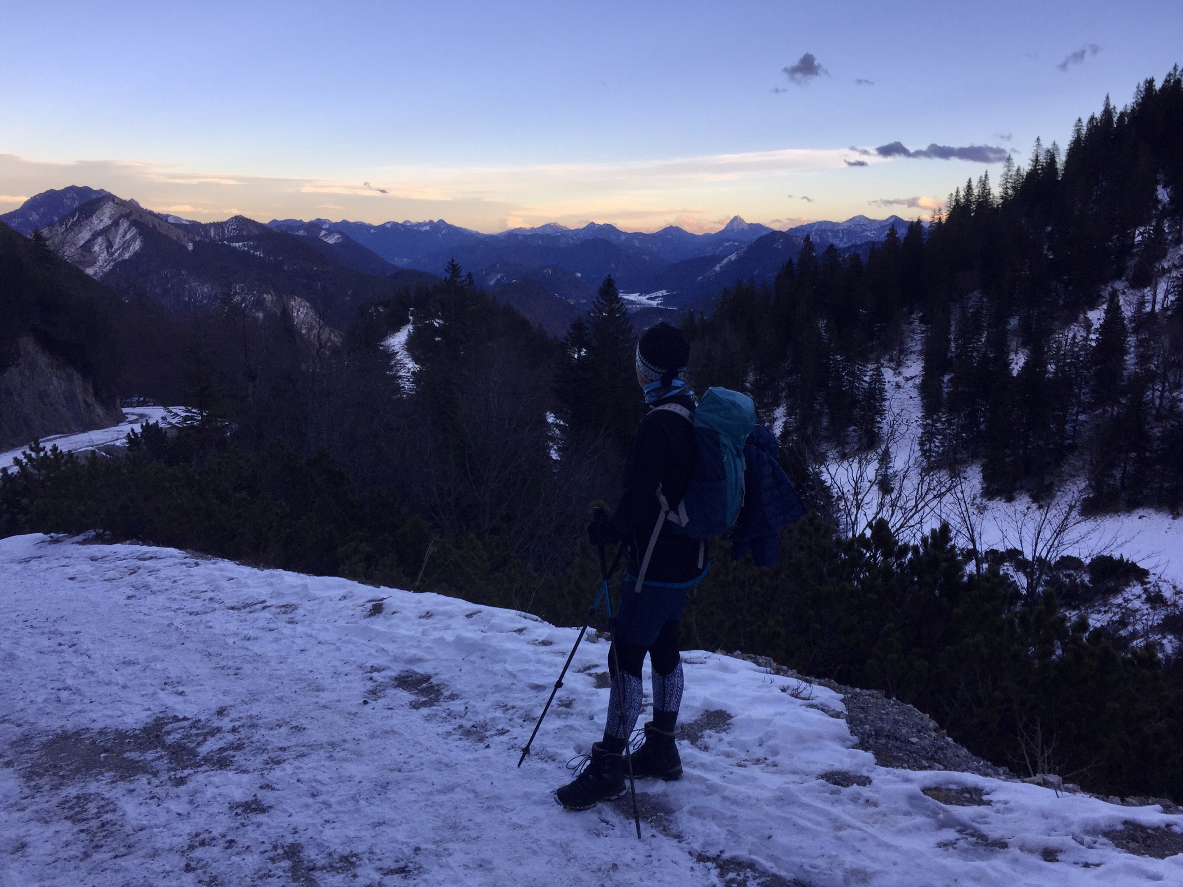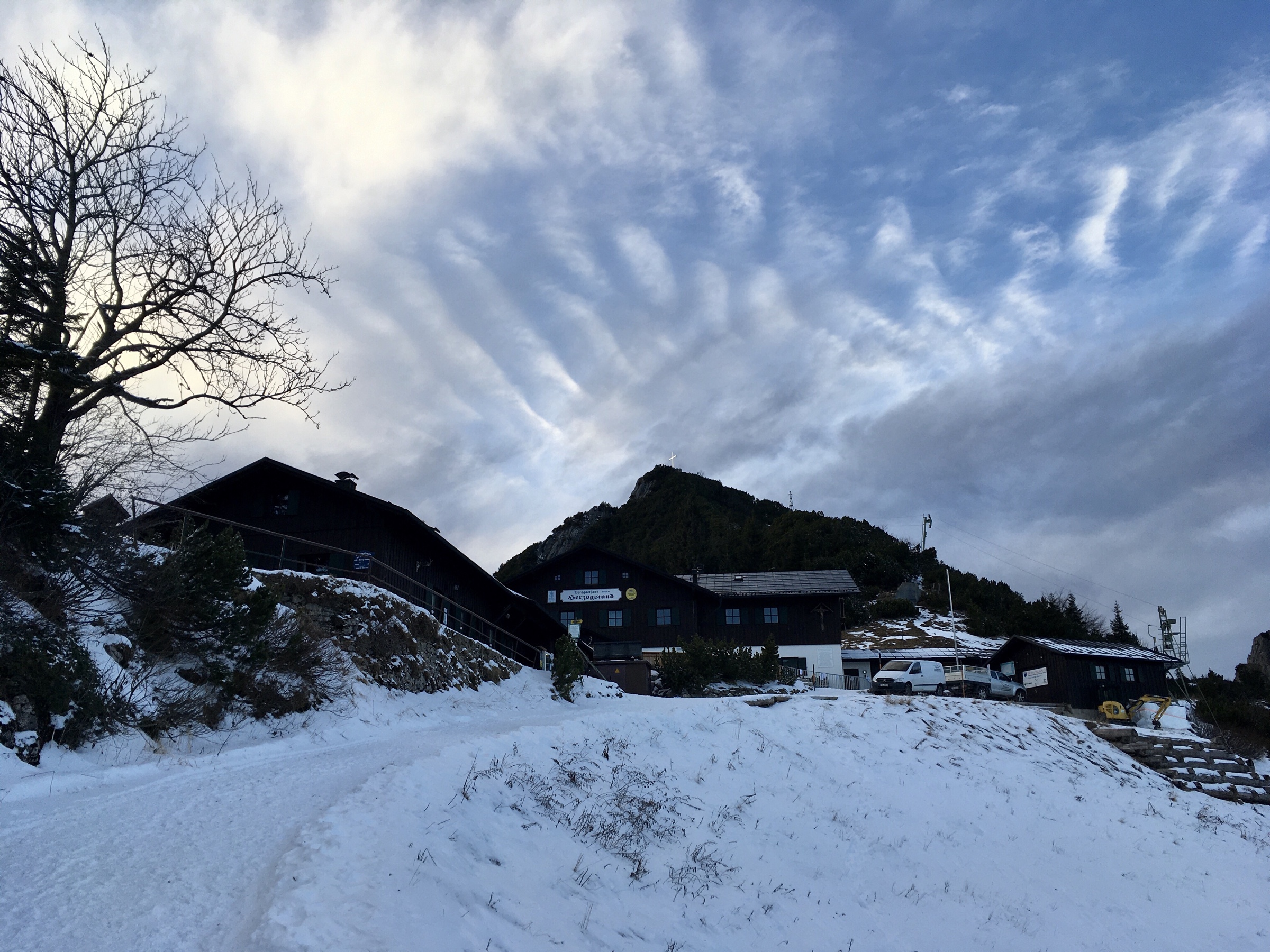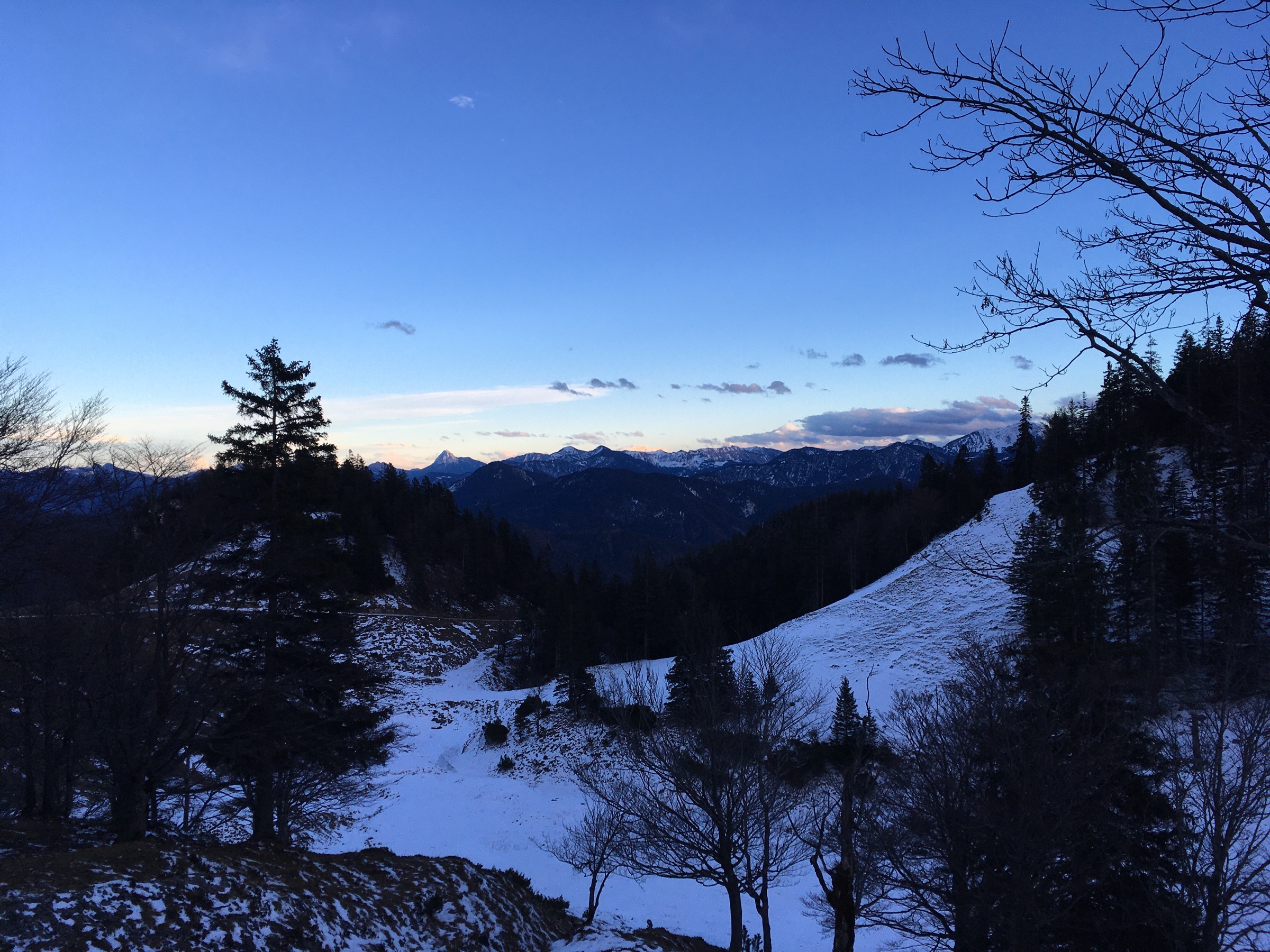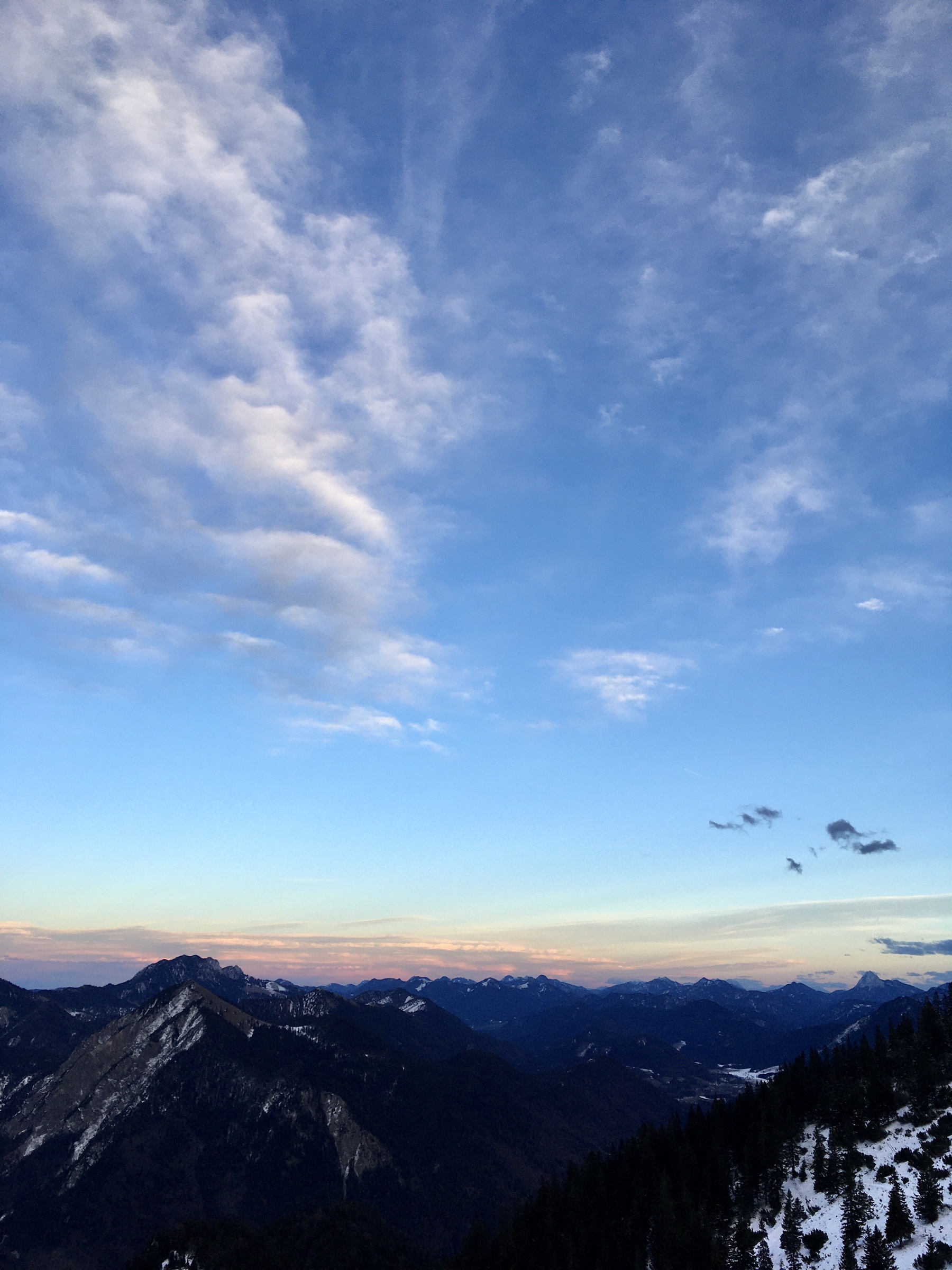 It’s Friday again! And last week the sunset tour was such a fantastic experience, we decide to repeat it. But, this is a working Friday so we’re leaving late and it’s already 14.15 when we set off from Kesselberg towards Herzogstand. Parking is full – and on the way up a lot of people pass us on their way down. Weather is great: sunny, no wind, bit of snow, pleasant warm – a dream. There’s 2 very steep moments but otherwise it’s a nice way up, with pretty views here and there. But, the weather changes quite abruptly: once we get close to Herzogstandhaus, it’s already quite windy. We decide to skip Herzogstand but go to Martinskopf at least – and the wind gets stronger. On the top it’s a little hurricane already and we can forget the sunset views because the sun is hidden behind clouds already. The mountains look spectacular anyway but couple of quick photos and we go back down before we’re blown off 😉 Another quick stop by the Herzogstand for a Glühwein we brought with us and we set off on our way back. And boy, is it windy! Crazy, the sudden blows – defo a different kind of adventure then last week 😉 But, it was great fun anyway! I take a moment to watch the stars as they shine so bright when there’s no city lights and then, after 4h in the great outdoors, we get back home.
