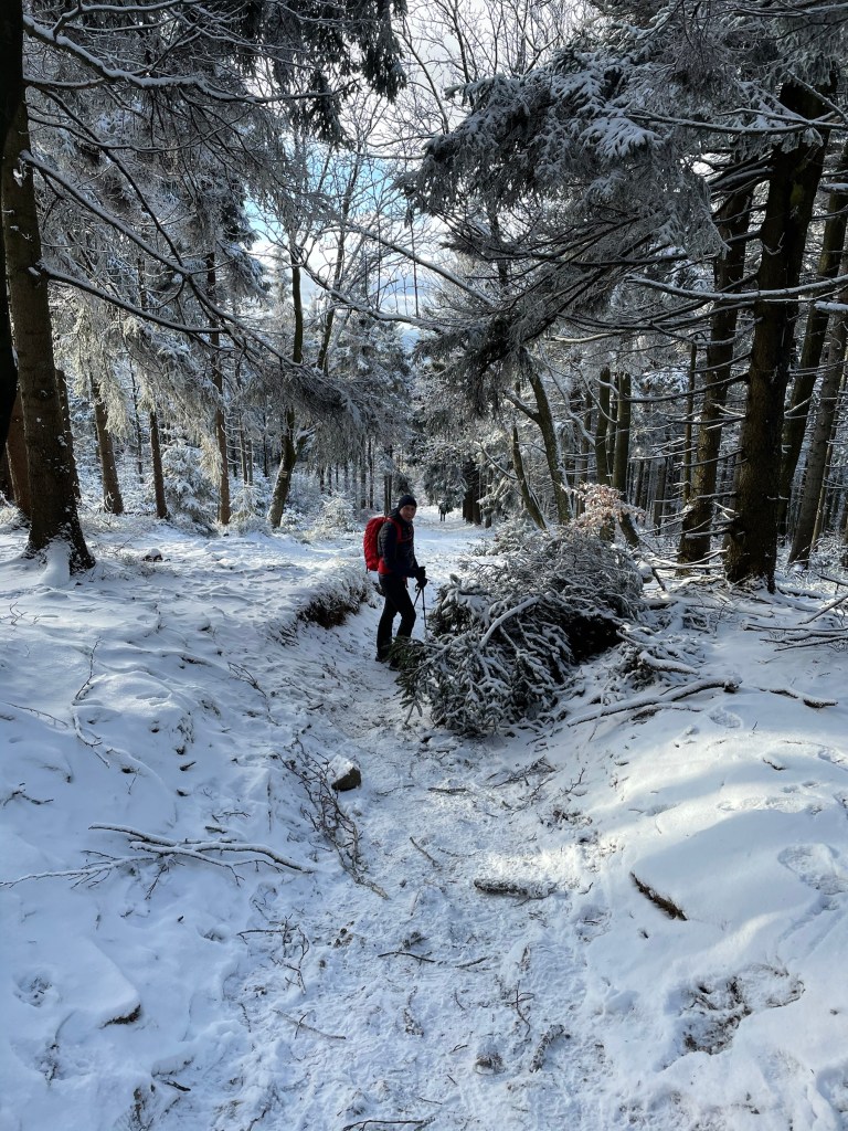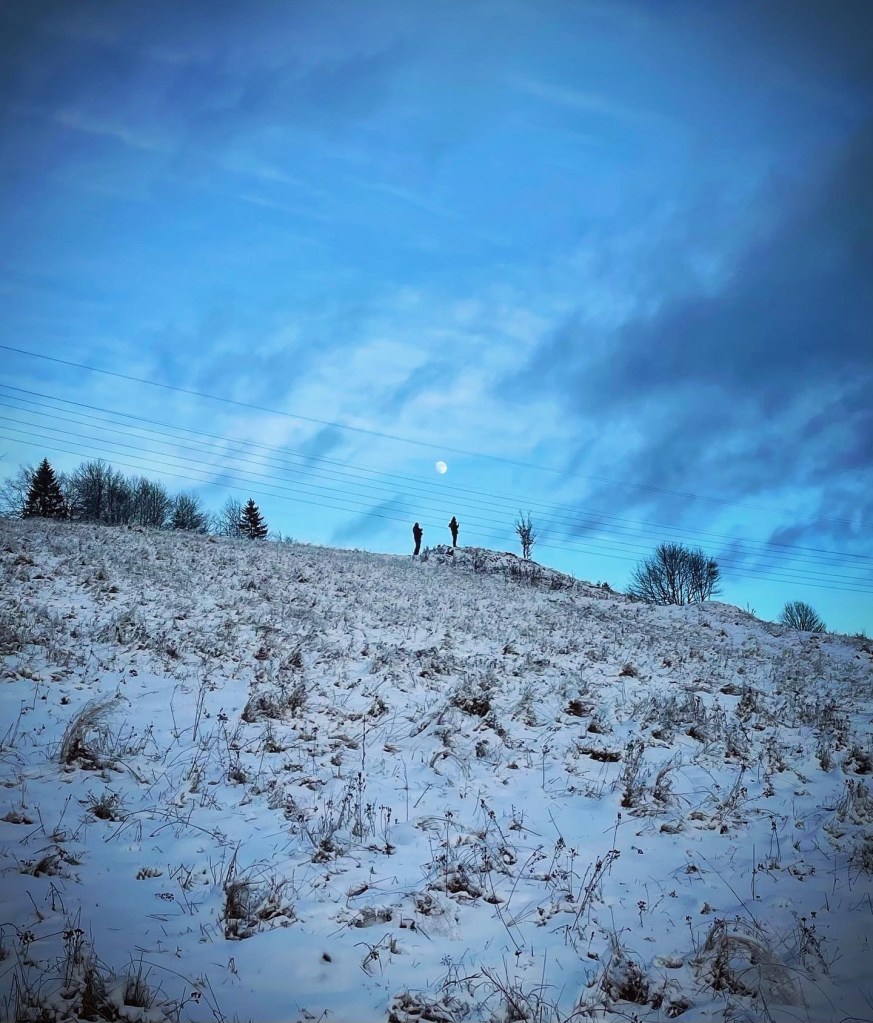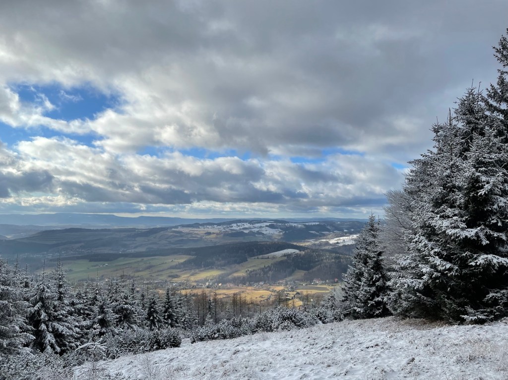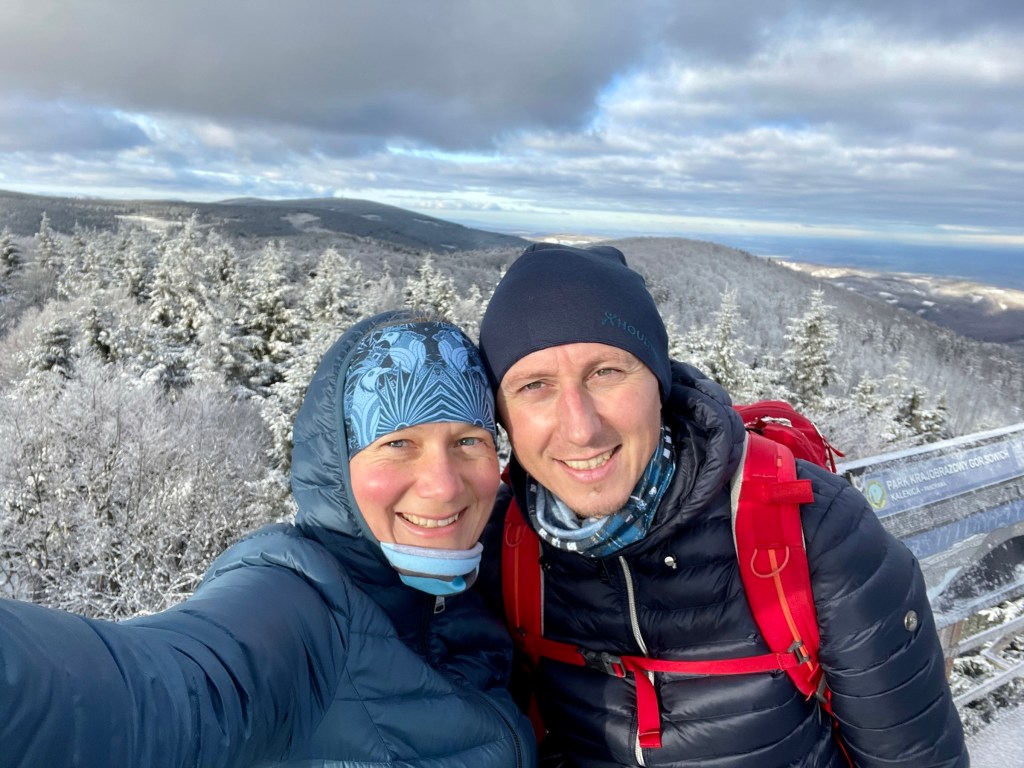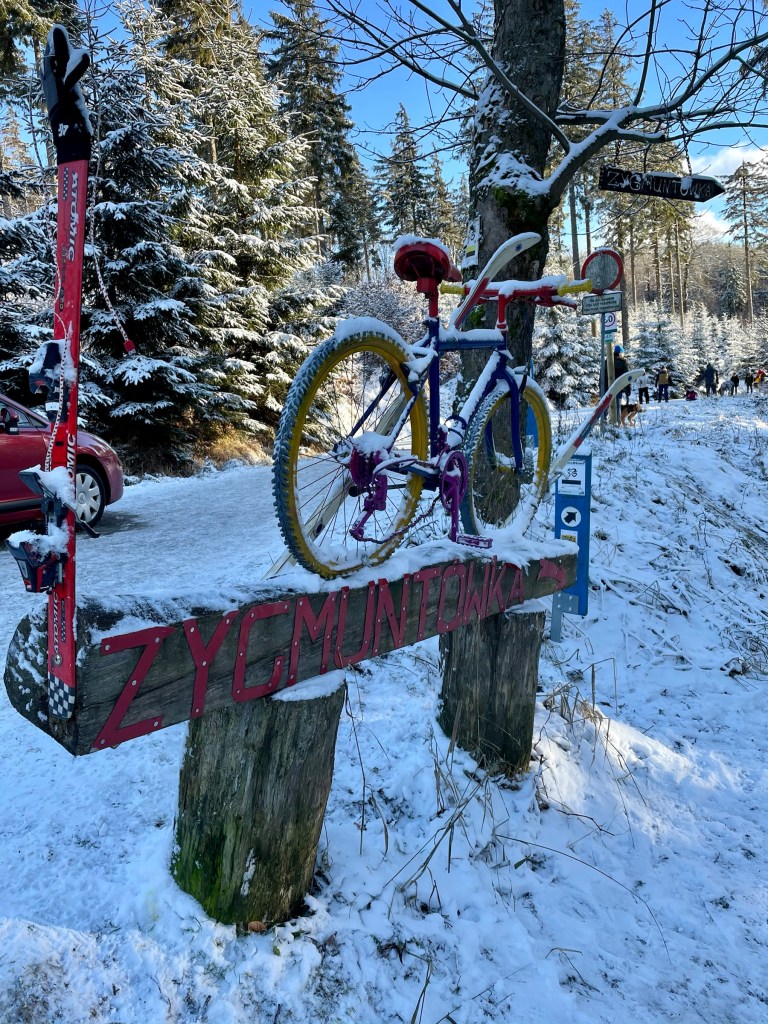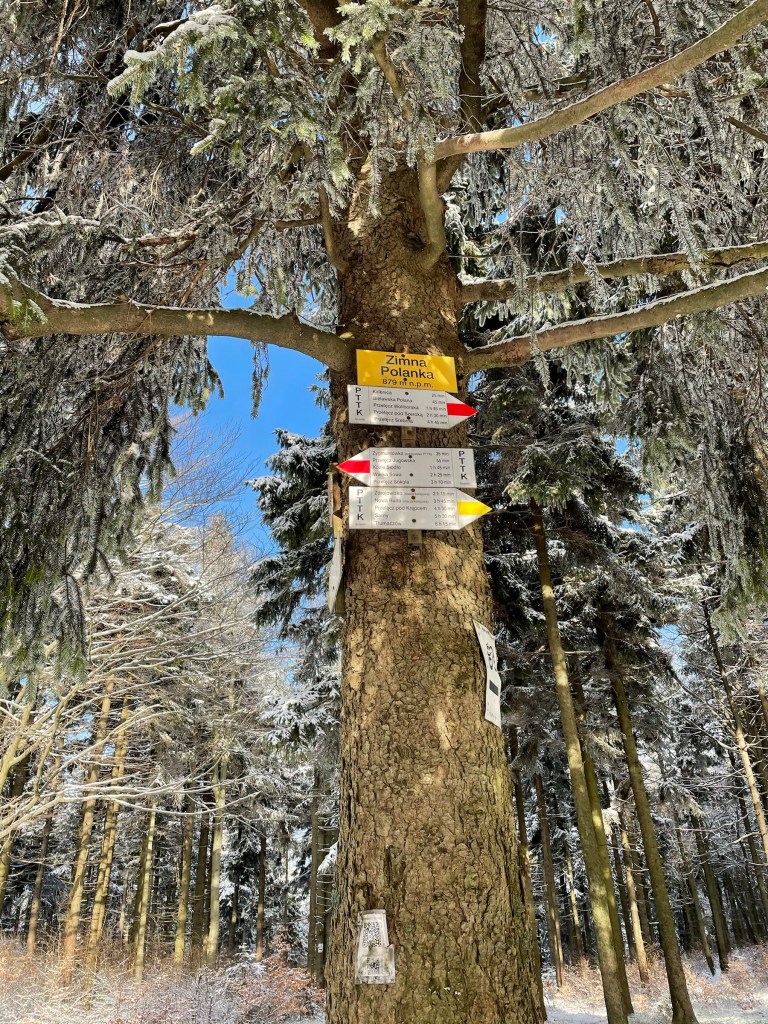 Czas się wreszcie ruszyć w góry, bo wreszcie spadł śnieg! Miała być Kalenica z Leśnego Dworku, ale M chciał uniknąć przewyższenia, po wczorajszych biegach przełajowych, więc Tata podpowiedział bardzo fajną pętlę z Jugowskiej (a ja łasa na pętelki!). Wyruszyliśmy z przełęczy po godz.10 i wtedy jeszcze nie było problemu z parkingiem – na powrocie po 14, sprawa wyglądała już zupełnie inaczej: pełne oblężenie! Rzeczka jeszcze gorzej. Ale, jak zwykle wybiegam za bardzo do przodu, zatem wracając do clue programu: trasa przez Rymarz i cudownie nieuczęszczaną Drogą Husarską na Żmij i Kalenicę, super 💙 Bardzo ładny szlak, z widokami na Szczeliniec i Śnieżkę nawet oraz podobnież SkyTowera – tego jednak nie zdołaliśmy dostrzec, bo trzeba było zmykać z Kalenicowej wieży przed wrzaskunami. Powrót nieużytkiem będącym niegdyś stokiem Rymarza przez pięknie zadbaną i użytkowaną Zygmuntowkę, aż miło spojrzeć! Świetne miejsce się zrobiło. Cichaczem zjedliśmy naszą wałóweczkę, pod czujnym okiem goprowskiej kamery 😉 I myk do auta, a stamtąd do Rzeczki na spotkanie z resztą rodzinki. Piękna świąteczna sobotka!