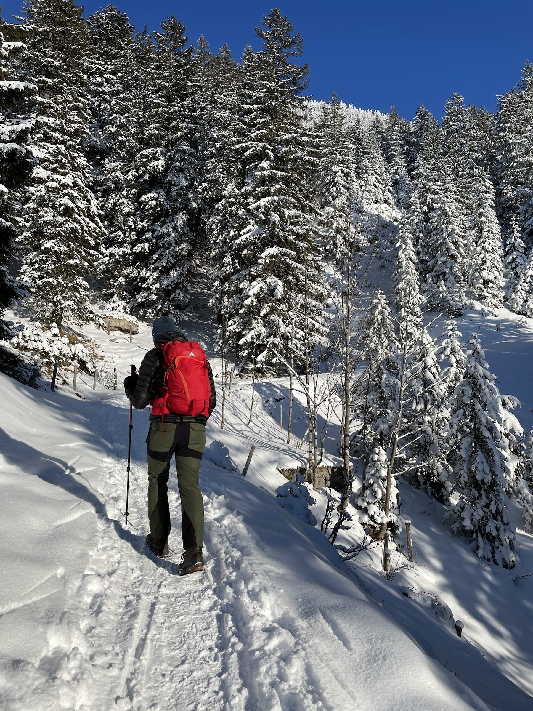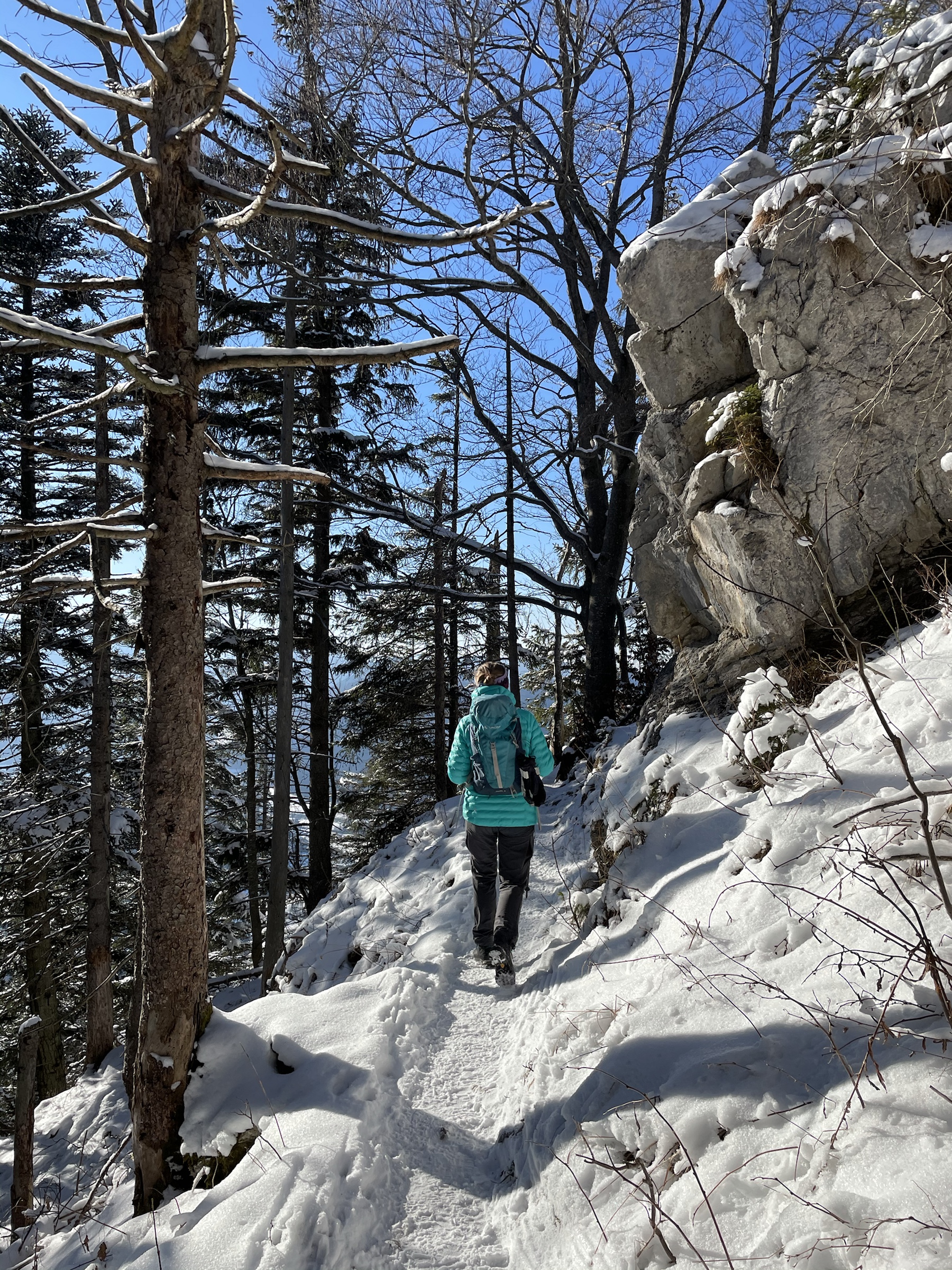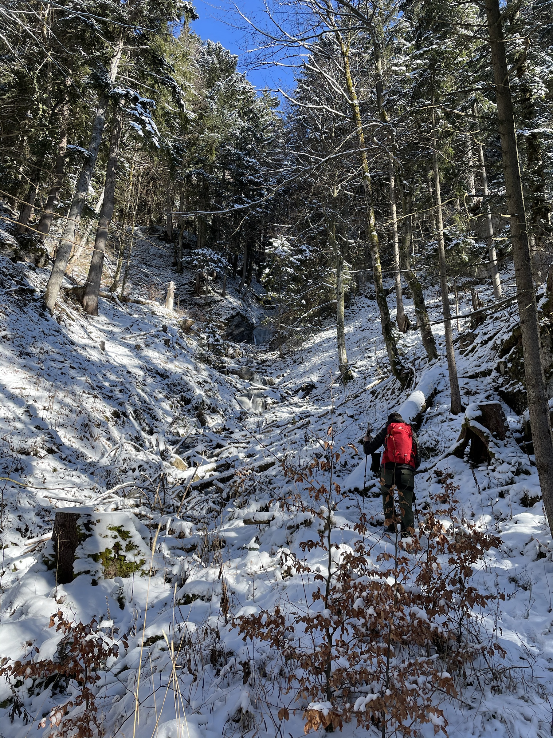 Co się nie udało wczoraj, to udało się dziś – i to z nawiązką! Miała być leniwa sobota, ale pogoda jak żyleta, jak tu się lenić! Zatem, rano usmażyliśmy furę naleśników, długie śniadanie zaliczone, więc można lecieć w góry. Koło g.13 ruszyliśmy z parkingu w Birkenstein w stronę Breitenstein – nie byłam pewna czy pójdziemy tam, czy na Schweinsberg. Chwilę po starcie skusiła nas niby ślepa uliczka na wodospad – na czeskich mapach ścieżka jest, ale raczej nie w zimie – skończyło się iściem na szagę po zwierzęcych śladach, przez zamarznięty wodospad, aż znowu doszliśmy do drogi, która jest też torem saneczkowym – bardzo lubię takie detoury 😉