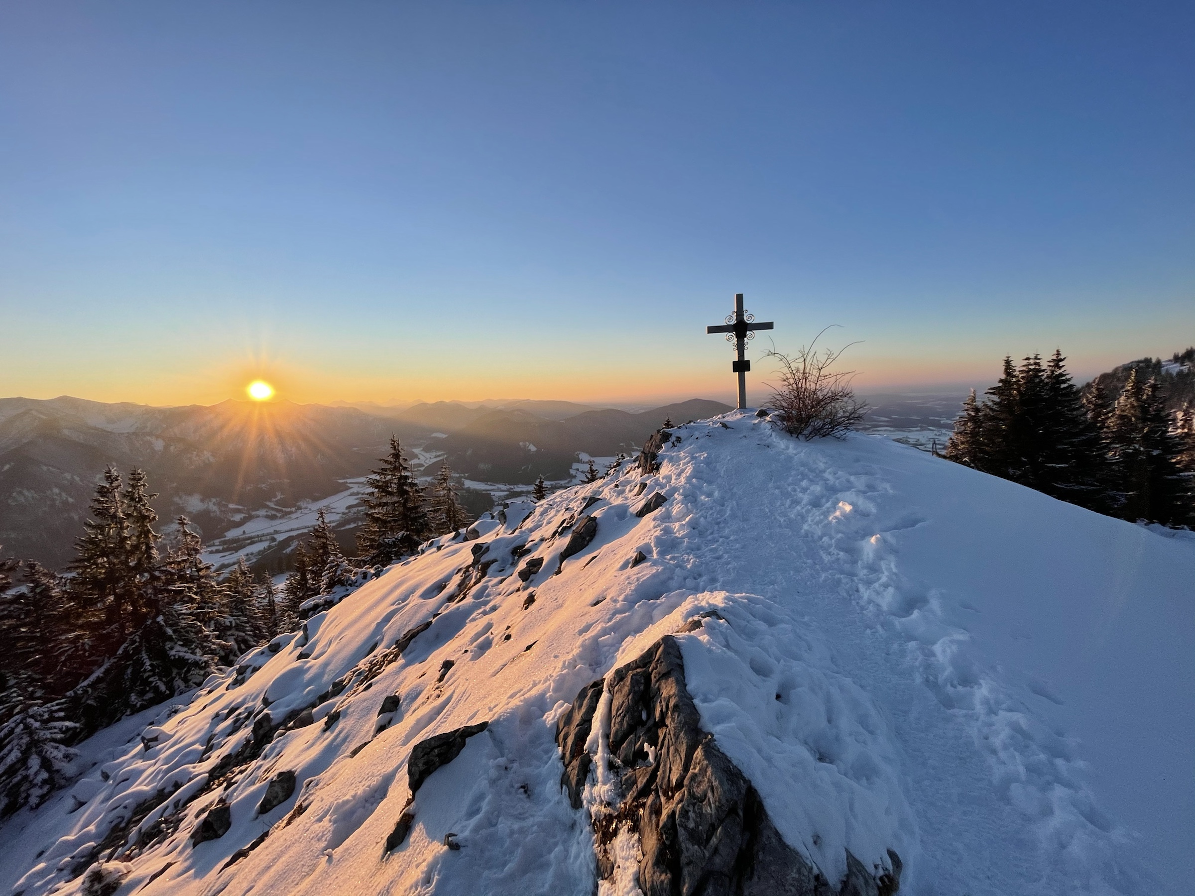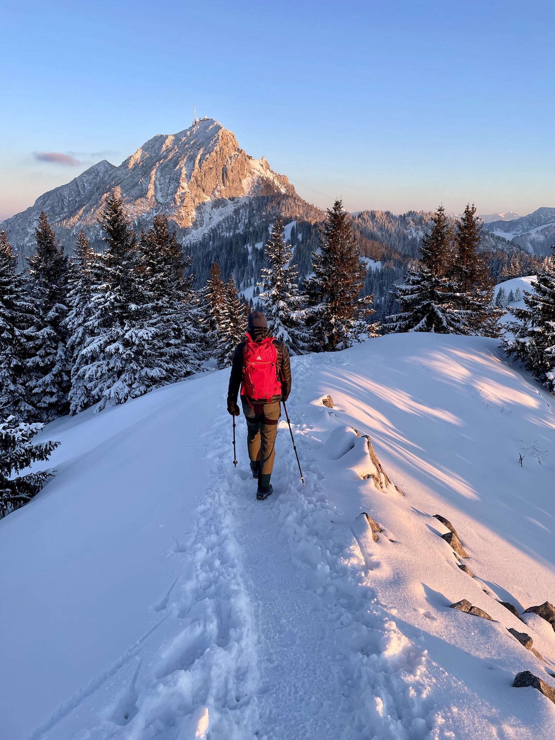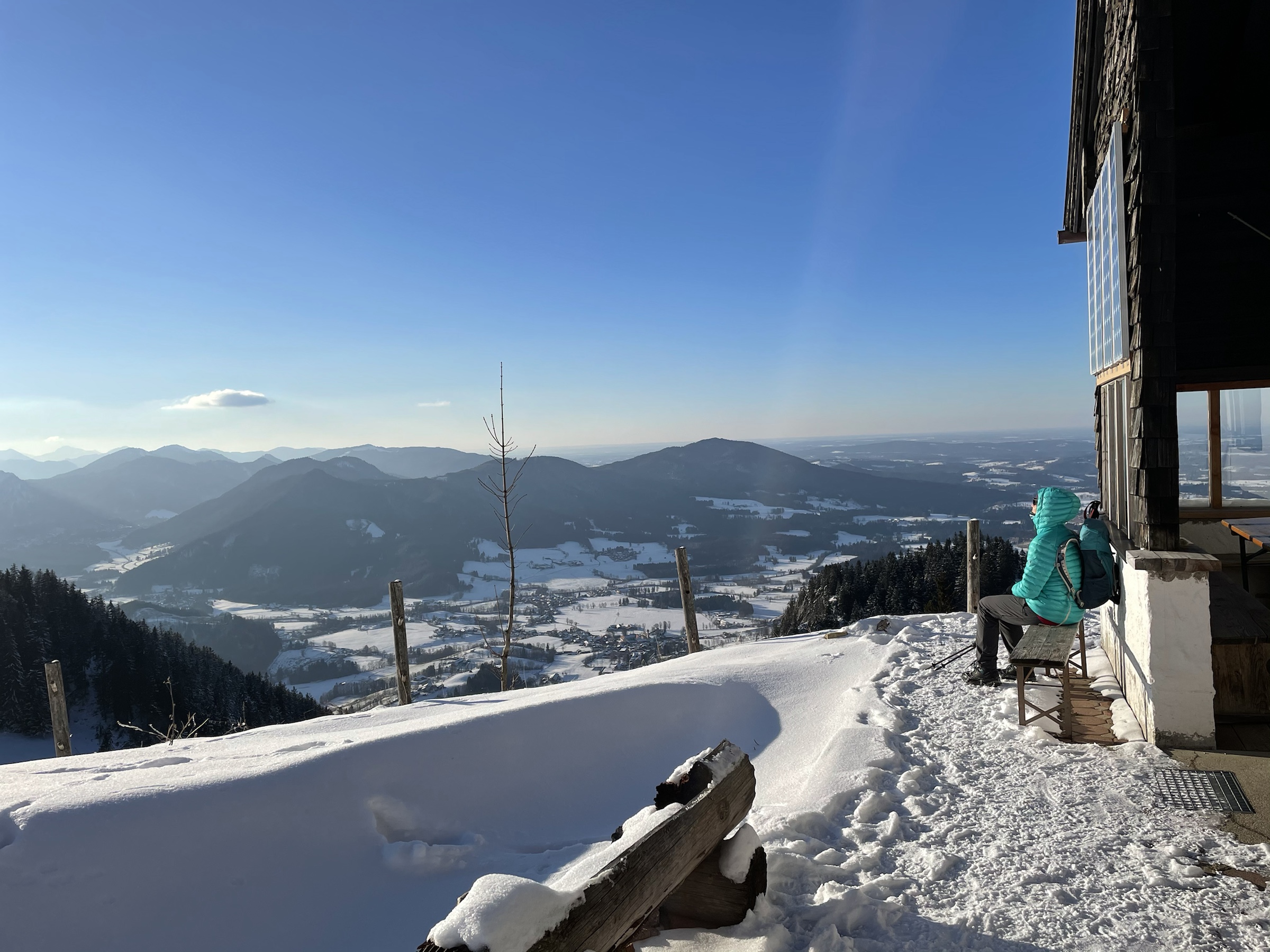Przy Kesselalm odbiliśmy zerknąć na małą kapliczkę z widokiem – uroczo bardzo. I potem dalej, aż do skrzyżowania, gdzie krzyżują się szlaki na Breitenstein, Wendelstein i Schweinsberg – chciałam podejść na świńską górkę od strony Wendelsteina właśnie, ale wiało tak okrutnie przeszywającym zimnem, że cofnęliśmy się do szlaku i poszliśmy przez Kotalm – spędzając dłuższą chwilę na tarasie tej uroczej huty: codzienne widoki na zachód słońca z własnego salonu, bezcenne! Z huty już tylko 40min na szczyt, poszło rachu ciachu i radocha, gdyż na szczycie nikogo poza nami i jak się zejdzie 2 kroki niżej, to nie wieje! Tyle wygrać 😍 Urocze przed-walentynki ❤️