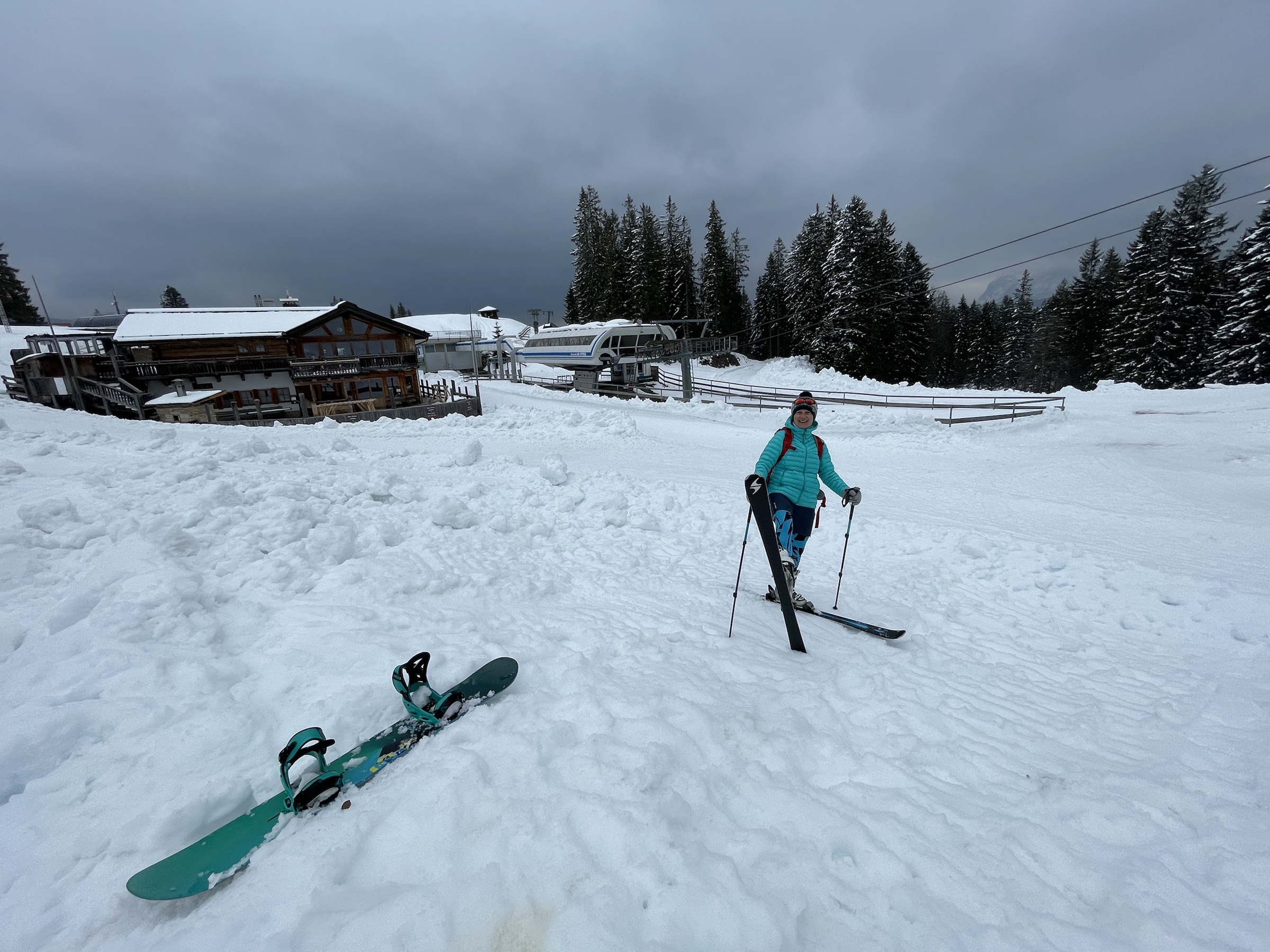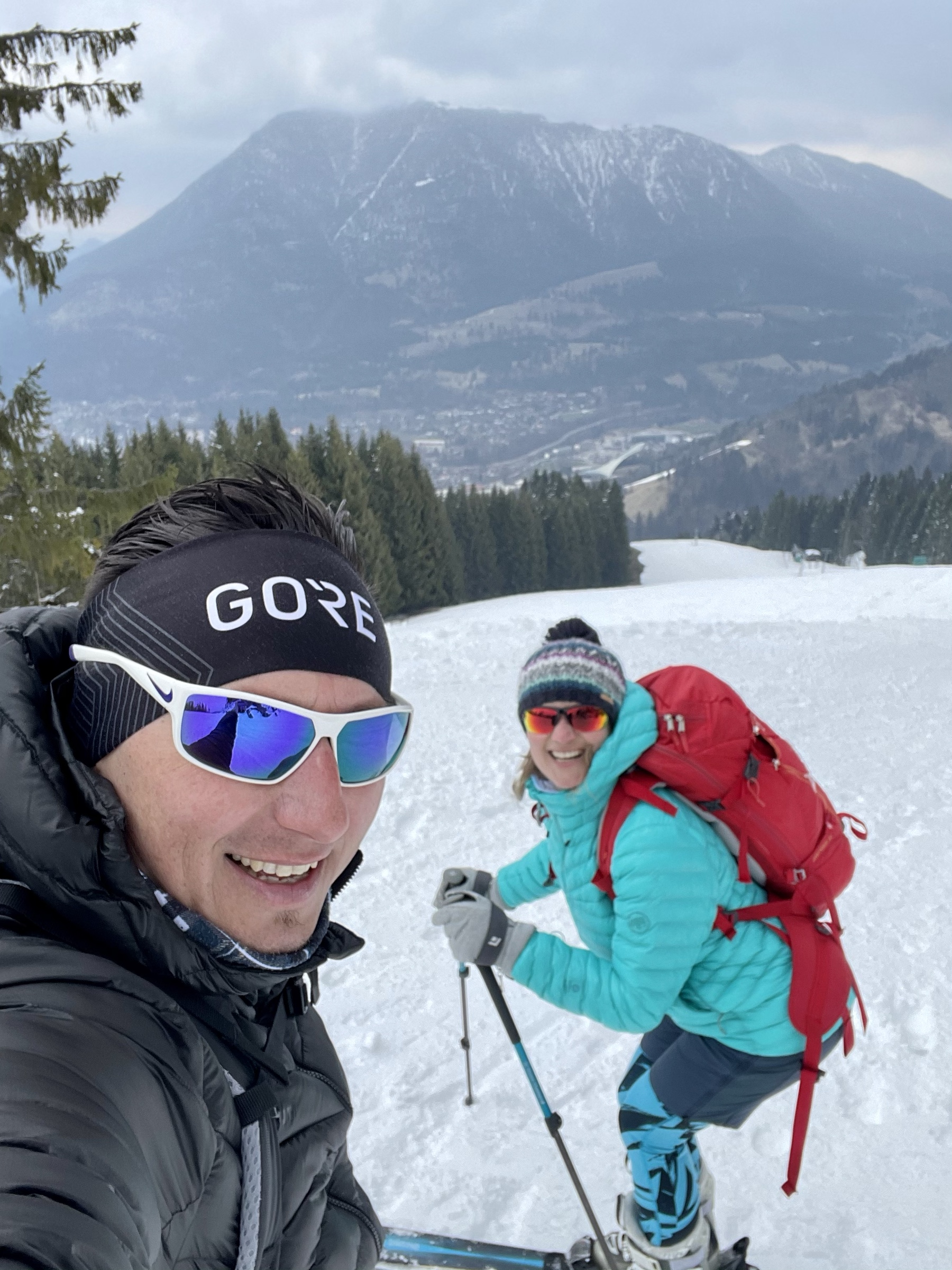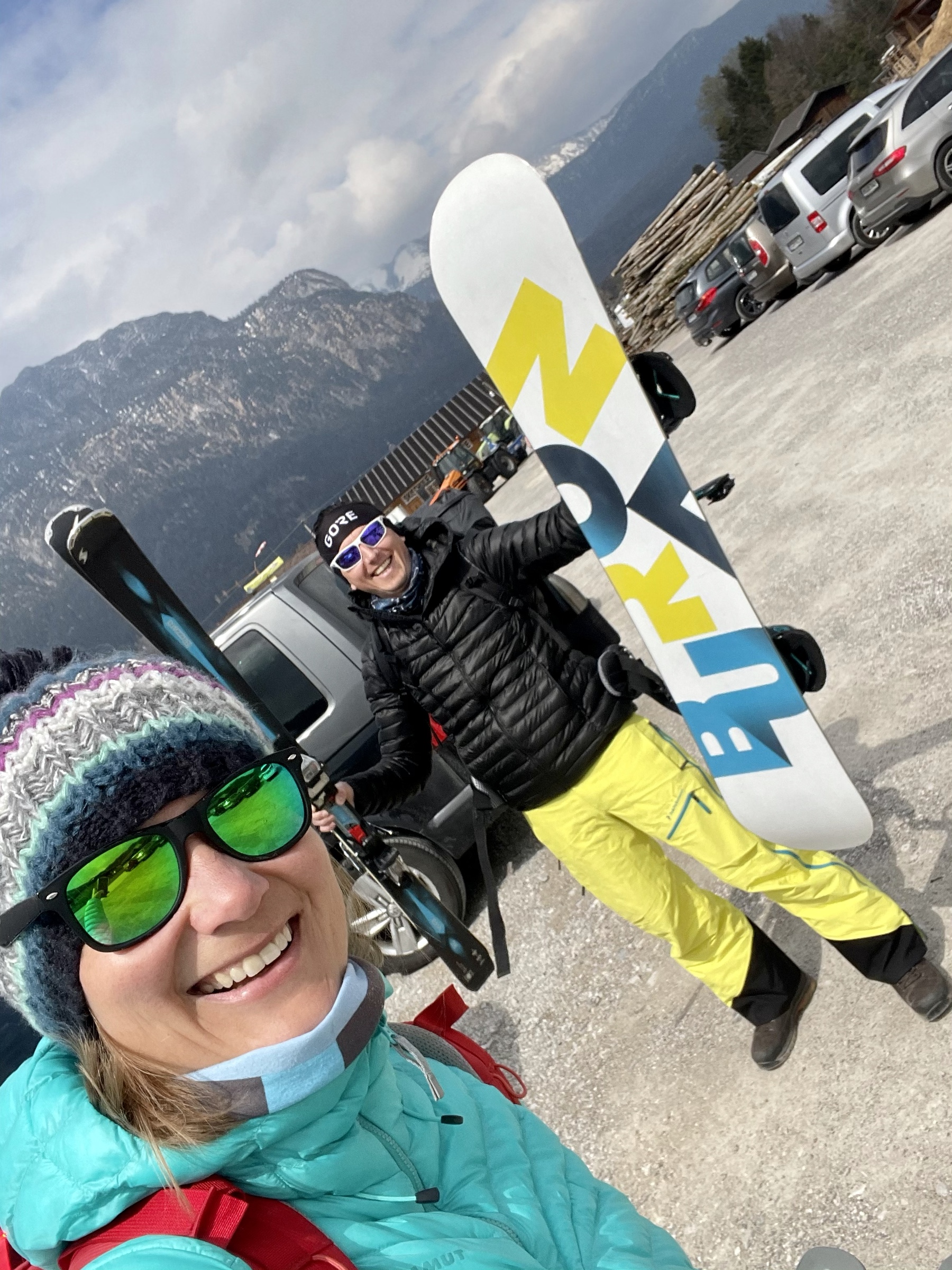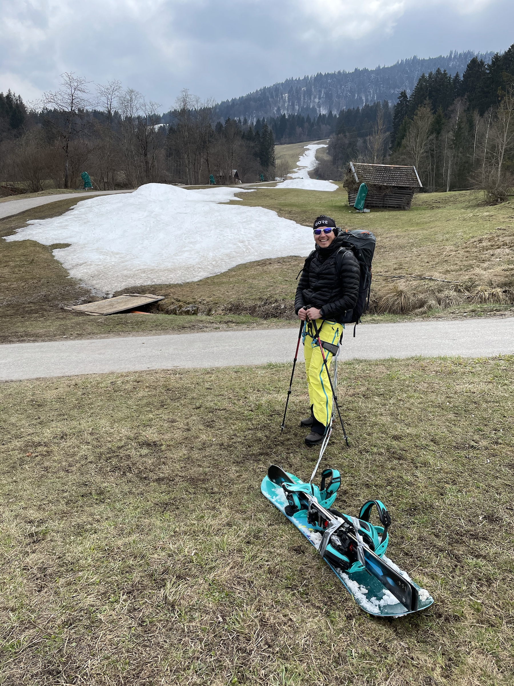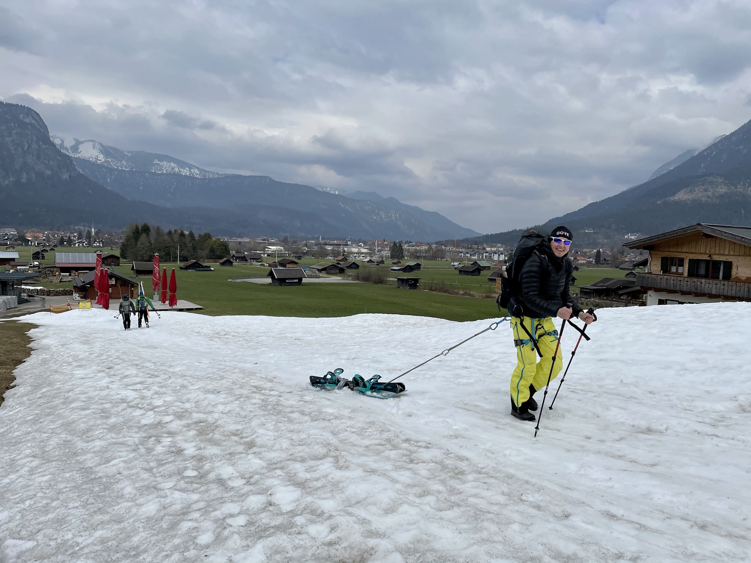 We were supposed to go hiking but there was still so much snow here that we thought: let’s go skiing! All lifts are closed and we don’t have proper skitour equipment but we hiked up, Marcin pulling my skis on top of his snowboard – it worked! Weather did not exactly cooperate (got cloudy so we missed the top views) but most importantly, there was still enough snow left so we could ski all the way down to the parking! Skiing in Germany mid of April – made possible! 😎