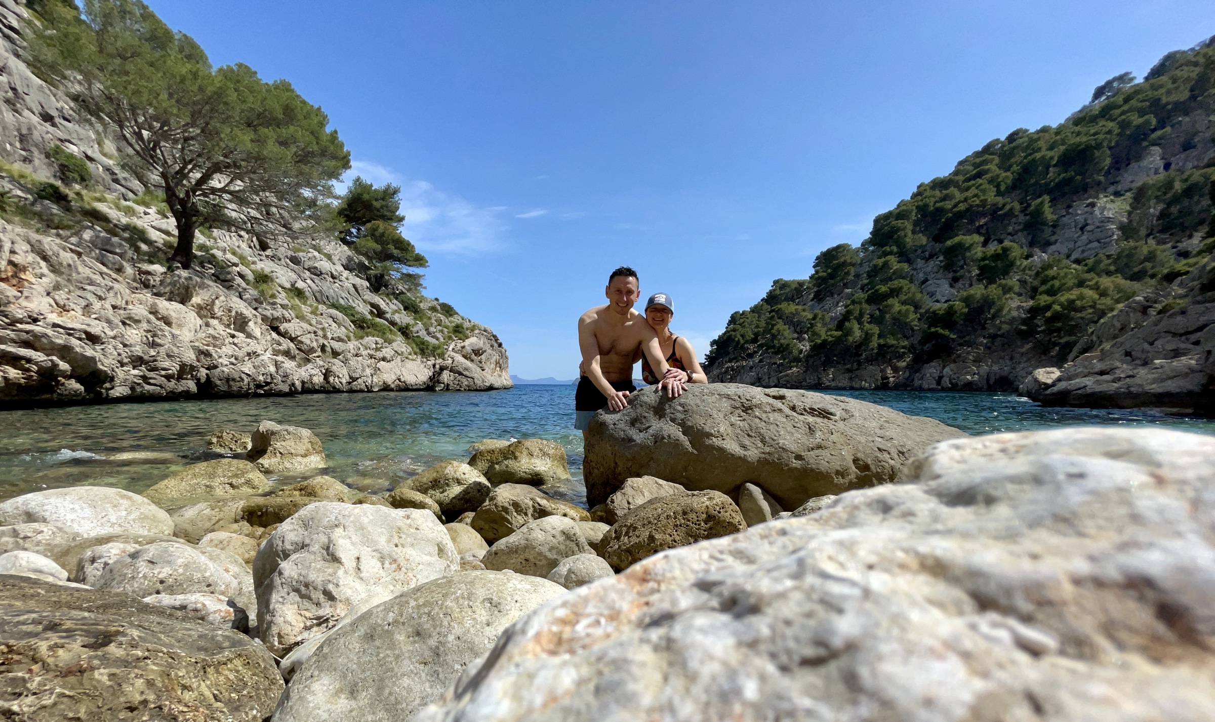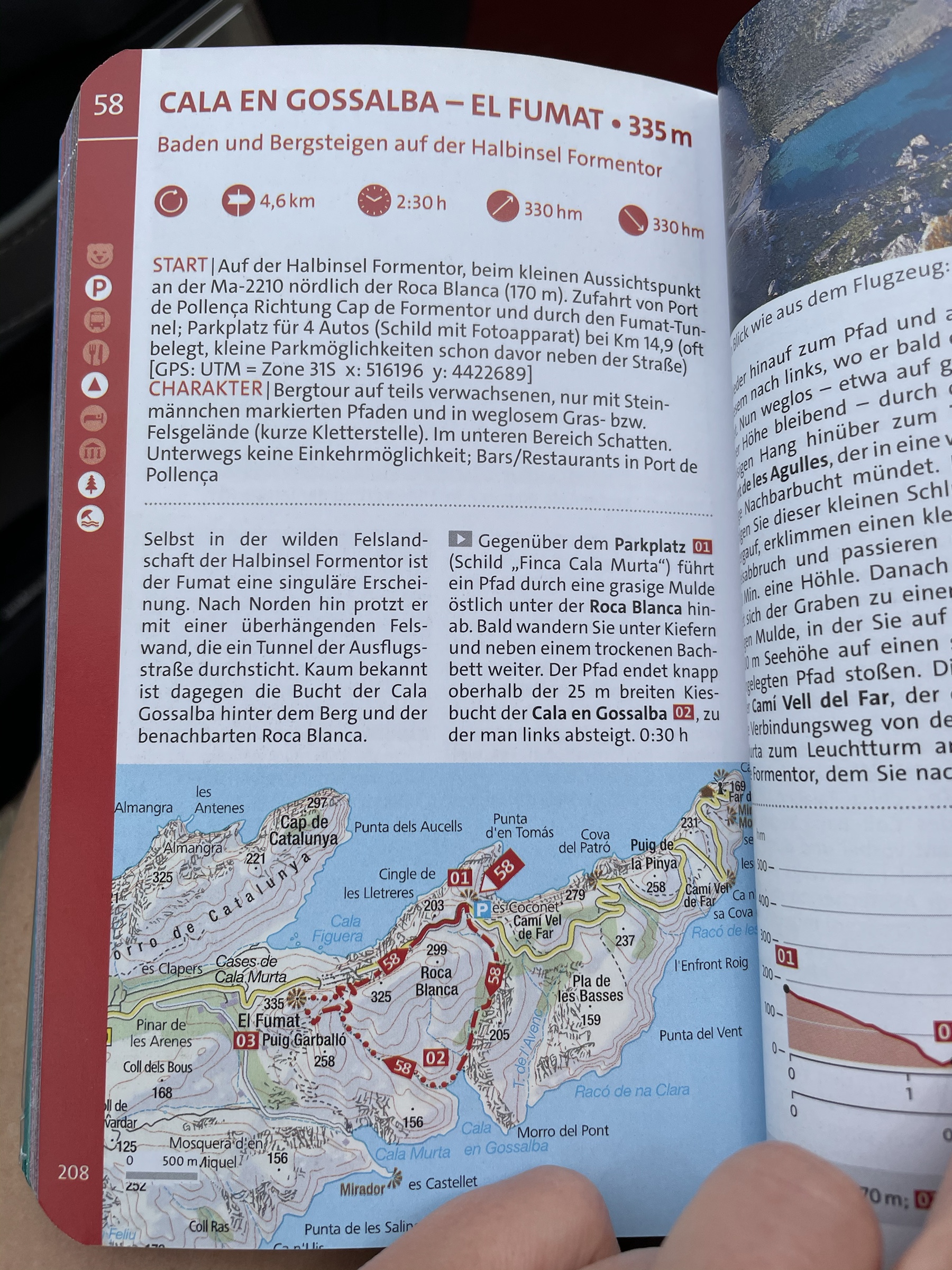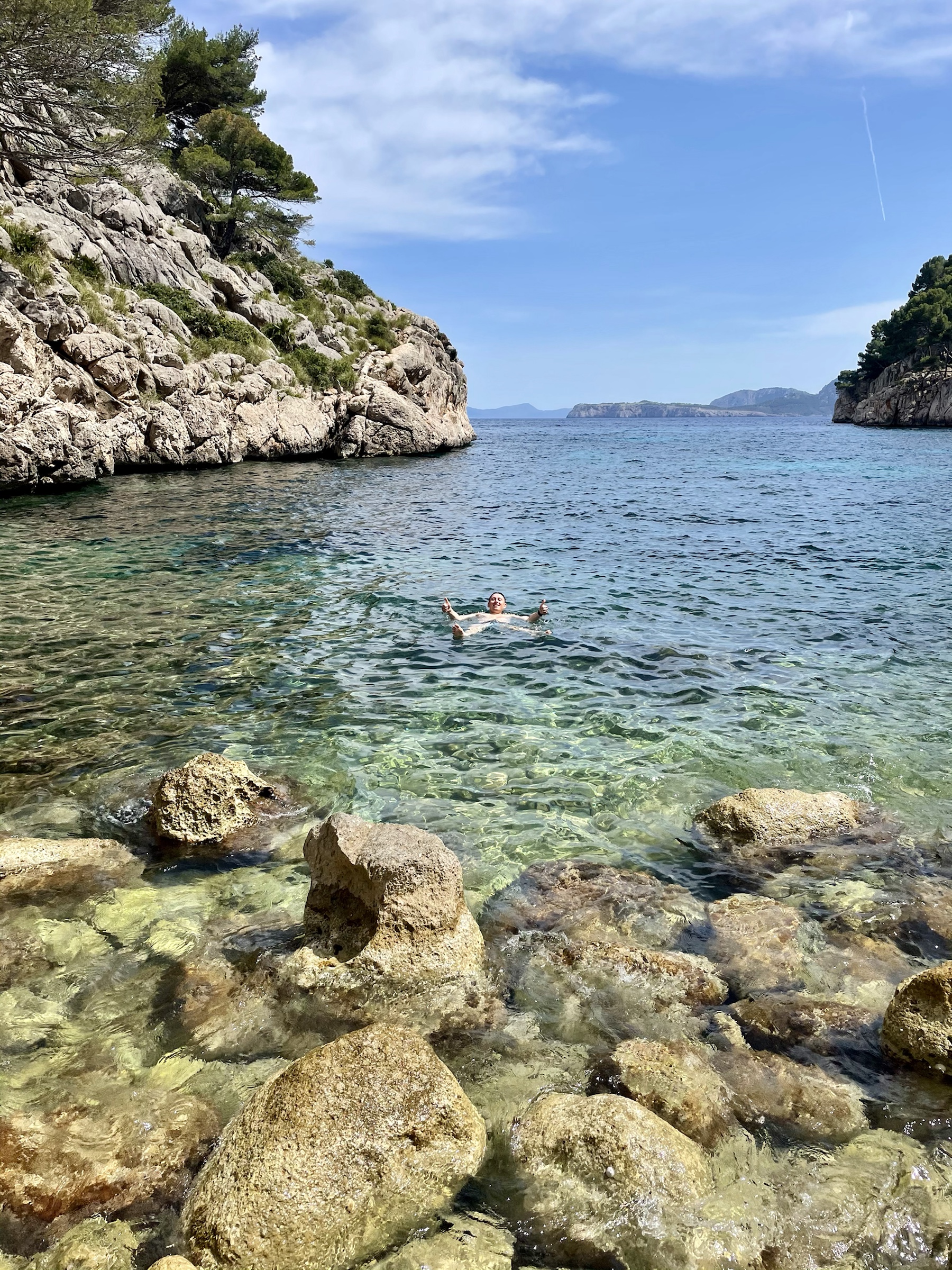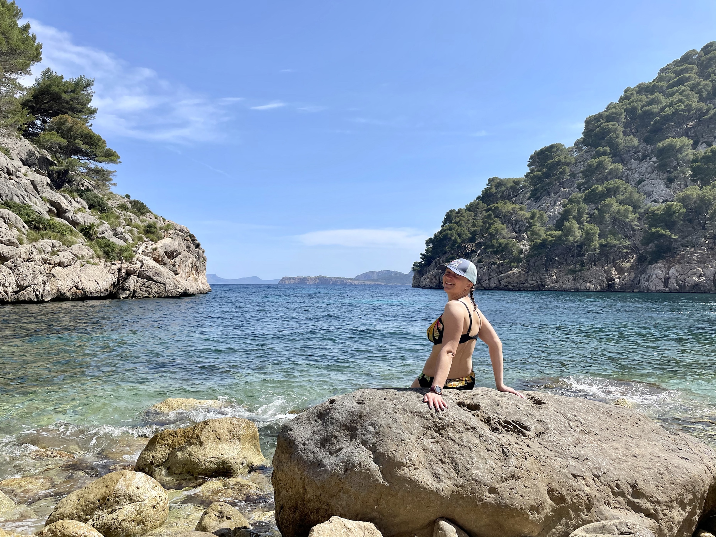 Pojechaliśmy na Półwysep Formentor, wąską drogą najpierw do latarni, a potem z powrotem, coby znaleźć miejsce parkingowe – a to graniczy z cudem… Ale, wreszcie ruszyliśmy, najpierw na El Fumat, po drodze piękne widoki na mega niebieską Cala Figuera! I w dół, przez murki, a potem ledwie widoczną ścieżynką przez wysokie trawy – wygląda na to, że kleszczy brak! Suchym wąwozem/korytem rzeki docieramy wreszcie do morza – mini zatoczka, jak marzenie, ale wspinamy się jeszcze kawałek dalej, do właściwej zatoczki czyli Cala en Gossalba. Rozsiadamy się na chwilę na ciepłych kamorach, ale zaraz myk do do wody! Jery, ale cudownie 💙 Uczucie wręcz nierealne, te kolory, zapachy, coś pięknego! Cykamy wspólną fotkę na samowyzwalaczu, rozkładamy nasz prowiant i po obiedzie zwijamy manatki – pojawili się kolejni goście. Droga w górę, jest łatwiejsza niż w dół: ścieżynką przez trawy i wychodzimy na drogę i punkt widokowy na latarnię; jeszcze kawałek i jesteśmy przy aucie, 6km z hakiem. Ilość spotkanych ludzi po drodze: <10; ilość spotkanych kóz: zdecydowanie >10!