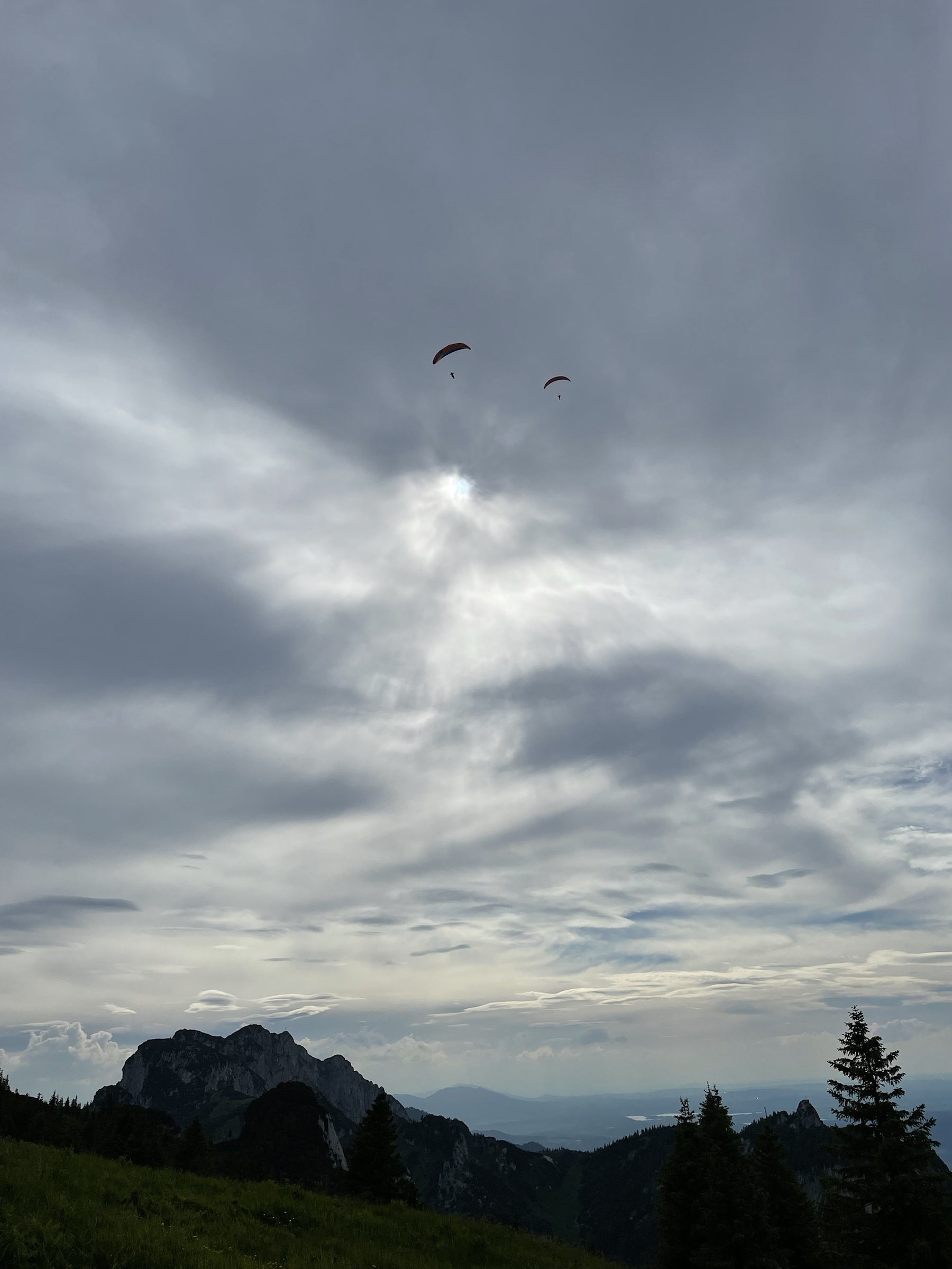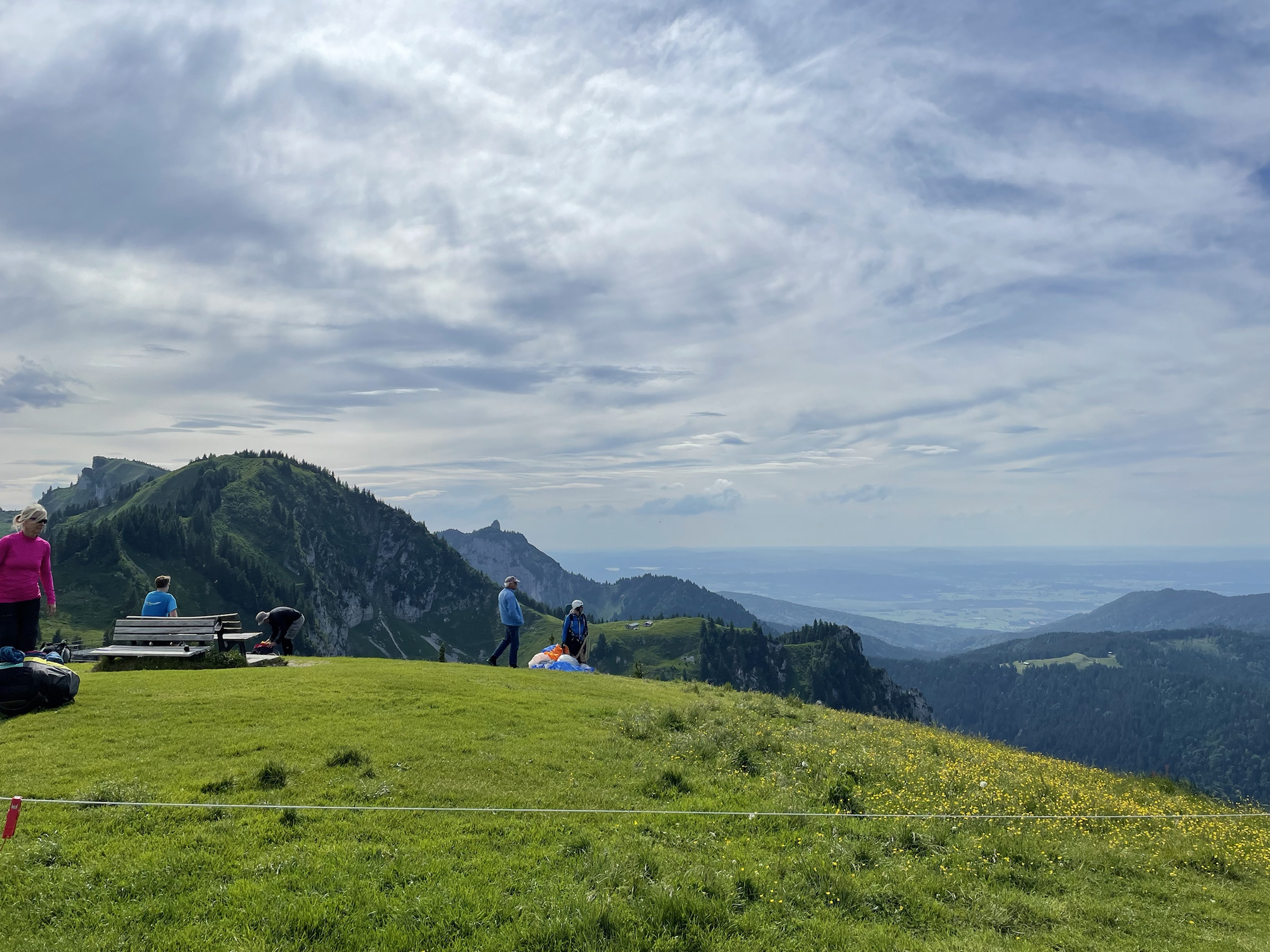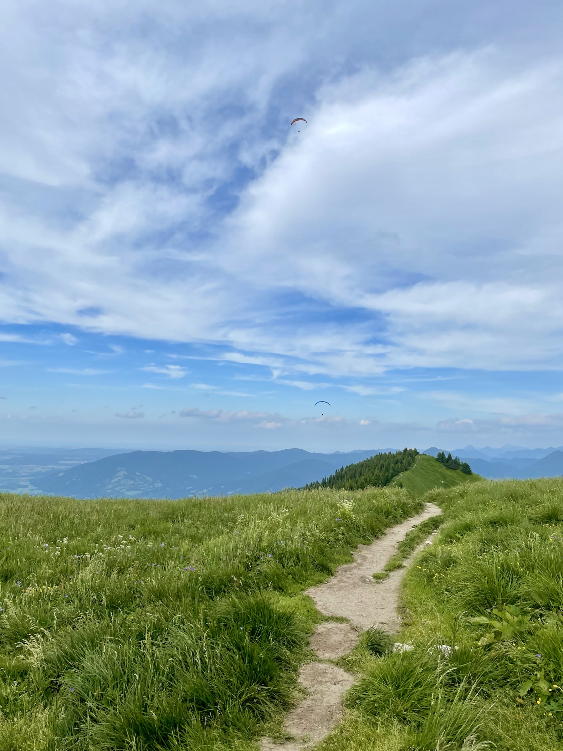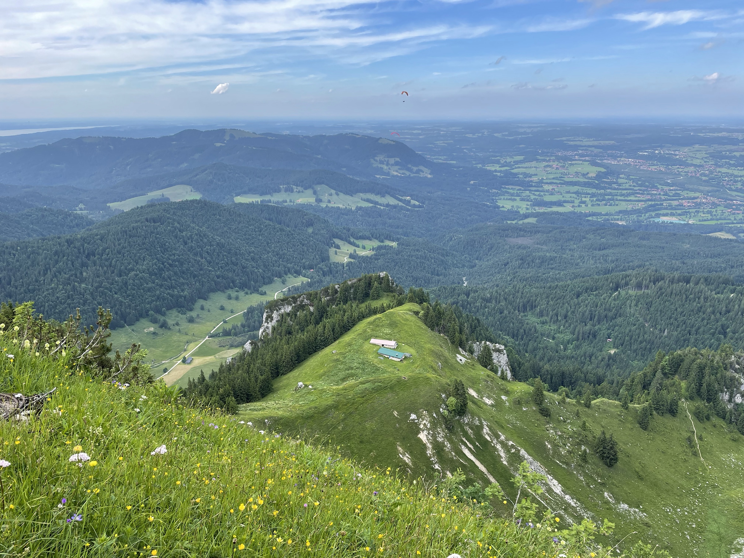 Robimy Große Höhenweg czyli idziemy na Latschenkopf i stamtąd będziemy zawijać na dół. Trochę się chmurzy, ale i tak jest pięknie: cudownie kolorowe i pachnące łąki, rześki wiaterek i widoki na Karwendel -oraz paralotniarze, których tu pełno