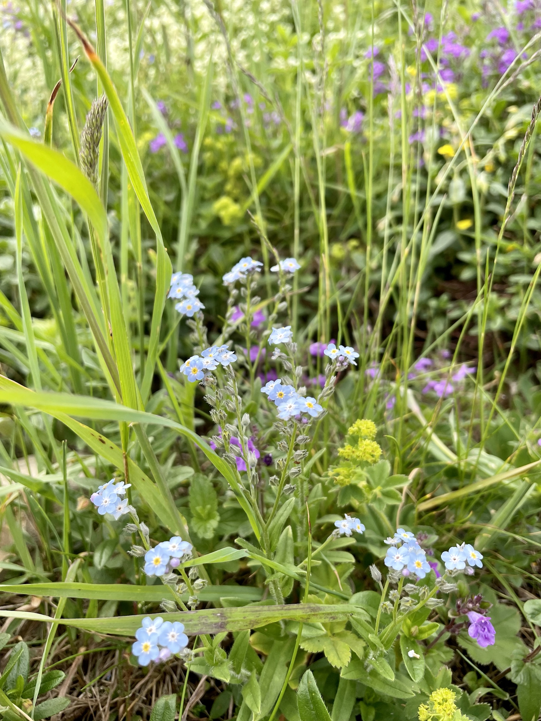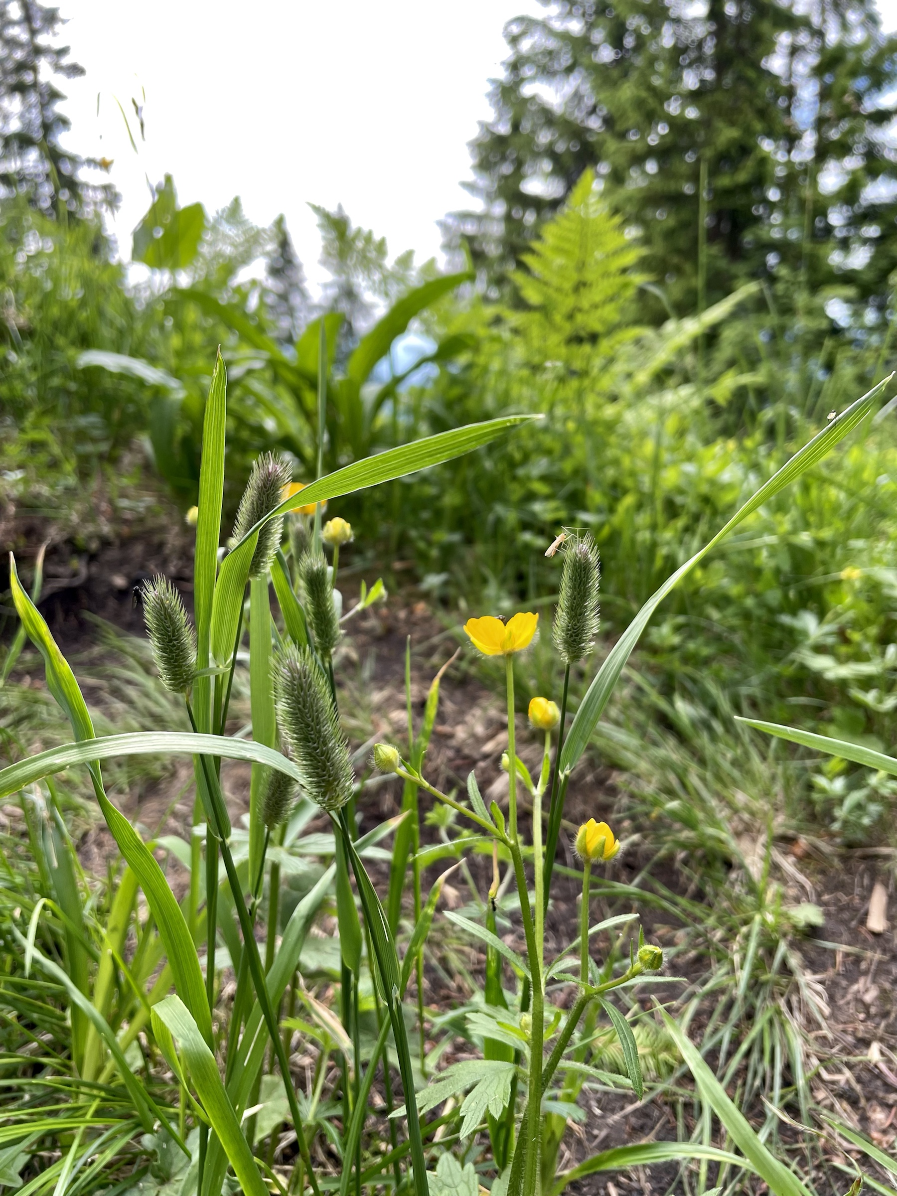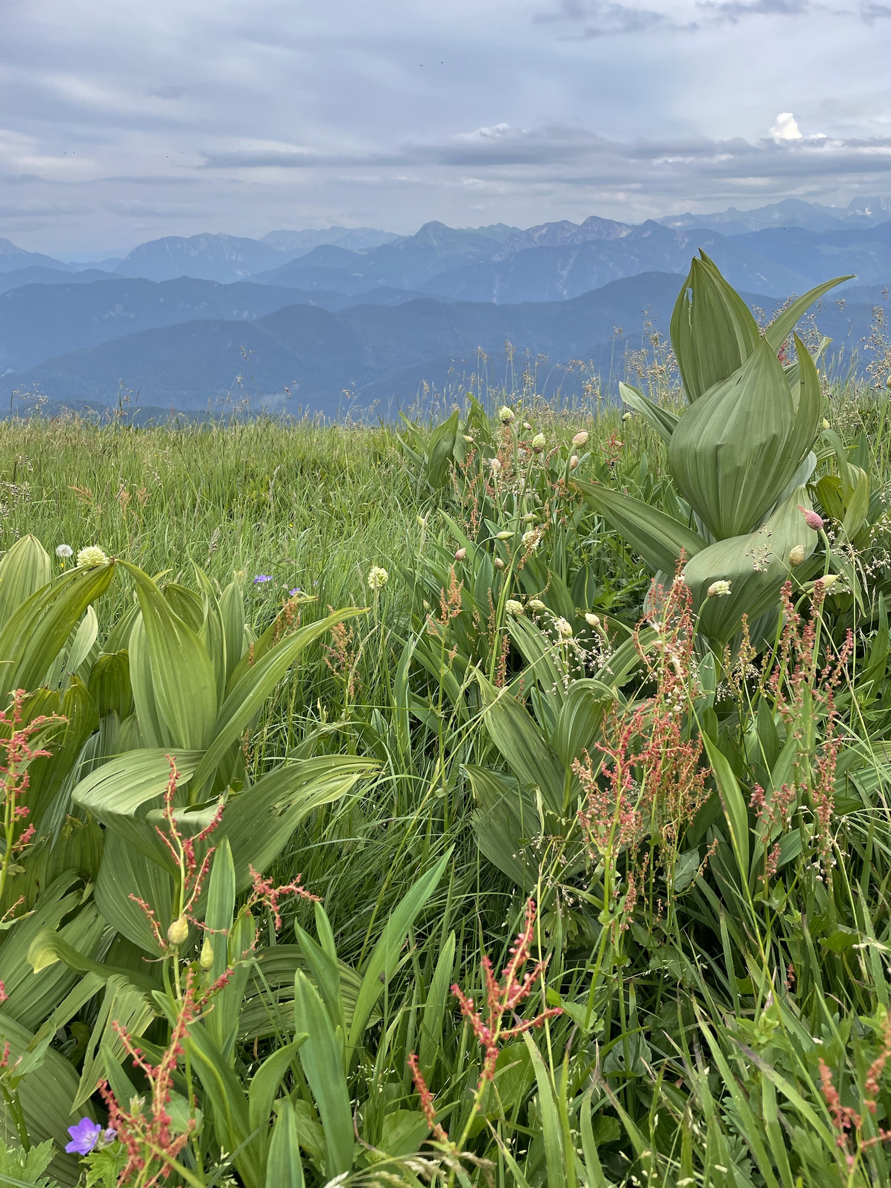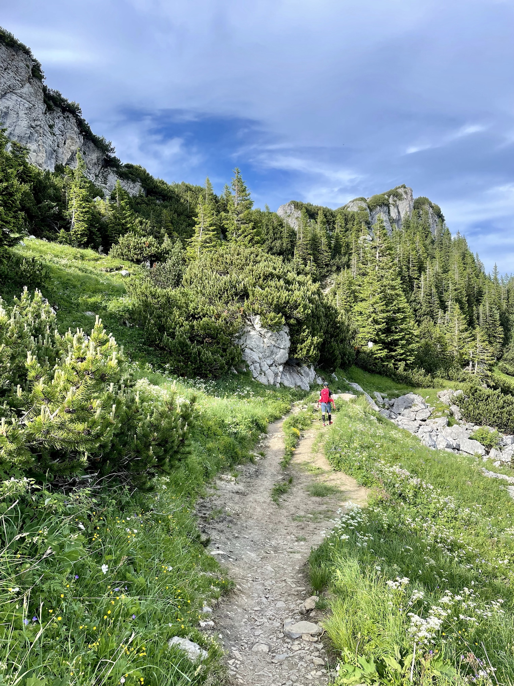 Robimy Große Höhenweg czyli idziemy na Latschenkopf i stamtąd będziemy zawijać na dół. Trochę się chmurzy, ale i tak jest pięknie: cudownie kolorowe i pachnące łąki, rześki wiaterek i widoki na Karwendel -oraz paralotniarze, których tu pełno