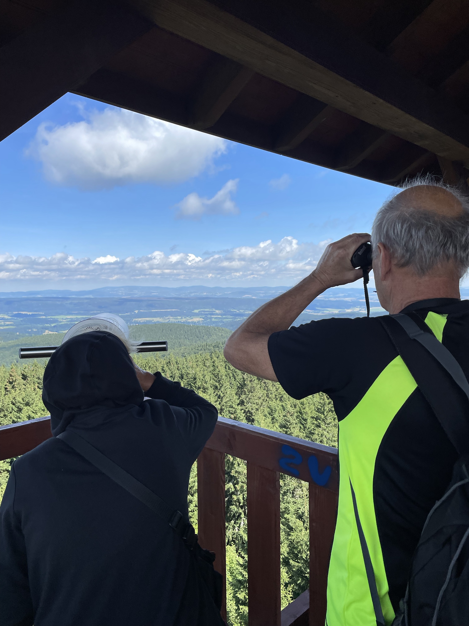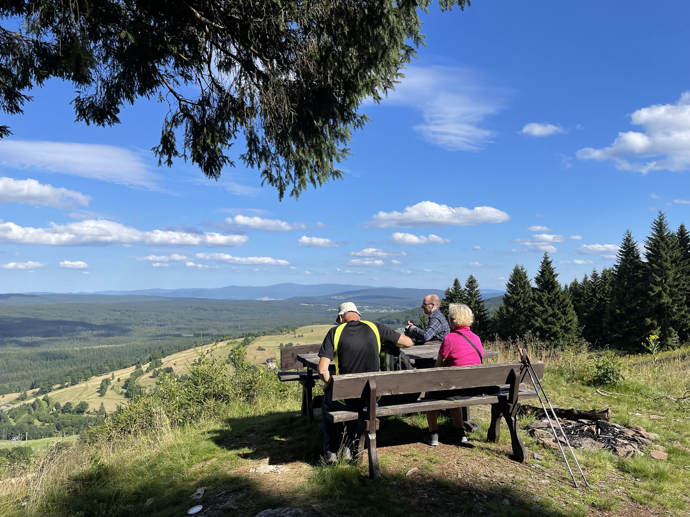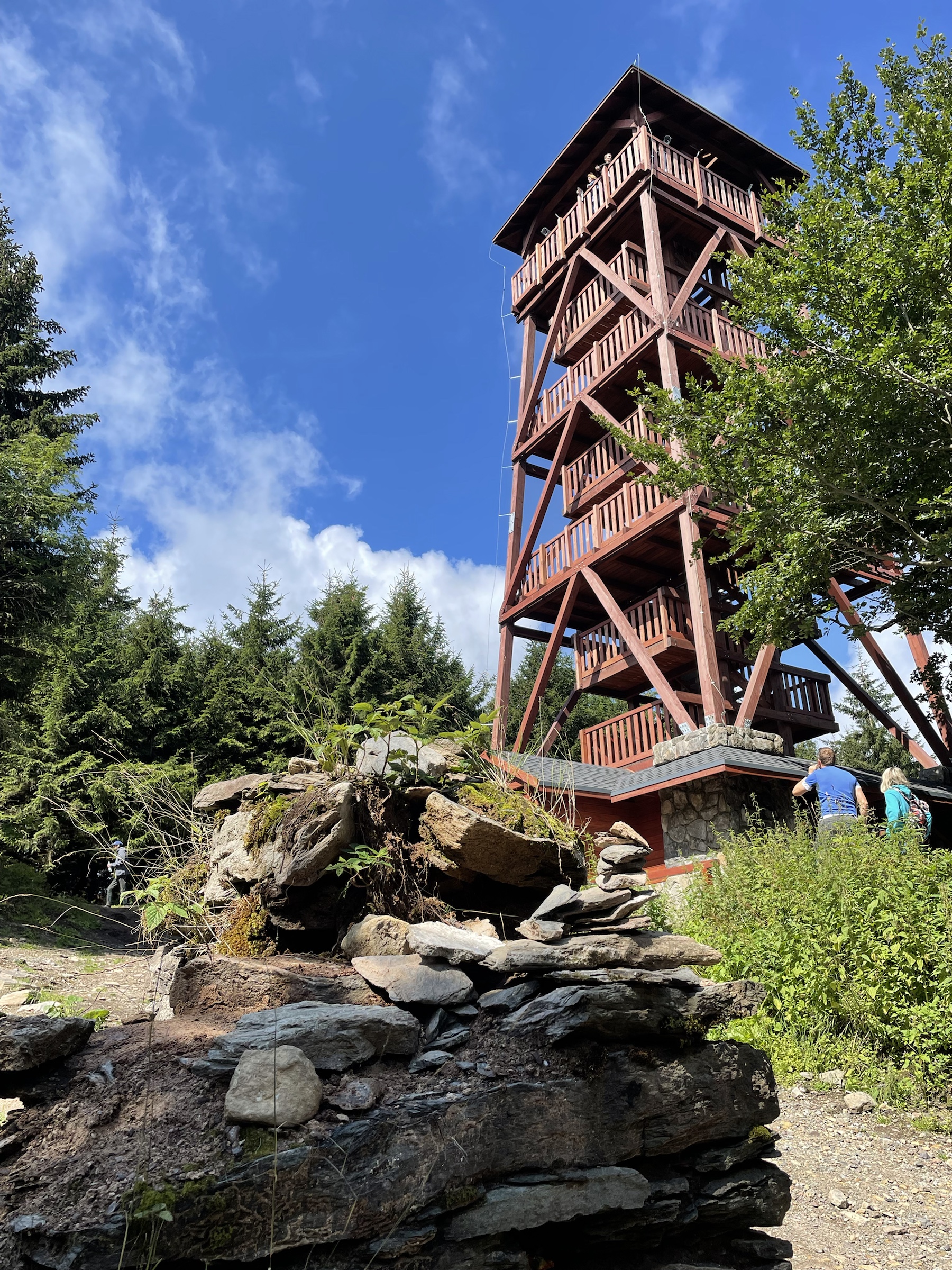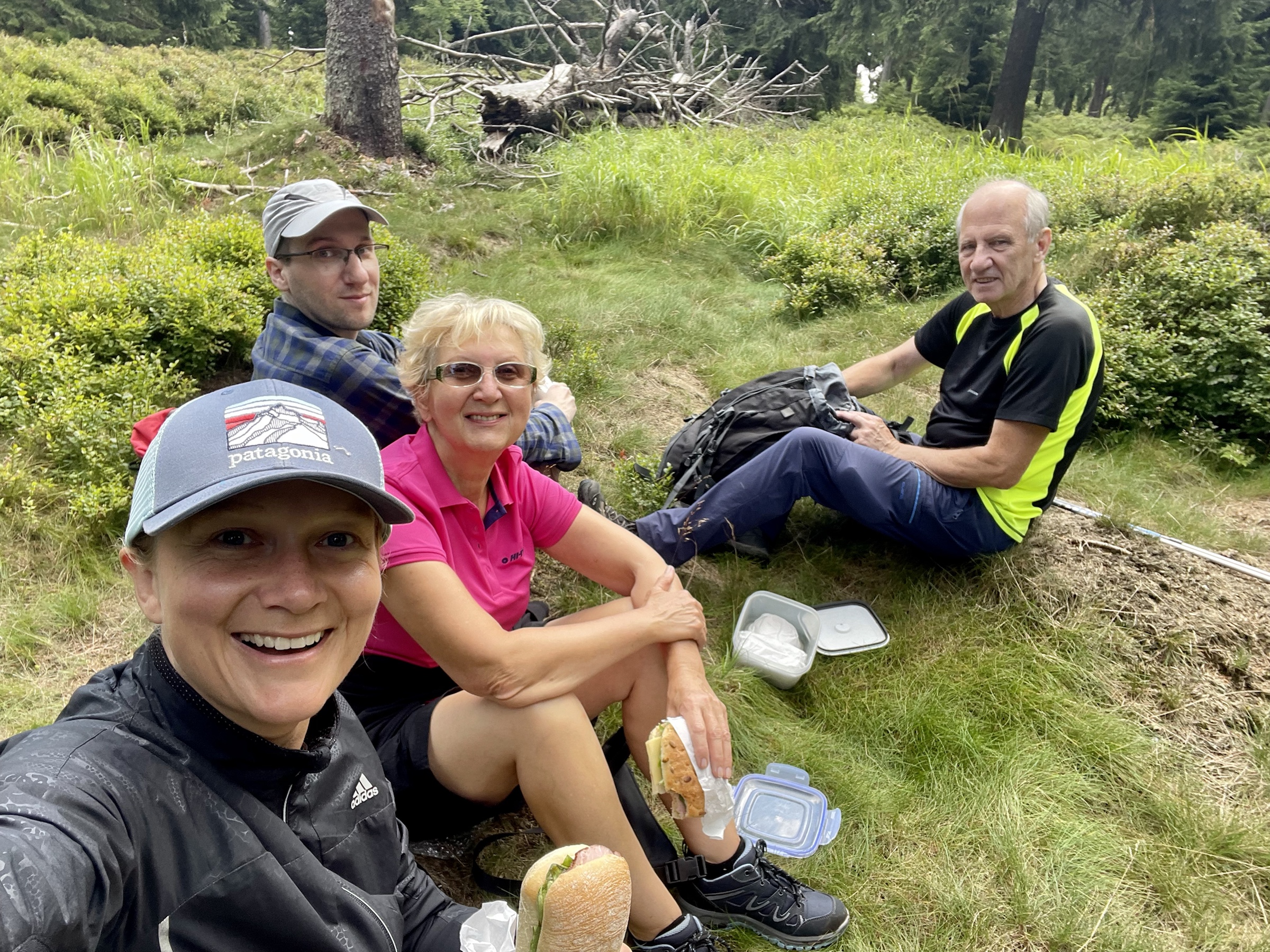 A że z Chaty już tylko 3.5km na Wielką Desztną, to poszliśmy i tam – gdyż tam też piękna nowa wieża (to jakiś lokalny fenomen: w Alpach na każdej górce krzyż, w Sudetach wieża 😉 ) Na ostatnim pietrze wieży odpoczywają pszczółki 🙂 Z powrotem poszliśmy prawie tą samą trasą: najpierw do Masarykovej Chaty, a potem rownolegle i w dół pod ostatnim wyciągiem – przepiękne widokowy punkt ze stołem i miejscem na ognisko! Jeszcze obiad w Przystanku Alaska z mega widokiem na Góry Sowie i po prawie 18km w nogach ruszamy do domu ☺️