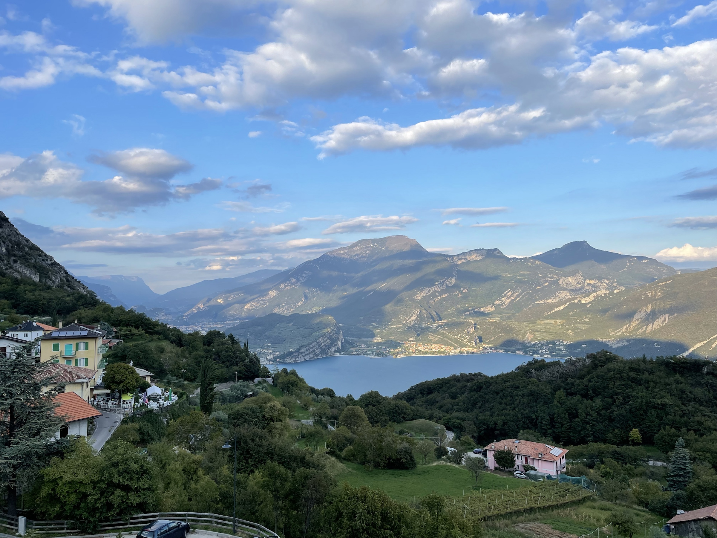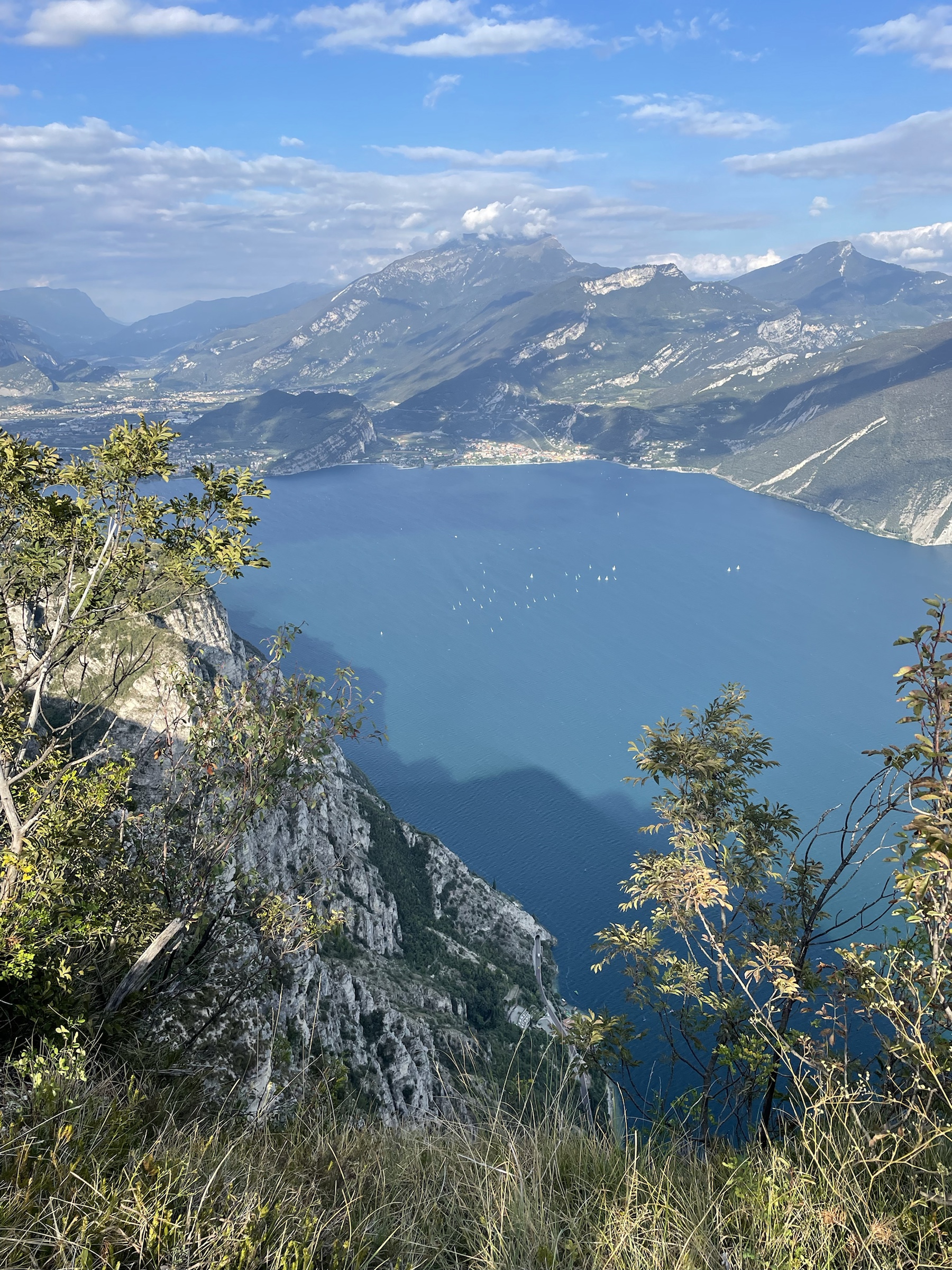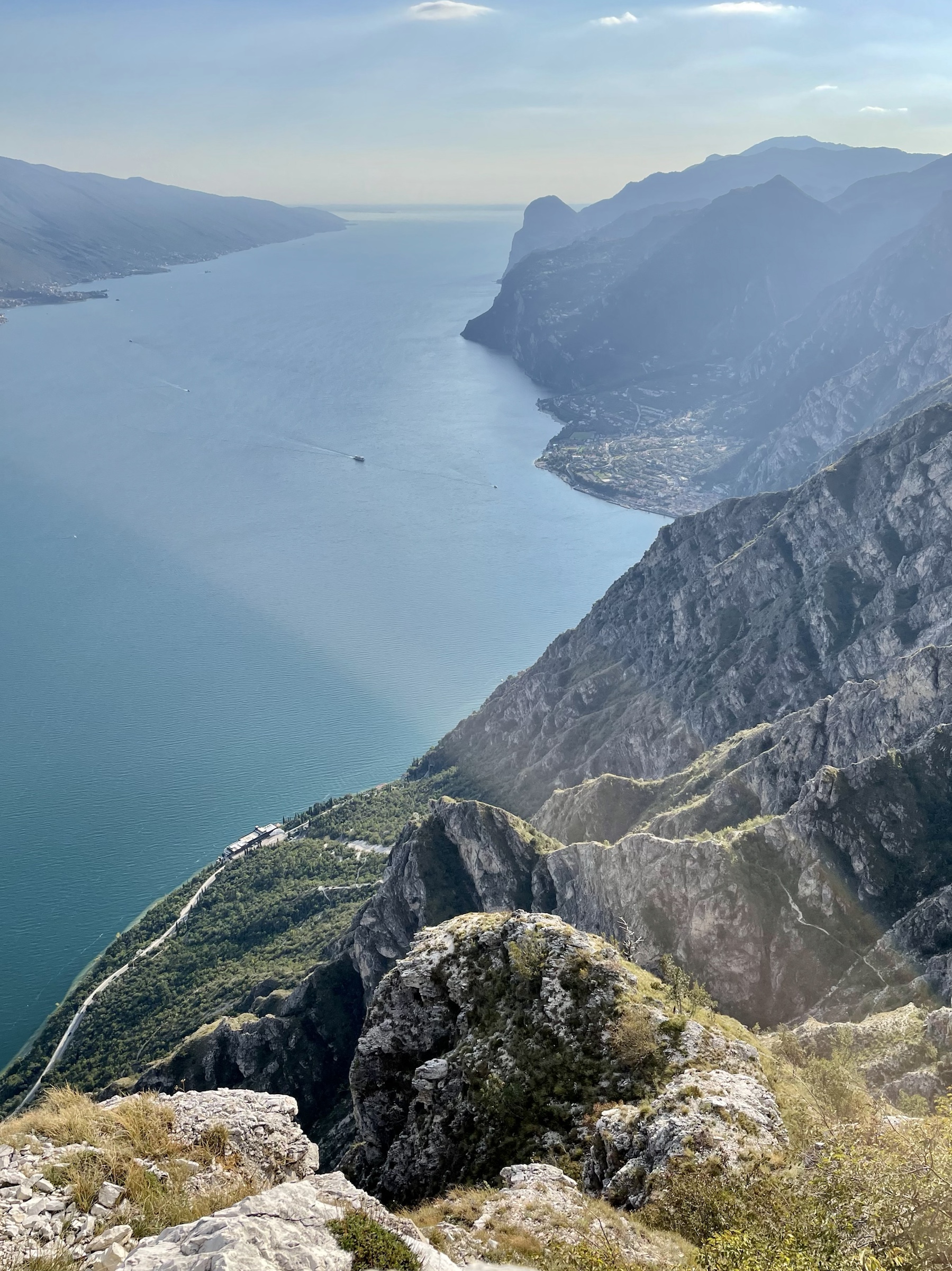 Quick ride from Riva to Pregasina (I’ve been there by e-bike couple of years ago!), last bit up to the parking by the church is really narrow but enough parking places there. Route is well marked: I take the steep path with the amazing lake view, no people on the way with me, only some coming back. Truly spectacular! Plenty surfers and sailors still visible on the water. Super windy on the top but my god, so beautiful! I took a while there, taking those views in: Limone directly under, Malcesine on the other side, Monte Baldo in clouds and the southern tip of Garda visible in the sun slowly moving to hide between the mountains. So pretty!