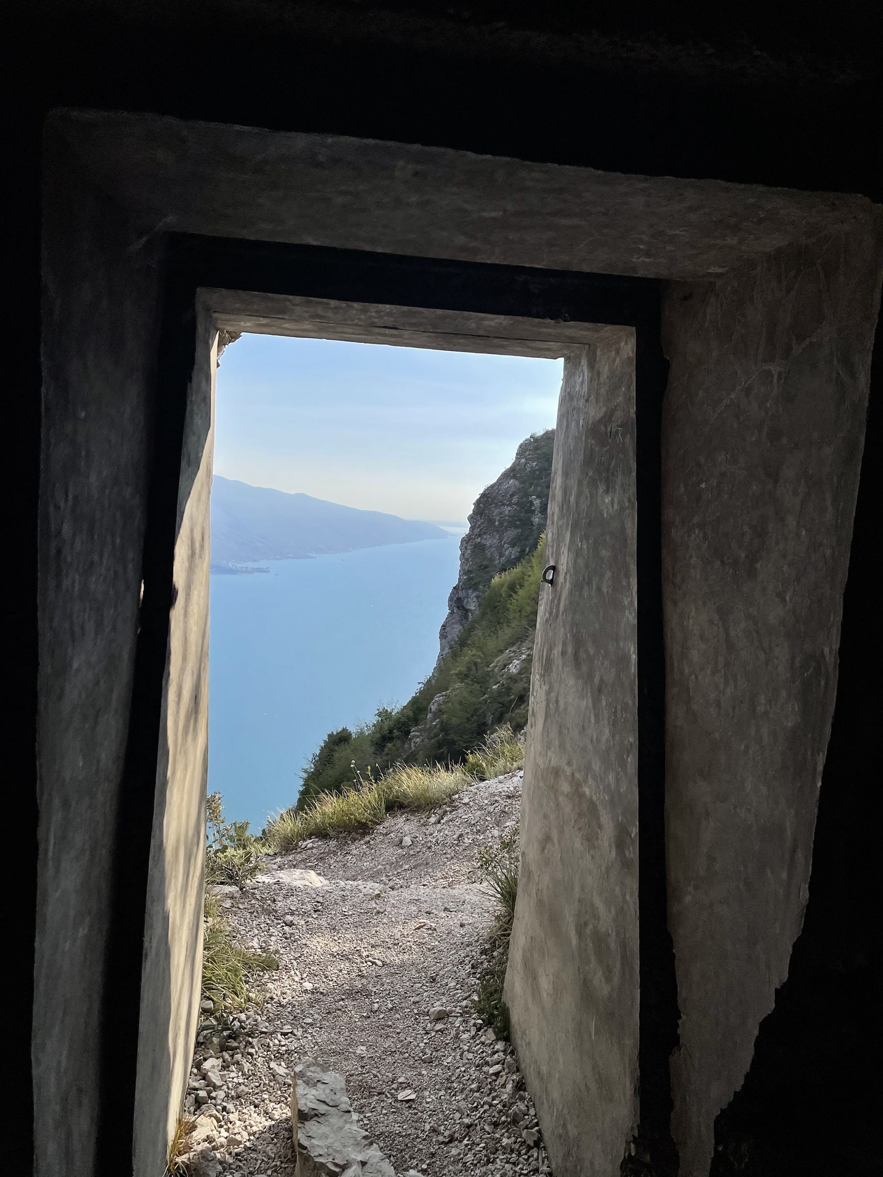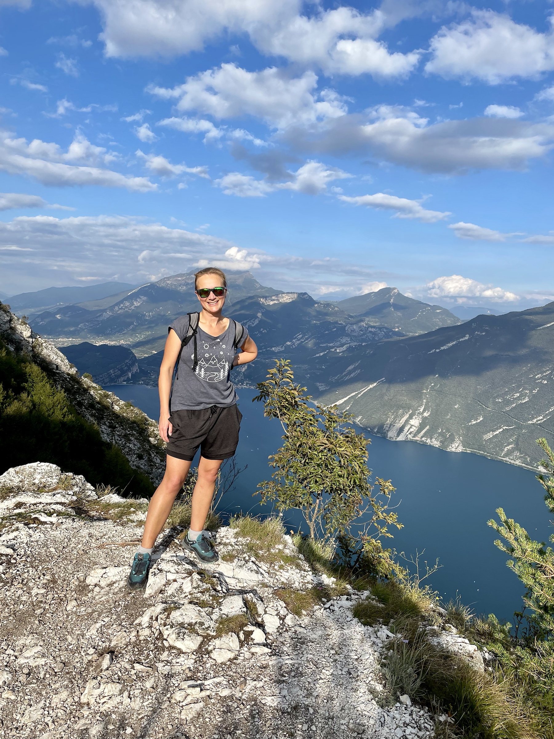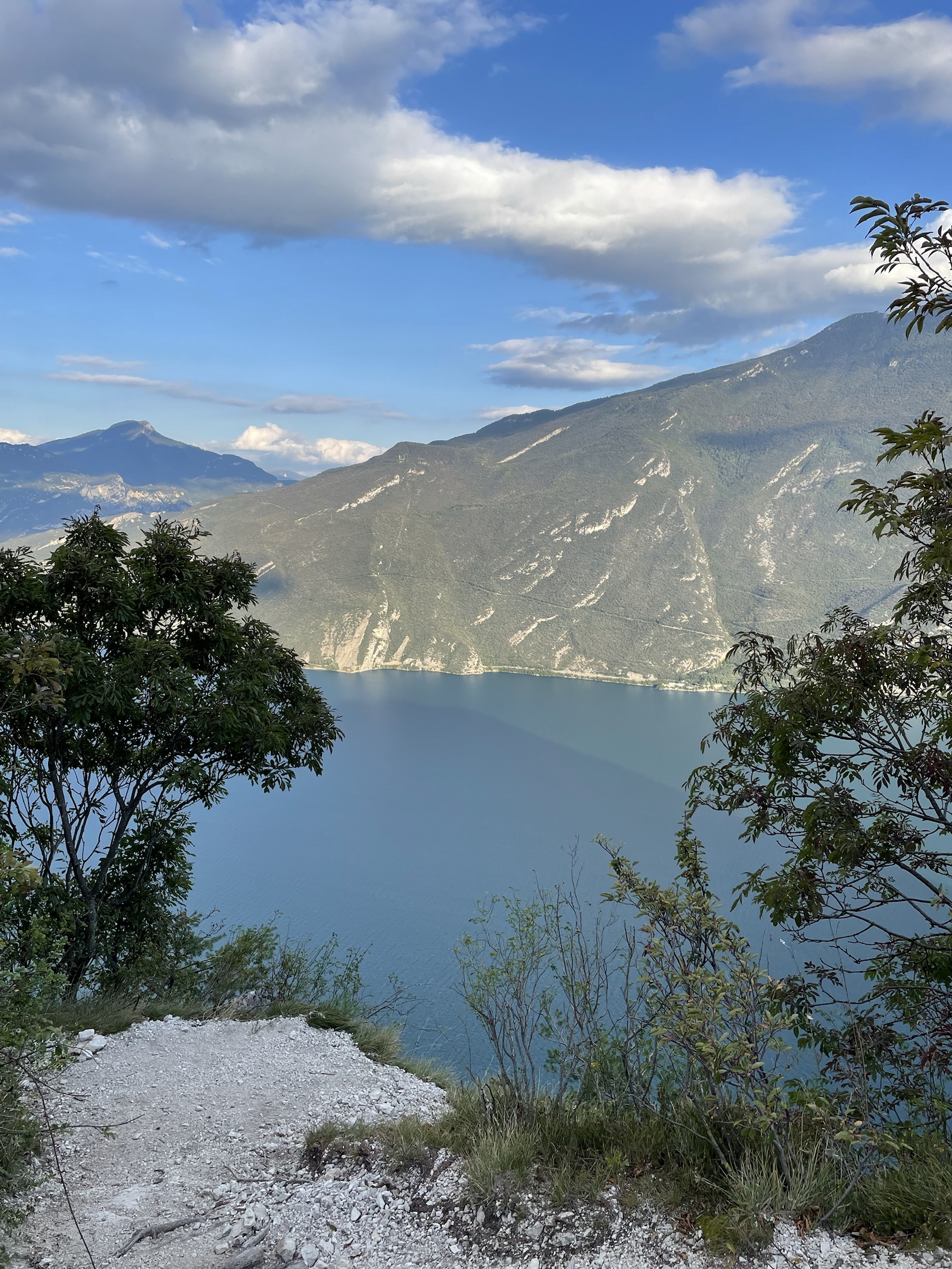 Quick ride from Riva to Pregasina (I’ve been there by e-bike couple of years ago!), last bit up to the parking by the church is really narrow but enough parking places there. Route is well marked: I take the steep path with the amazing lake view, no people on the way with me, only some coming back. Truly spectacular! Plenty surfers and sailors still visible on the water. Super windy on the top but my god, so beautiful! I took a while there, taking those views in: Limone directly under, Malcesine on the other side, Monte Baldo in clouds and the southern tip of Garda visible in the sun slowly moving to hide between the mountains. So pretty!