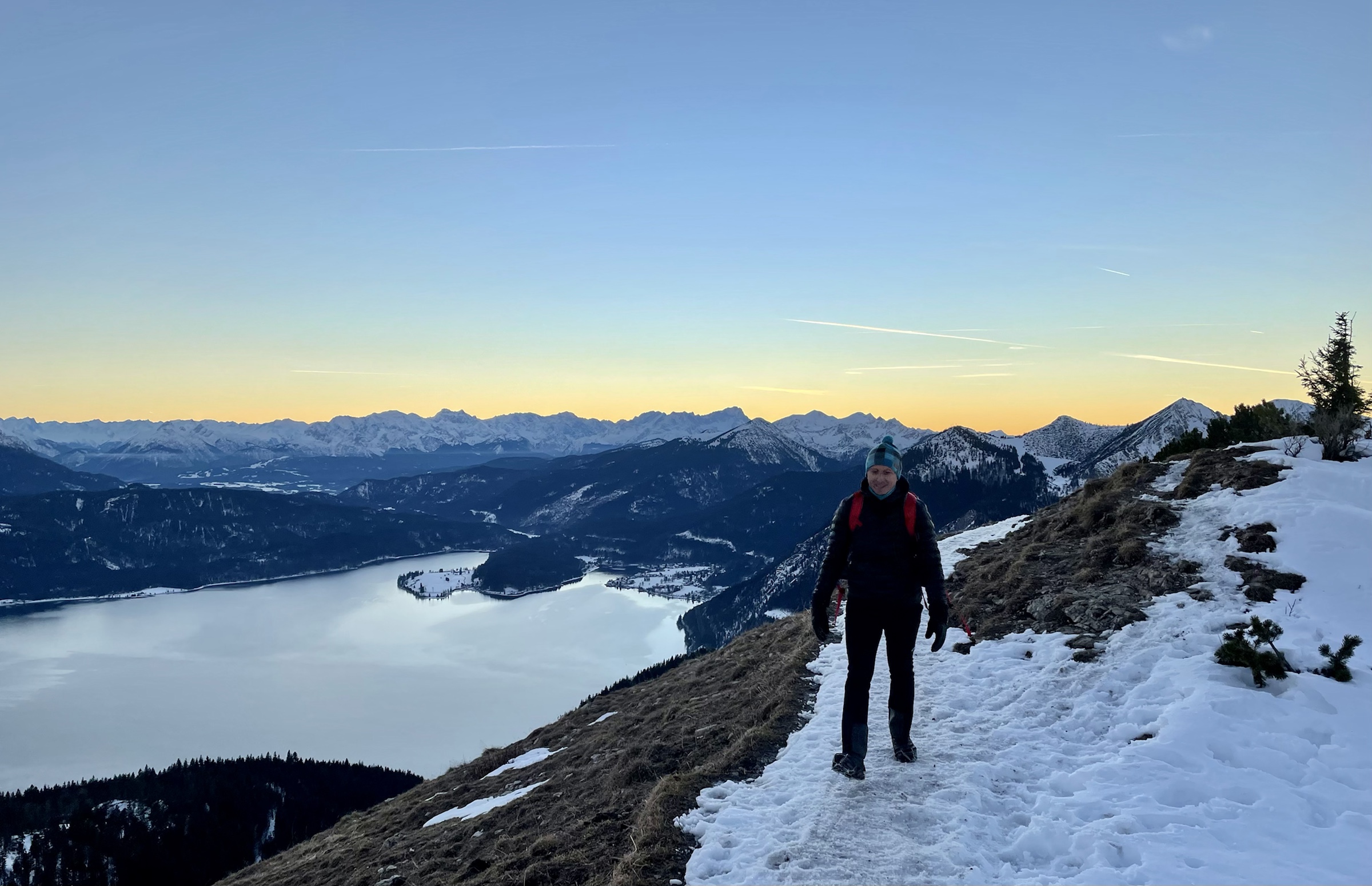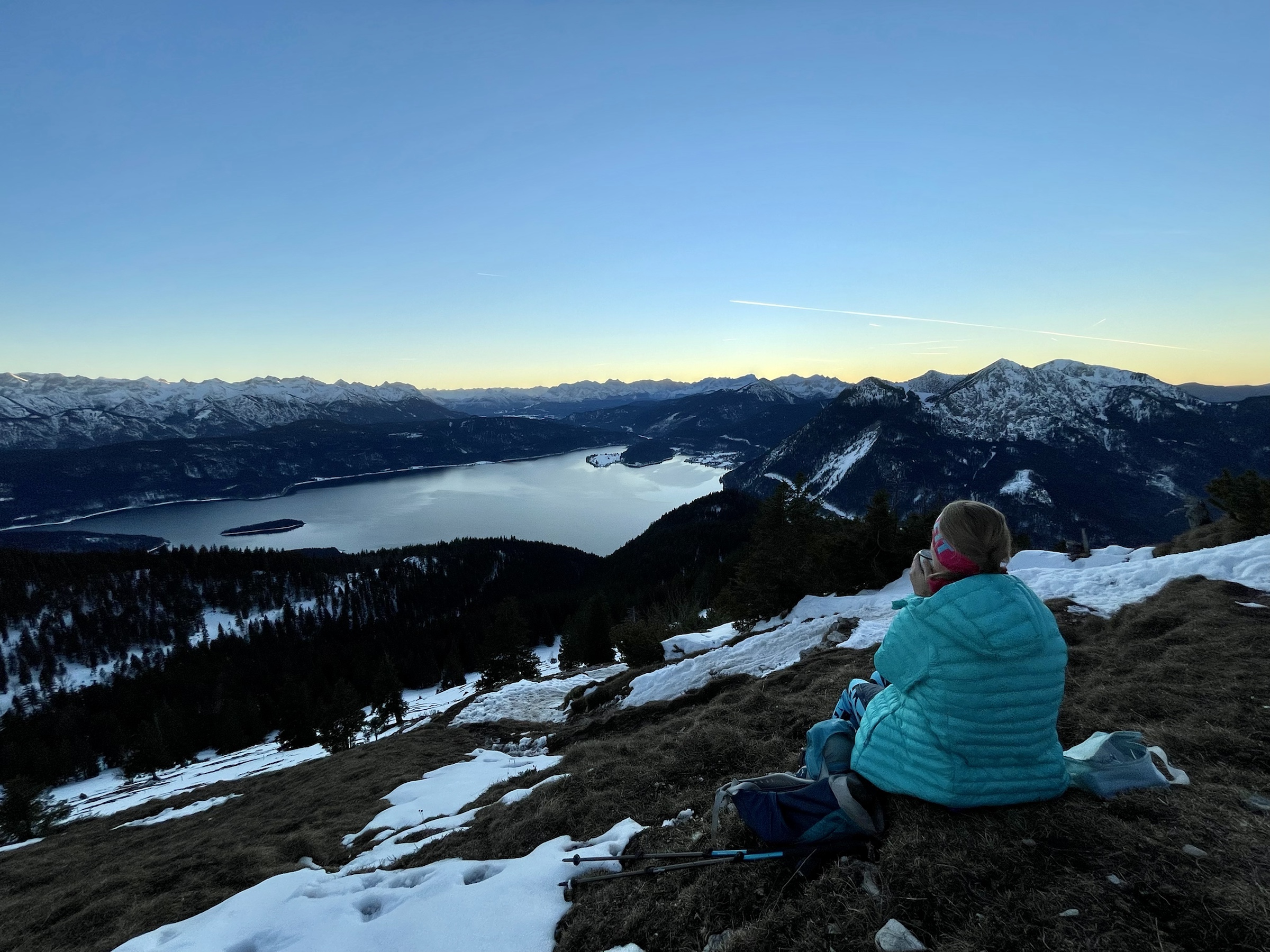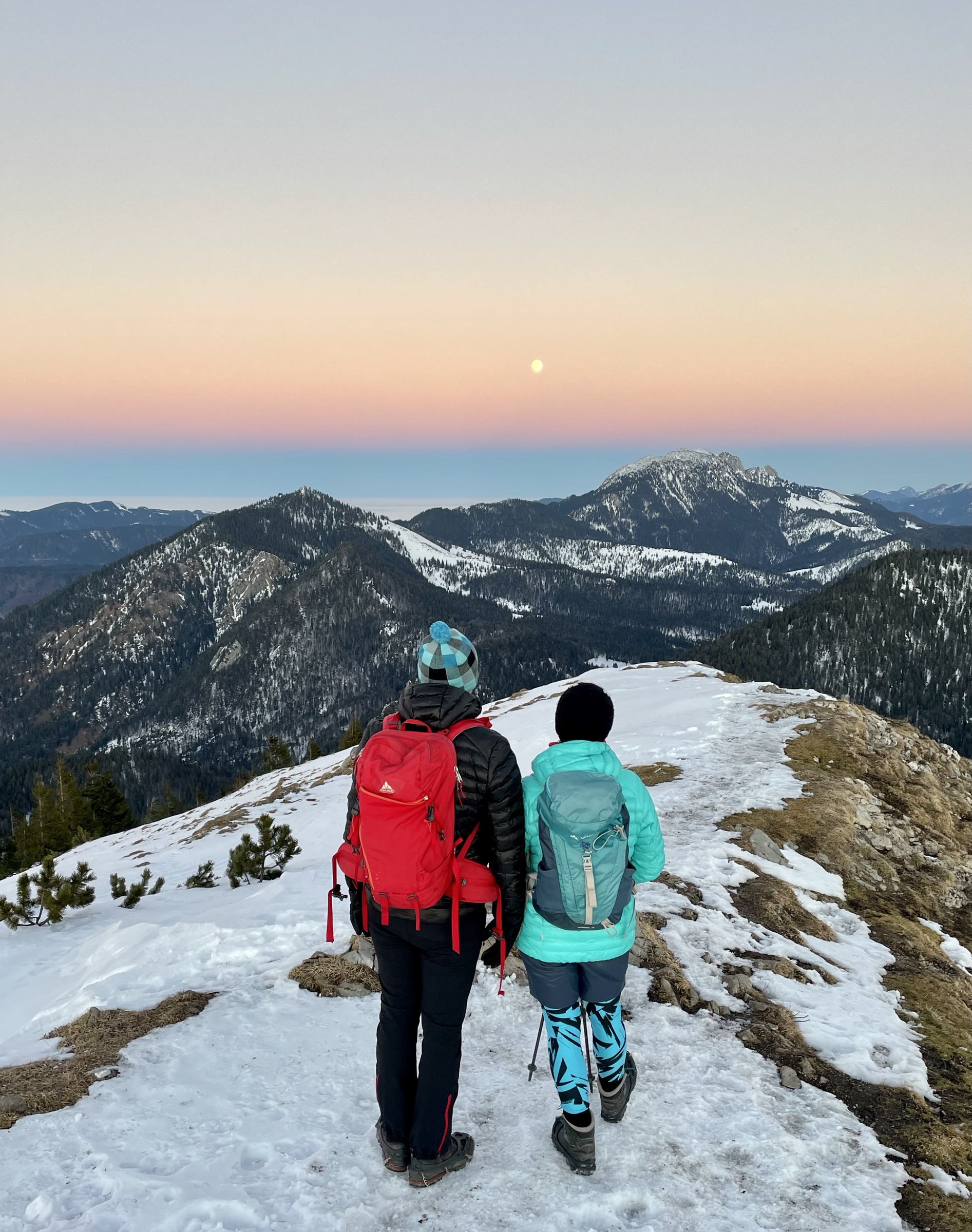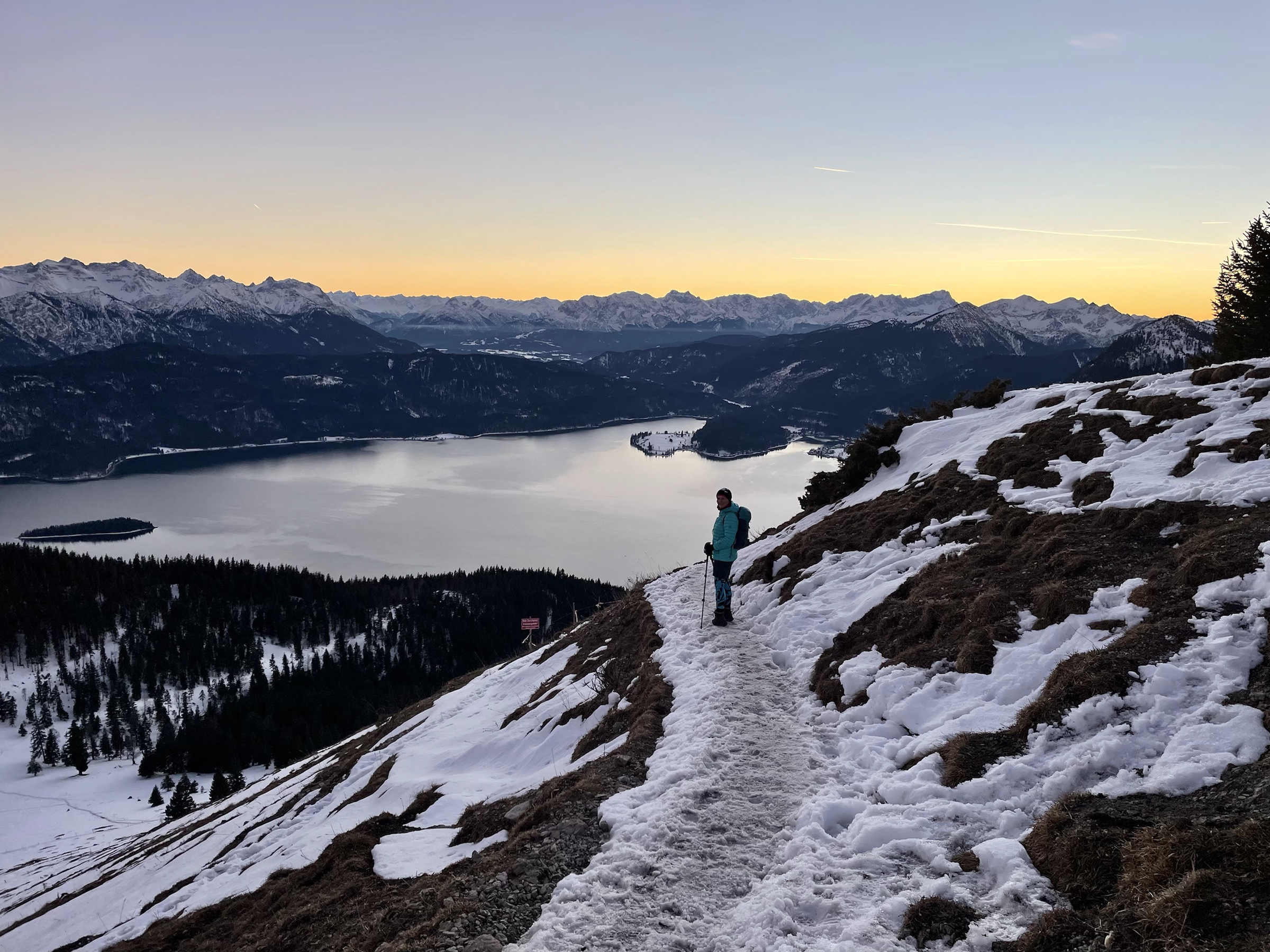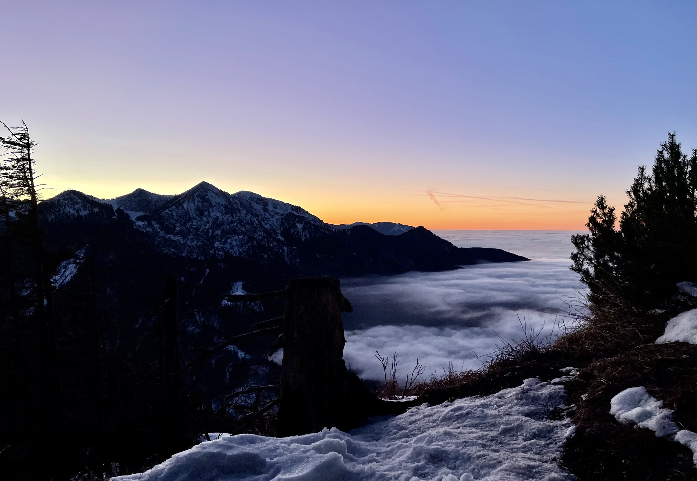 Ostatnia sobotka przed świętami, czyli przed wyjazdem do PL. Monachium znowu pod grubą kołdrą z chmur, a kamerki w górach pokazują błękit i słońce, zatem ruszamy na zachód słońca! Nie wysilam się zupełnie z planowaniem, bo ostatni tydzień w robocie mie nieco przeczołgał i po prostu jedziemy na Jochberg 🙂 Już za Starnbergiem wychodzi słońce, ale zjeżdżając z bany na Kochel wjeżdżamy w chmurę i im dalej, tym gorzej… Ale przekonuje M., że na Kesselberg będzie na pewno dużo lepiej i faktycznie po pierwszych metrach w górę wychodzimy ponad chmury 🙂 Początek powolny, bo oboje jesteśmy cokolwiek zmęczeni, ale szybko narzucam tempo, gdyż oczywiście jesteśmy na niedoczasie, a ja koniecznie chce posiedzieć chwilę w słońcu. Zatem, zasuwamy! Po wyjściu z lasu robimy piknik z widokiem na zachodzące słońce – zdążyliśmy 🙂 A po zachodzie idziemy jeszcze do krzyża, gdzie miły pan zupełnie nieproszony robi nam fotkę z księżycem. Kolory bajeczne, jak podczas naszego 1go zachodu na Rotwand. Jochberg nie rozczarowywuje: mała górka z wielkim widokiem! Uwielbiam góry po zachodzie słońca: te kolory, cisza i niczym niezmącone piękno. I mimo tego, że to popularna trasa, mam wrażenie, jakby to wszystko było tylko dla mnie – zwłaszcza, podczas schodzenia po ciemku i cichutku, zanim trzeba odpalić czołówkę. Cudne zakończenie roku 😍