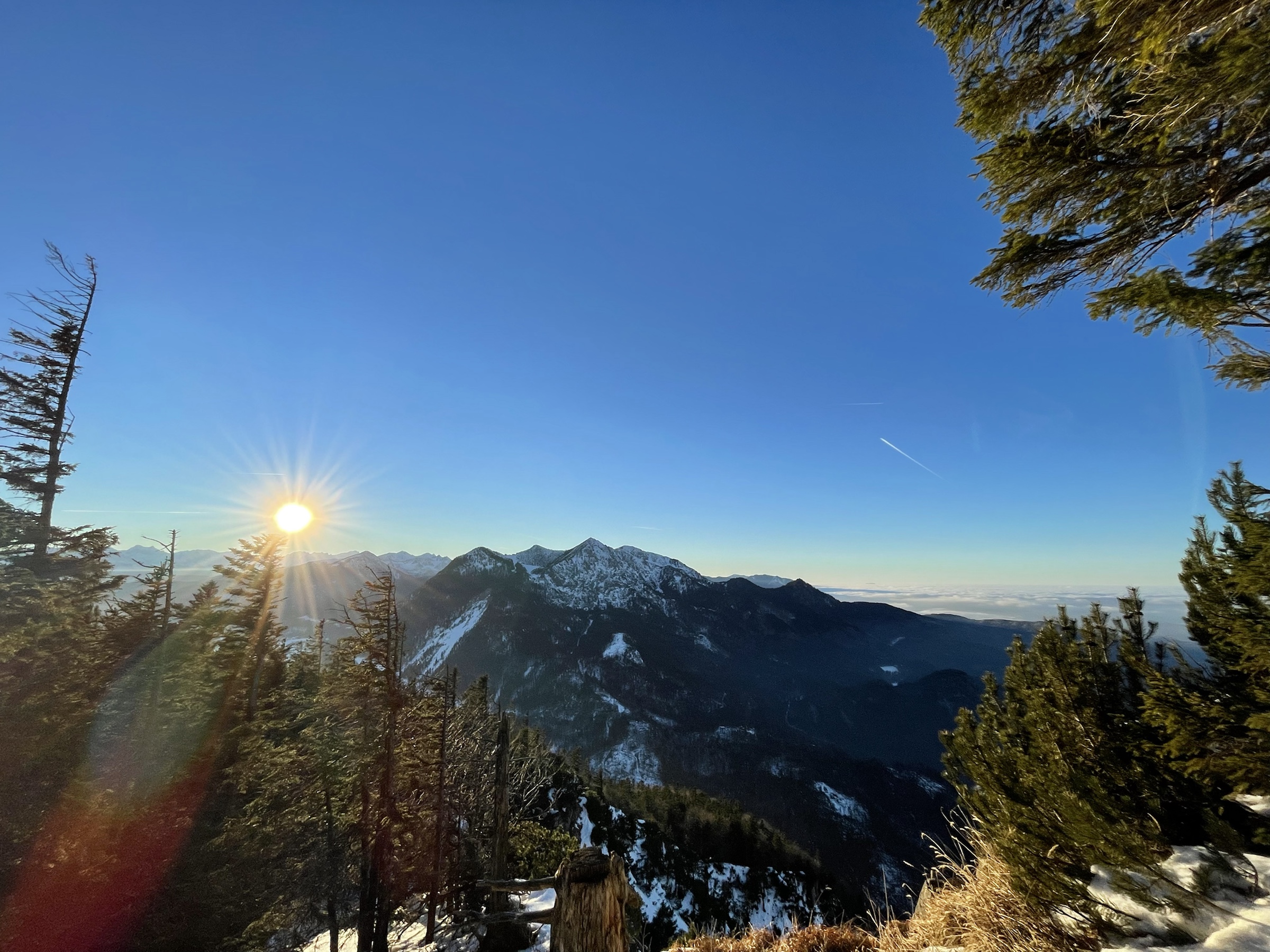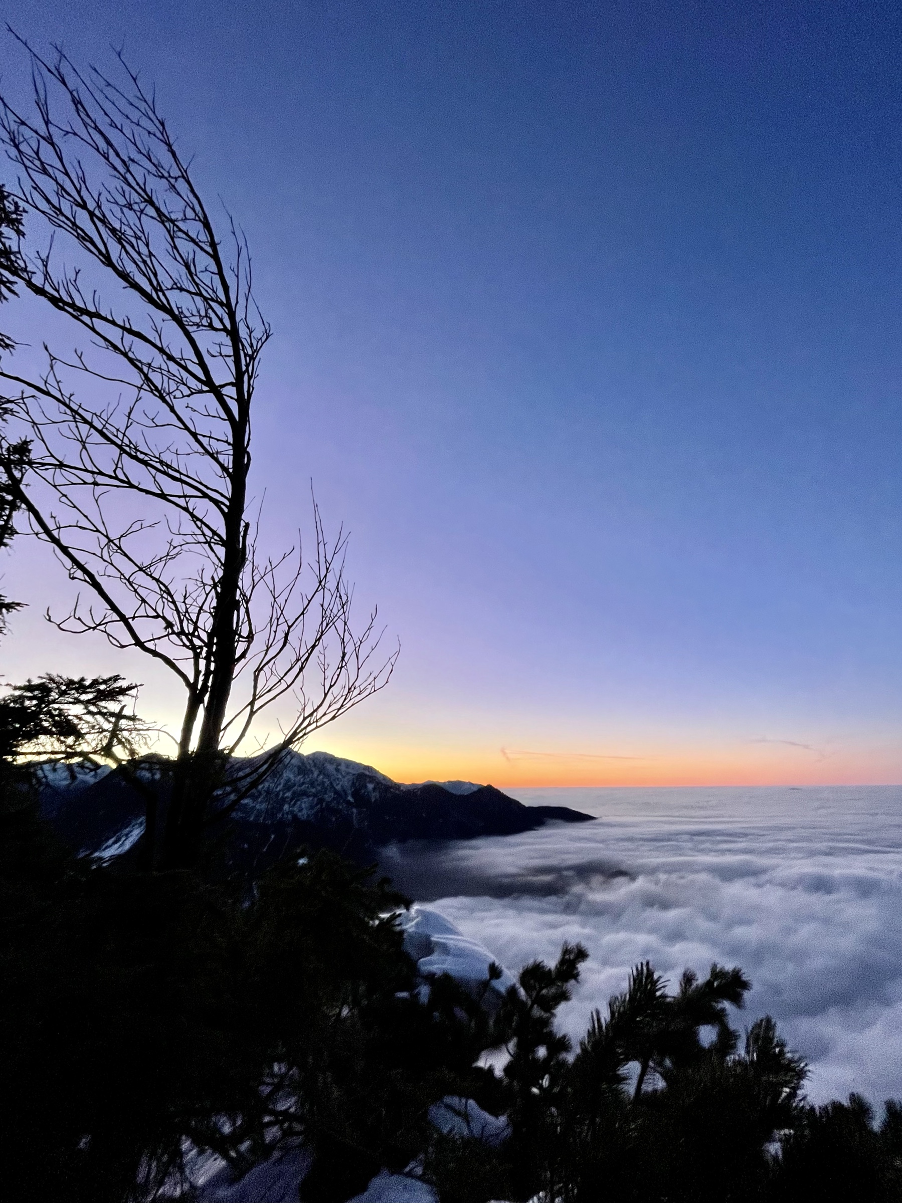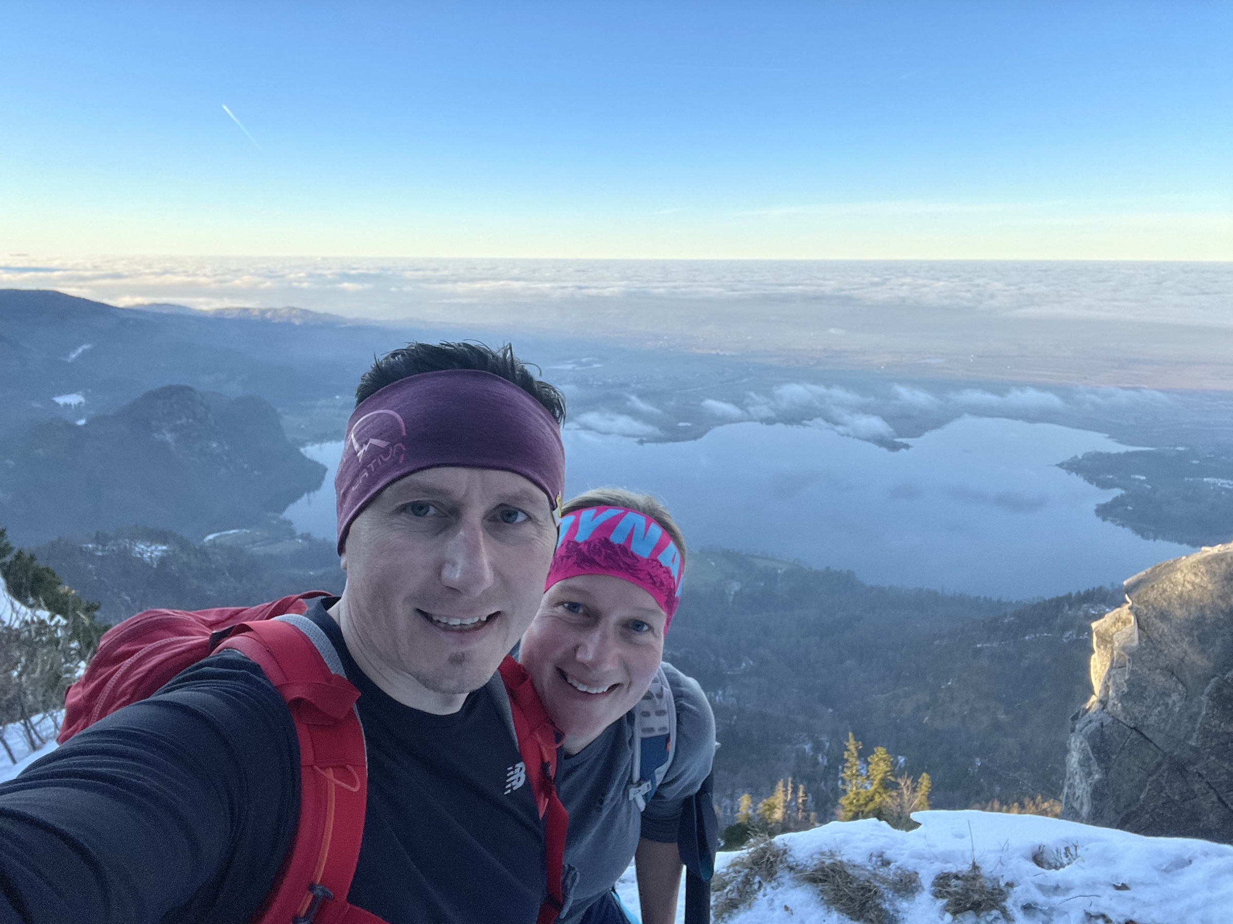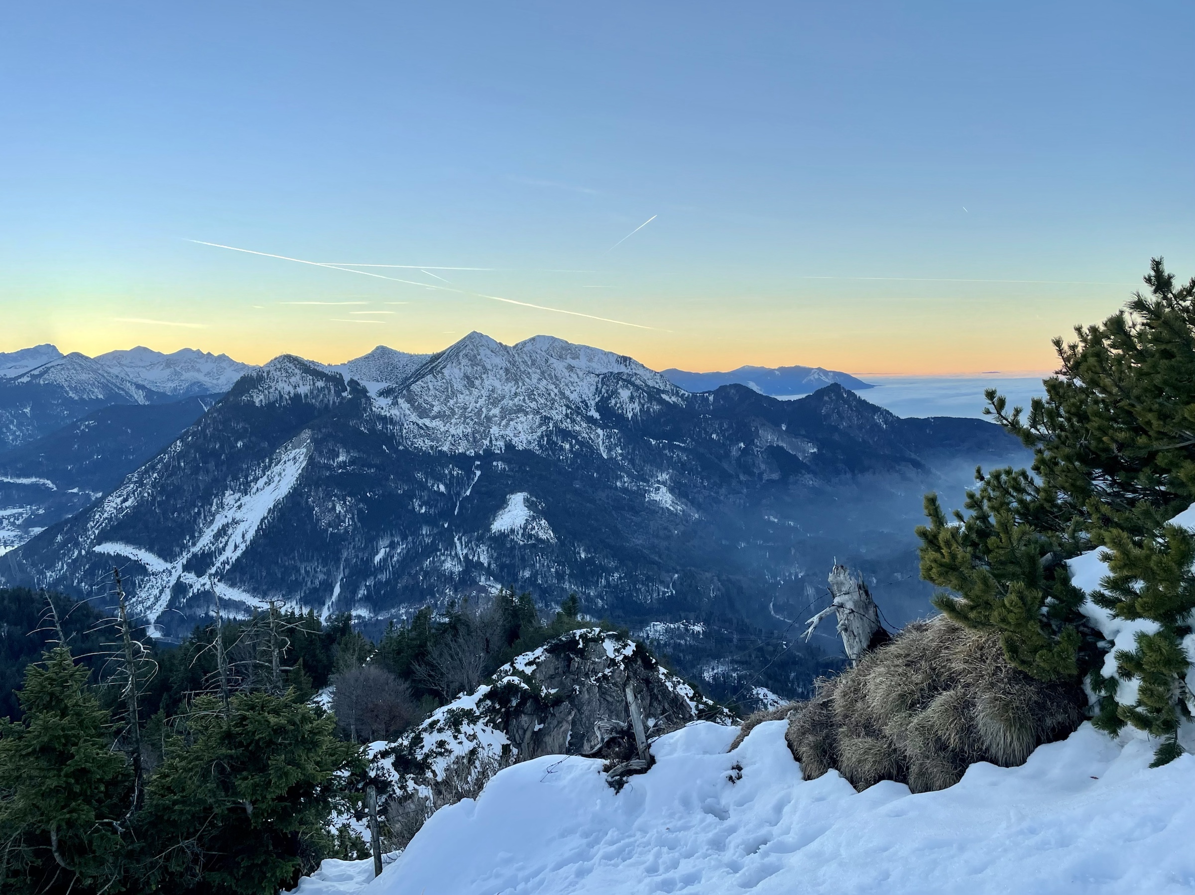 Ostatnia sobotka przed świętami, czyli przed wyjazdem do PL. Monachium znowu pod grubą kołdrą z chmur, a kamerki w górach pokazują błękit i słońce, zatem ruszamy na zachód słońca! Nie wysilam się zupełnie z planowaniem, bo ostatni tydzień w robocie mie nieco przeczołgał i po prostu jedziemy na Jochberg 🙂 Już za Starnbergiem wychodzi słońce, ale zjeżdżając z bany na Kochel wjeżdżamy w chmurę i im dalej, tym gorzej… Ale przekonuje M., że na Kesselberg będzie na pewno dużo lepiej i faktycznie po pierwszych metrach w górę wychodzimy ponad chmury 🙂 Początek powolny, bo oboje jesteśmy cokolwiek zmęczeni, ale szybko narzucam tempo, gdyż oczywiście jesteśmy na niedoczasie, a ja koniecznie chce posiedzieć chwilę w słońcu. Zatem, zasuwamy! Po wyjściu z lasu robimy piknik z widokiem na zachodzące słońce – zdążyliśmy 🙂 A po zachodzie idziemy jeszcze do krzyża, gdzie miły pan zupełnie nieproszony robi nam fotkę z księżycem. Kolory bajeczne, jak podczas naszego 1go zachodu na Rotwand. Jochberg nie rozczarowywuje: mała górka z wielkim widokiem! Uwielbiam góry po zachodzie słońca: te kolory, cisza i niczym niezmącone piękno. I mimo tego, że to popularna trasa, mam wrażenie, jakby to wszystko było tylko dla mnie – zwłaszcza, podczas schodzenia po ciemku i cichutku, zanim trzeba odpalić czołówkę. Cudne zakończenie roku 😍