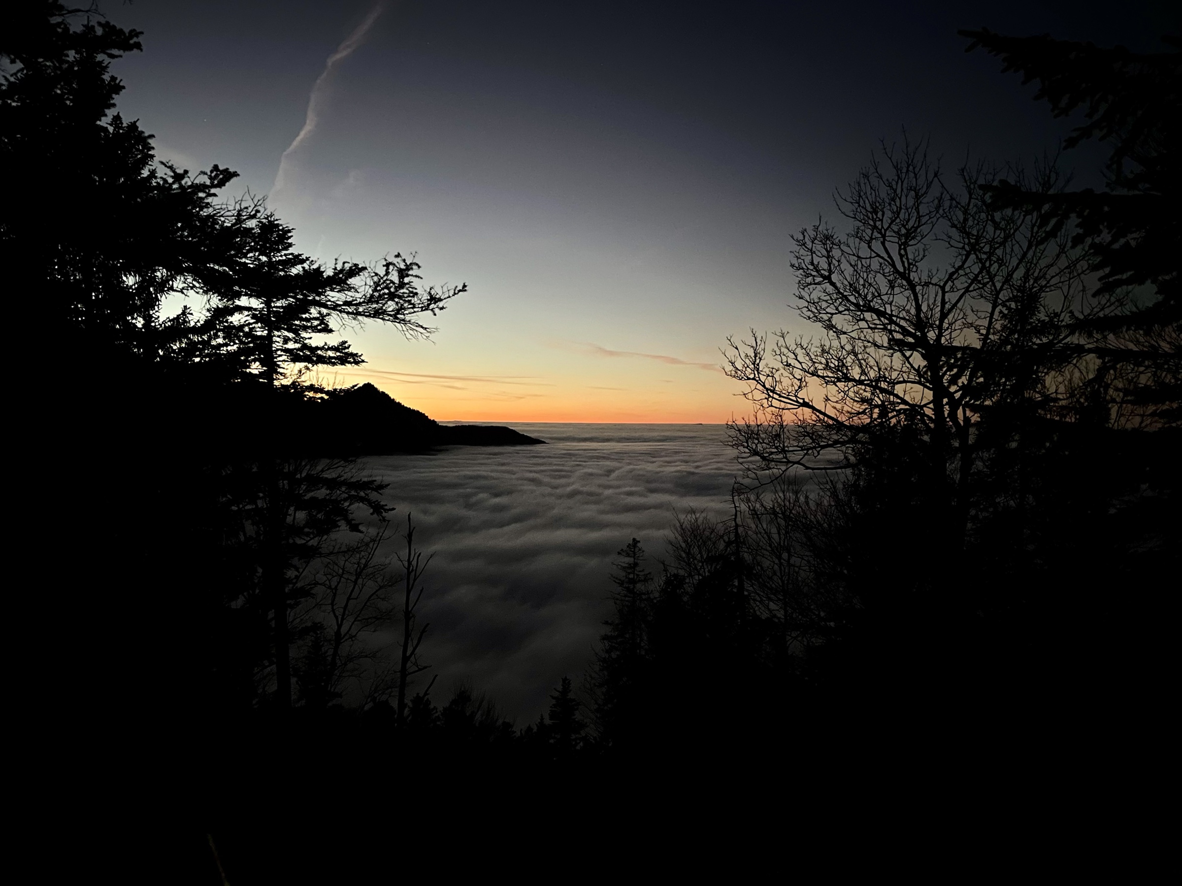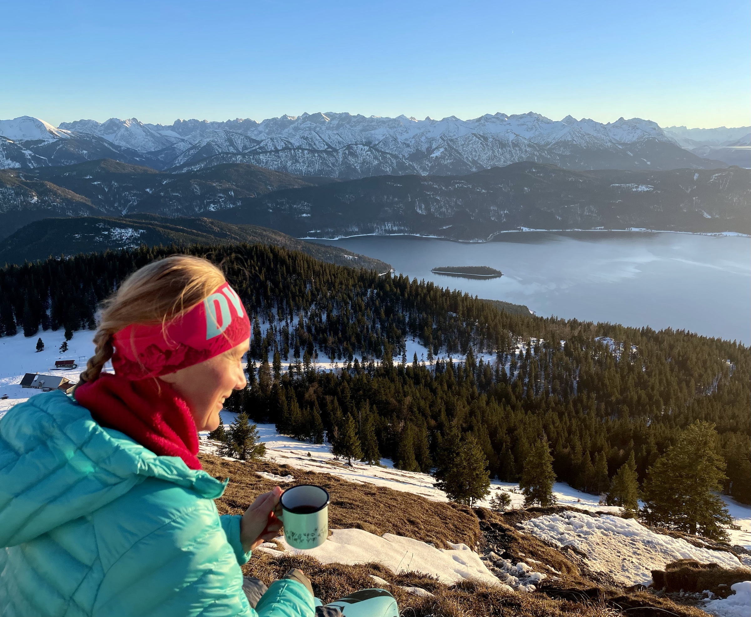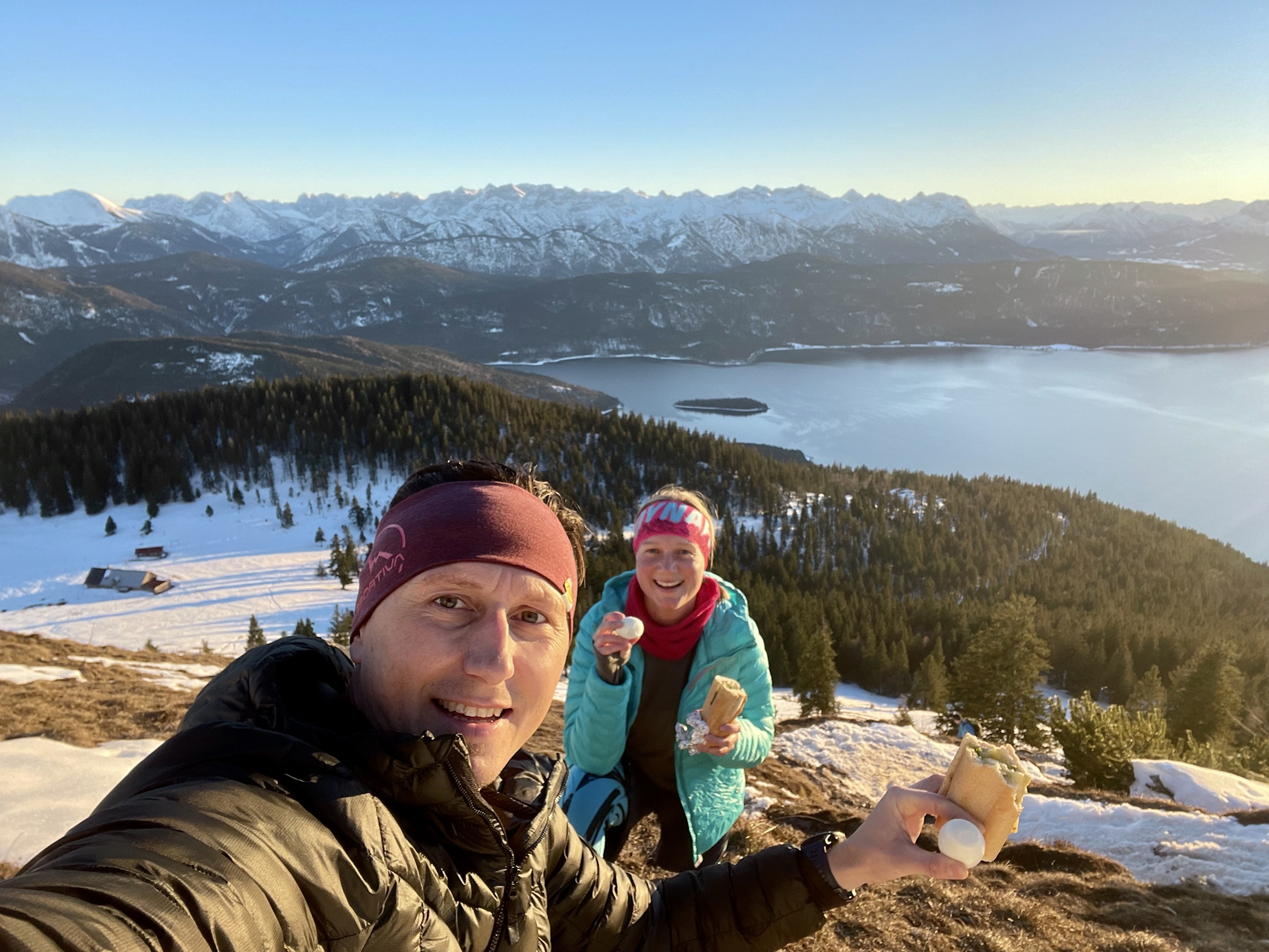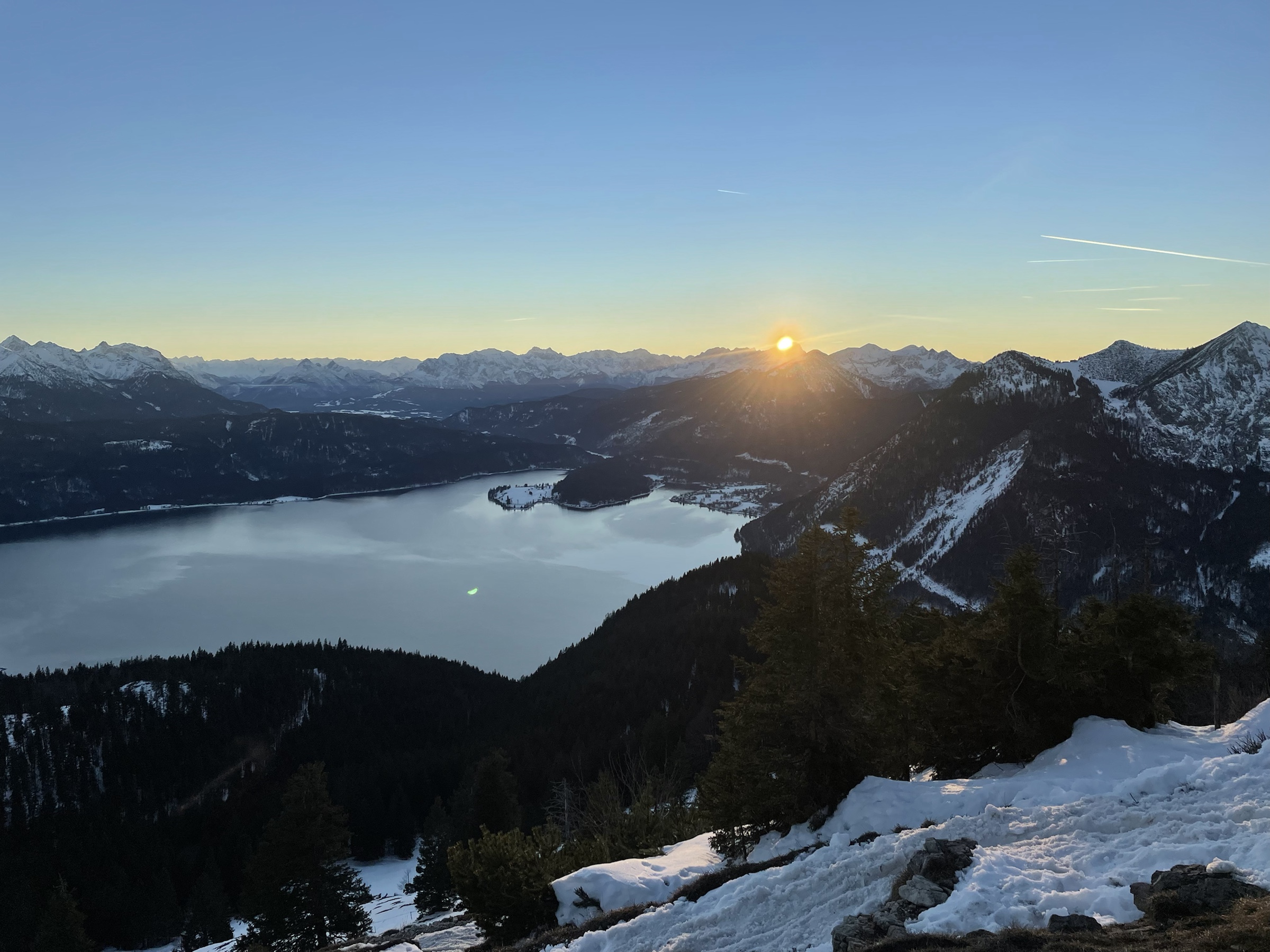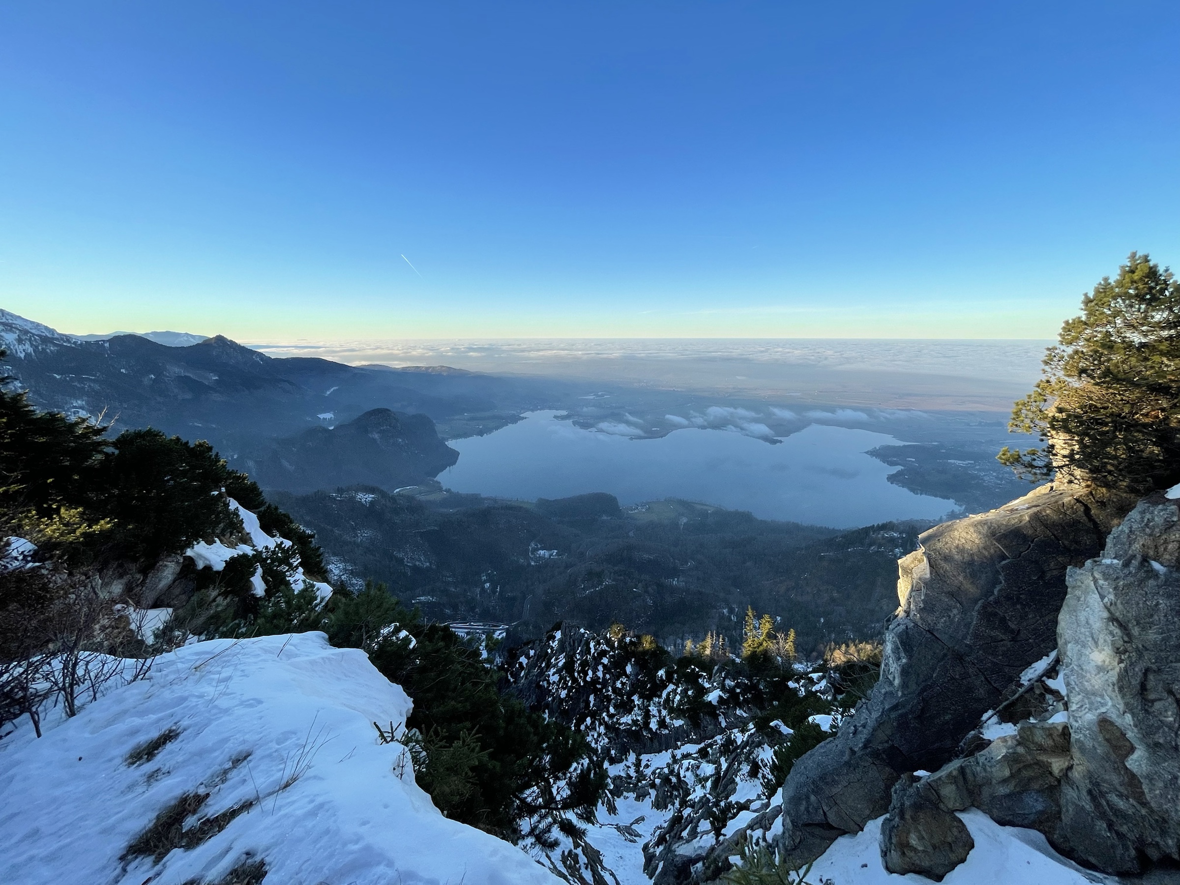 Ostatnia sobotka przed świętami, czyli przed wyjazdem do PL. Monachium znowu pod grubą kołdrą z chmur, a kamerki w górach pokazują błękit i słońce, zatem ruszamy na zachód słońca! Nie wysilam się zupełnie z planowaniem, bo ostatni tydzień w robocie mie nieco przeczołgał i po prostu jedziemy na Jochberg 🙂 Już za Starnbergiem wychodzi słońce, ale zjeżdżając z bany na Kochel wjeżdżamy w chmurę i im dalej, tym gorzej… Ale przekonuje M., że na Kesselberg będzie na pewno dużo lepiej i faktycznie po pierwszych metrach w górę wychodzimy ponad chmury 🙂 Początek powolny, bo oboje jesteśmy cokolwiek zmęczeni, ale szybko narzucam tempo, gdyż oczywiście jesteśmy na niedoczasie, a ja koniecznie chce posiedzieć chwilę w słońcu. Zatem, zasuwamy! Po wyjściu z lasu robimy piknik z widokiem na zachodzące słońce – zdążyliśmy 🙂 A po zachodzie idziemy jeszcze do krzyża, gdzie miły pan zupełnie nieproszony robi nam fotkę z księżycem. Kolory bajeczne, jak podczas naszego 1go zachodu na Rotwand. Jochberg nie rozczarowywuje: mała górka z wielkim widokiem! Uwielbiam góry po zachodzie słońca: te kolory, cisza i niczym niezmącone piękno. I mimo tego, że to popularna trasa, mam wrażenie, jakby to wszystko było tylko dla mnie – zwłaszcza, podczas schodzenia po ciemku i cichutku, zanim trzeba odpalić czołówkę. Cudne zakończenie roku 😍