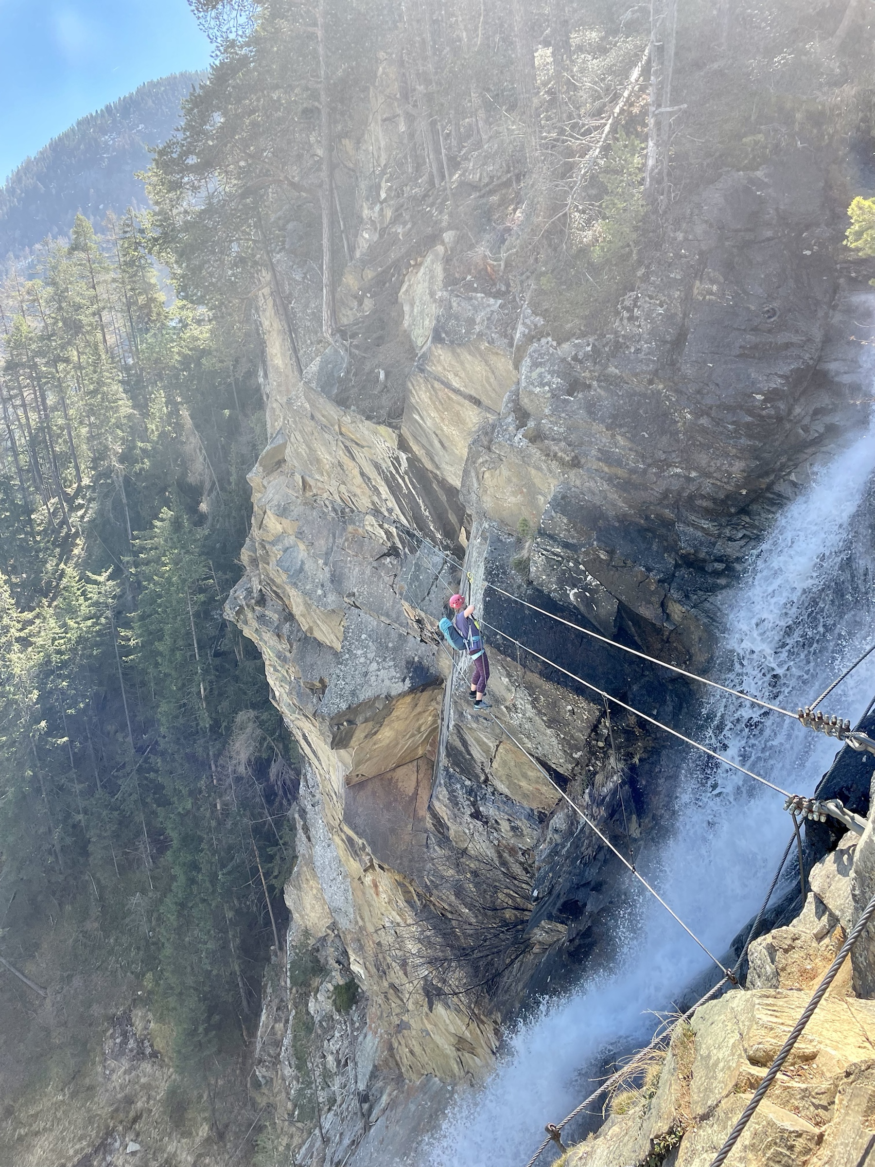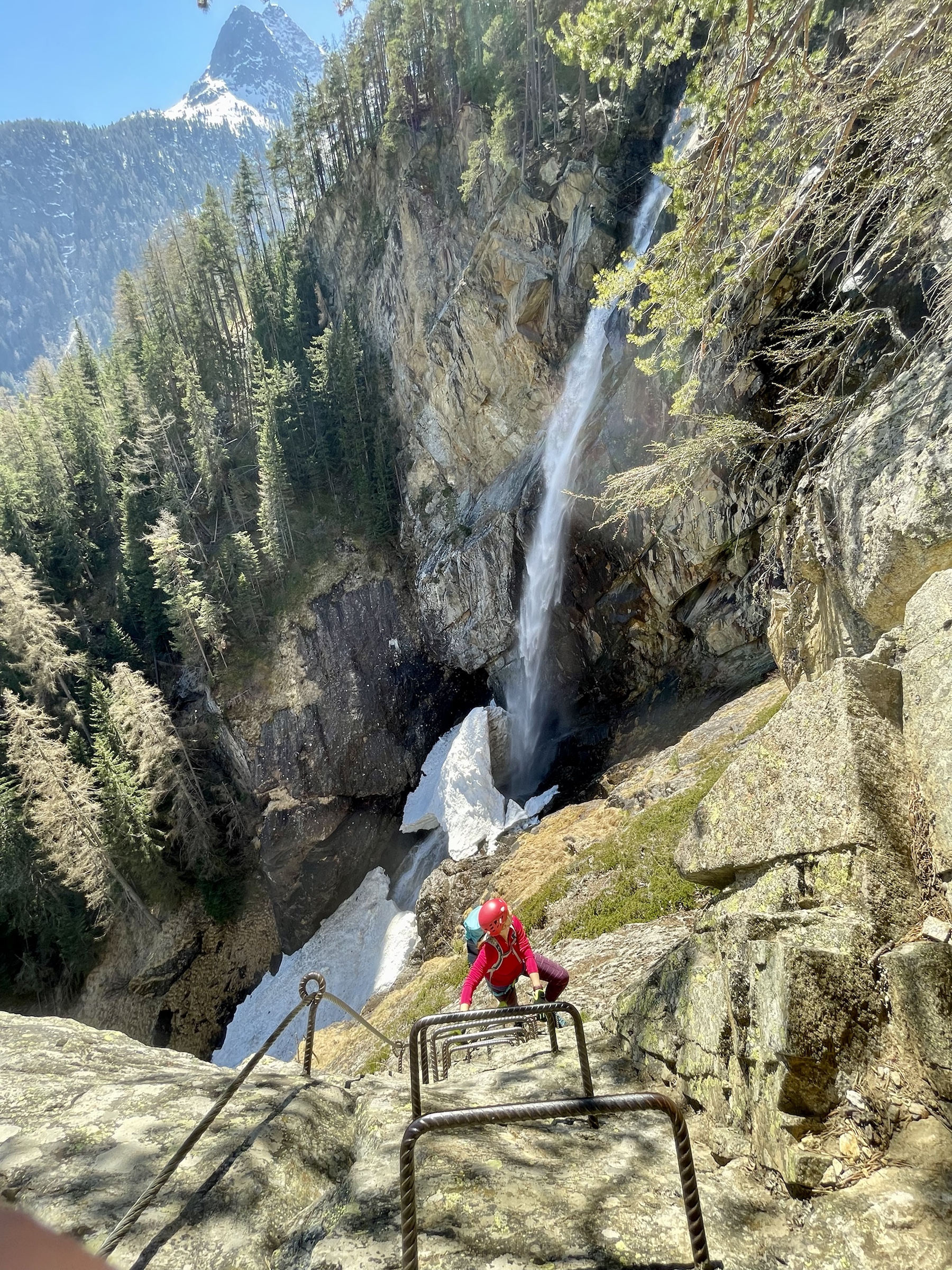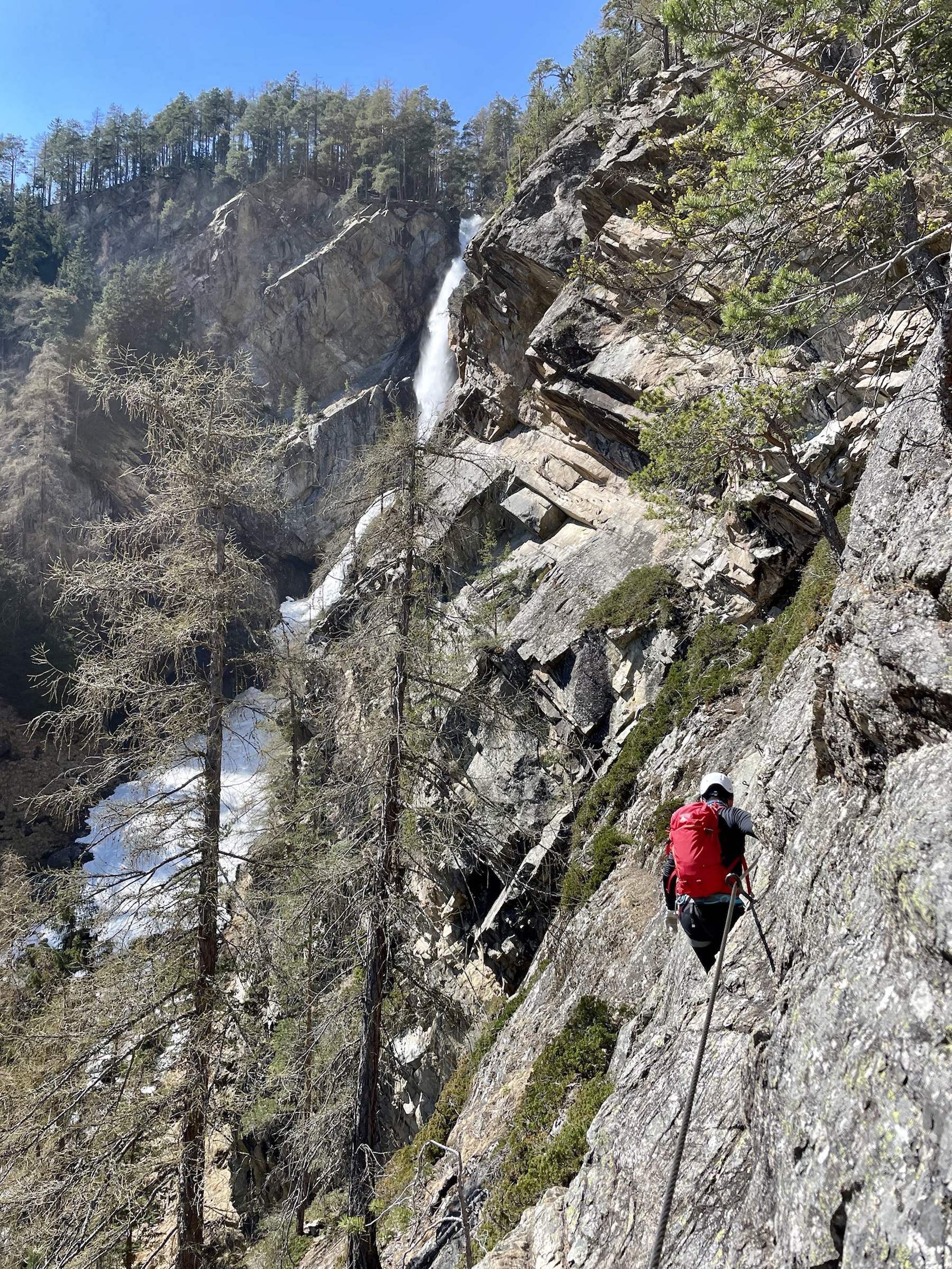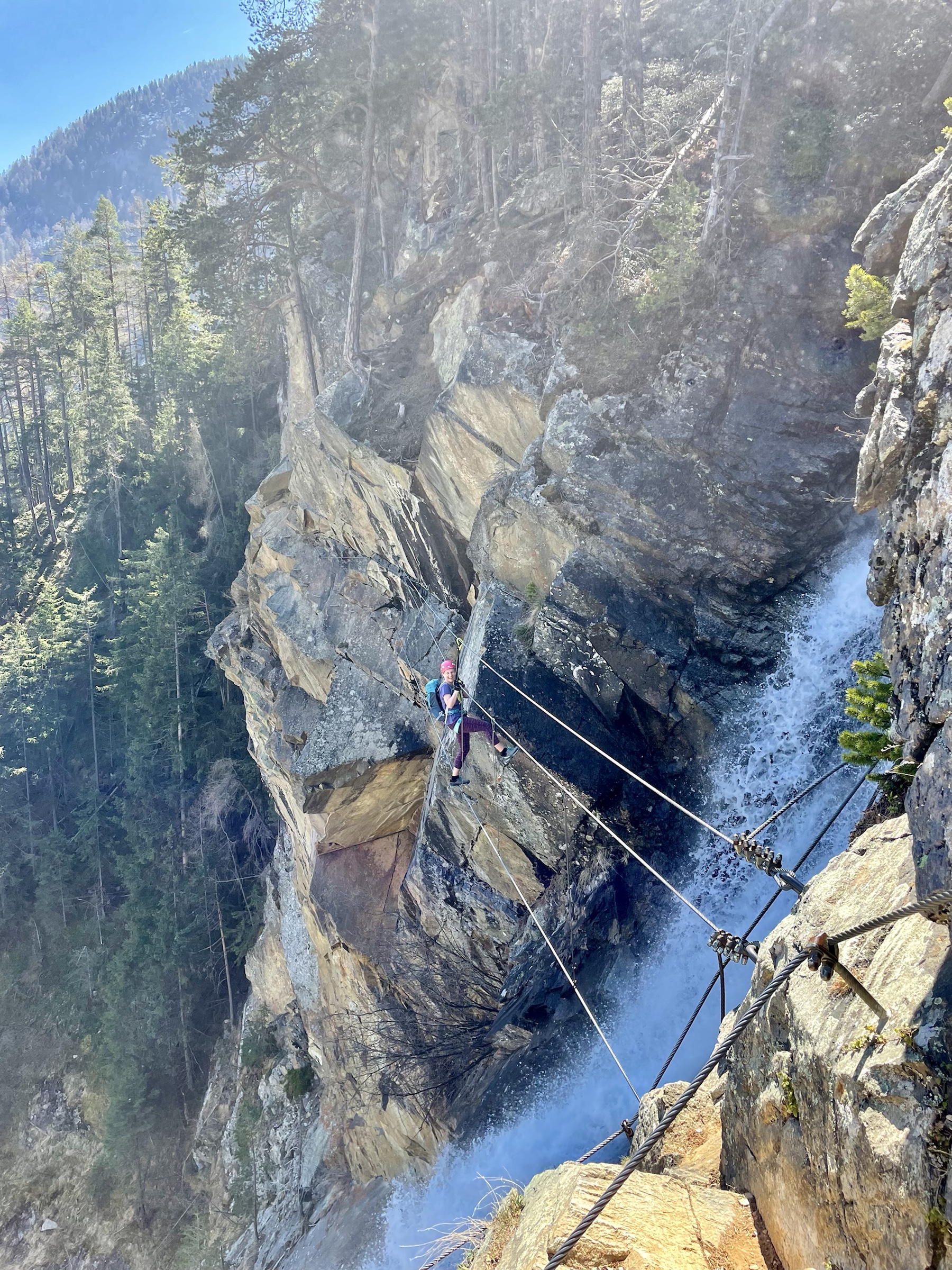 Wielkanocna Niedziela przywitała nas absolutnie przepiękną pogodą! W sobotę zjechaliśmy 30km na nartach, w niedzielę zatem można zająć się czymś innym – a atrakcji w Ötztal nie brakuje. W okolicy są 2 fajne KSy z przejściem przez wodospad: Marysia polecała Stuibenfall, ale uznaliśmy, że jeszcze za zimno, żeby zmoknąć – wrócimy po ochłodę latem 🙂 Teraz wybieramy Lehner Wasserfall KS, z podwójną opcją: D/E dla odważnych i B dla tych, co nie czują się na siłach. Fajne krótkie dojście z parkingu i zaczynamy! Pierwszy KS w tym sezonie, wiec pionowy początek trochę daje w kość! Ale można przysiąść odpocząć i ponapawać się widokami na Ötztal w pełnym słońcu: bajka! Wybieramy wariant B i po 1.5h jesteśmy przy mostku linowym, trochu strasznie, ale idę. Adrenalina jest i mega radocha po! I dumność i wdzięczność, że są tak piękne miejsca i można sobie tu po prostu wejść, o tak o 😍 I wreszcie lunch z widokiem na Gamskogel smakuje doskonale. Zejście do parkingu fajną ściezynką przez las i przy aucie jeszcze chwila na obserwowanie rozbrykanego źrebaka, który wyglądał jak cielaczek 🐄 Podsumowując: bardzo fajny KS, może kiedyś wrócimy na wariant D/E.