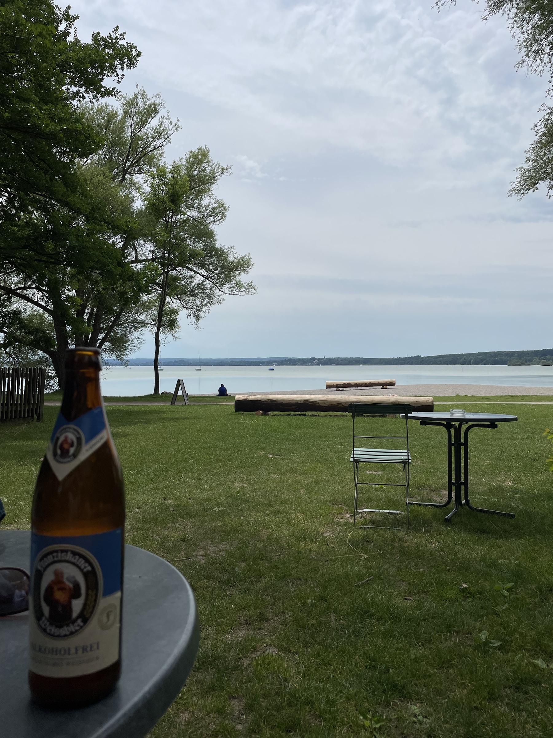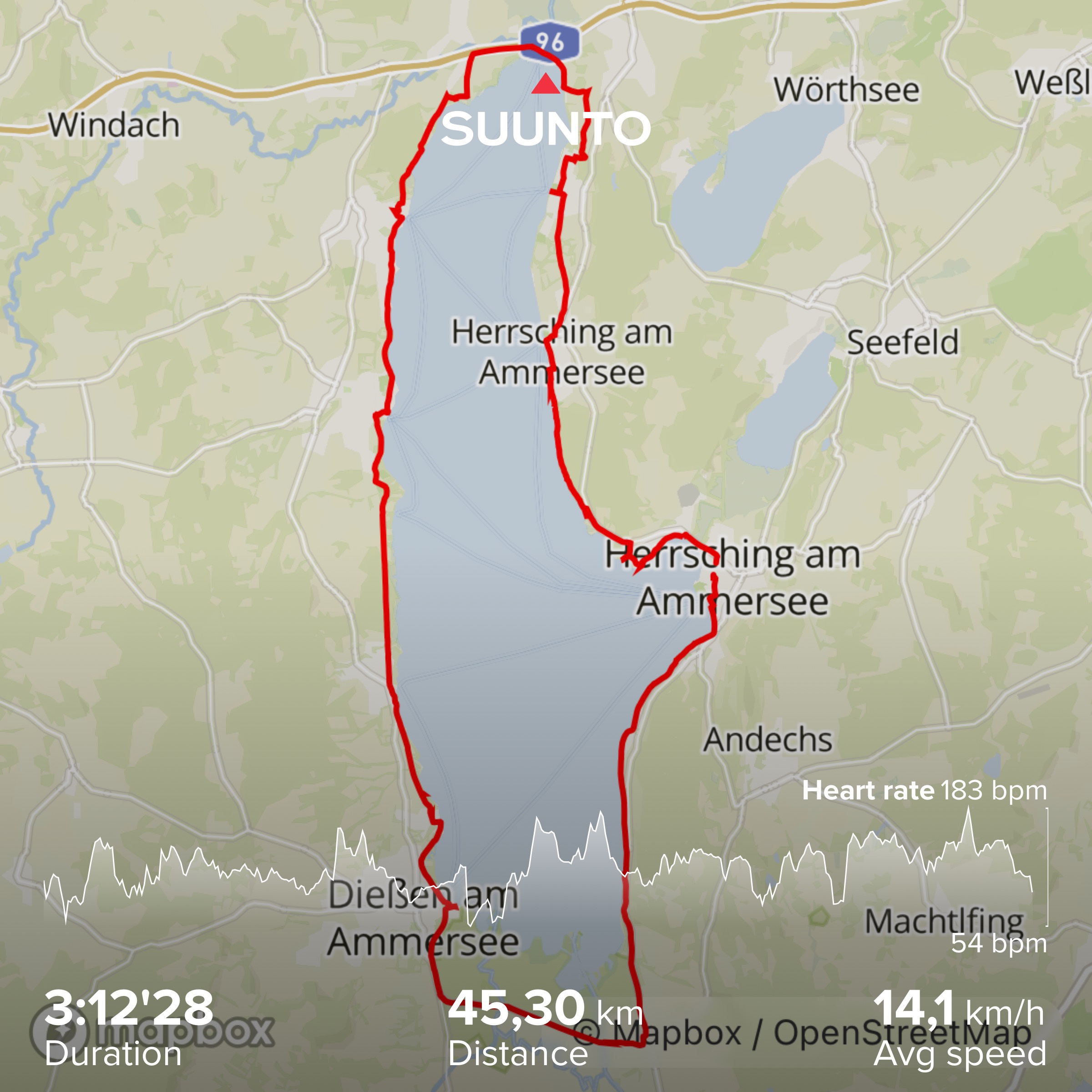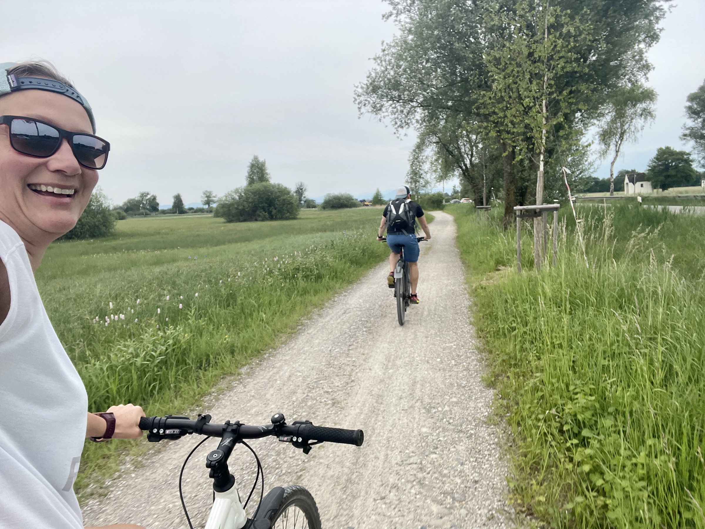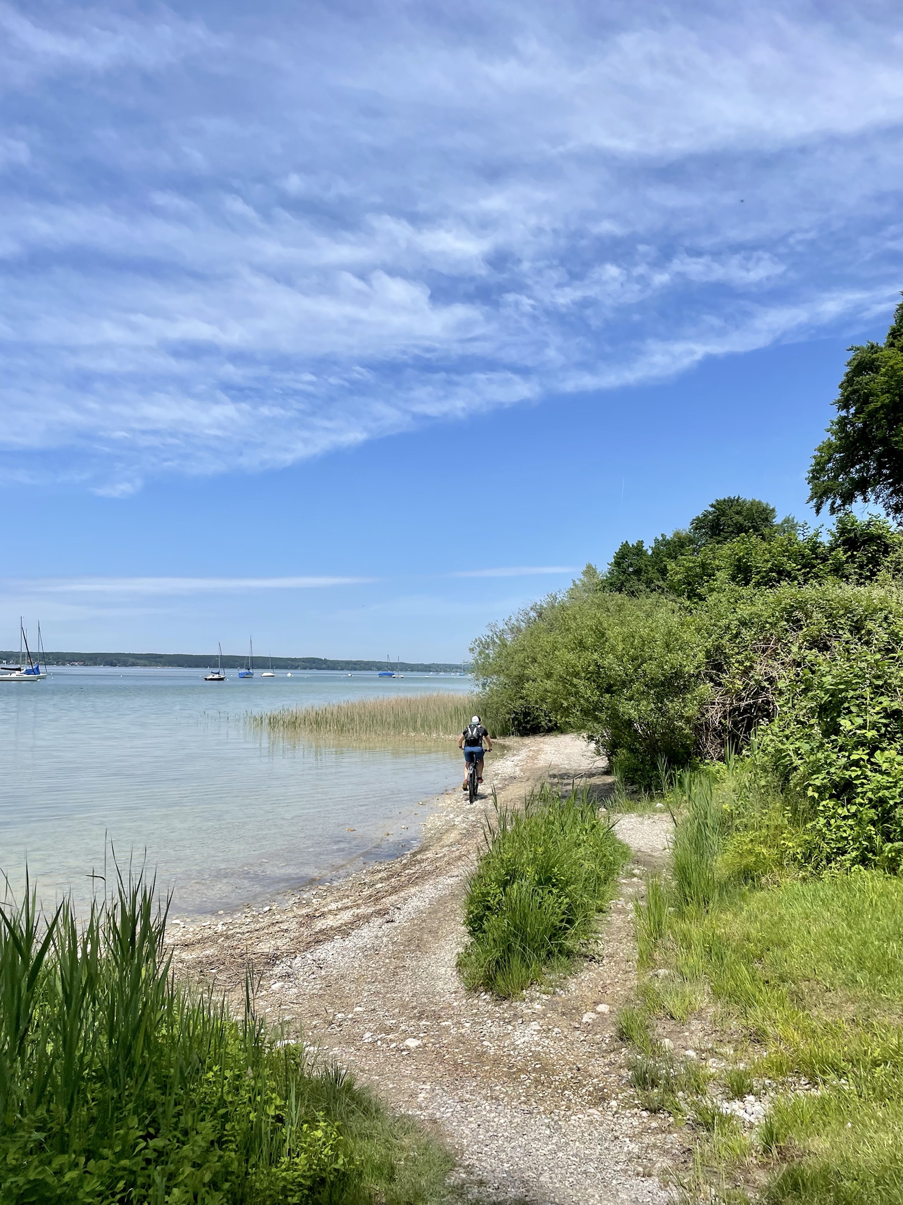 Wycieczka super, gdyż urozmaicona bardzo: najpierw pierwsza kąpiel w tym roku, zaraz za Herrsching, potem chwilę drogą, ale ruch, więc wjechaliśmy w las a tam trail na maxa, błoto i korzenie i piękna zieloność – ale duszno też. Potem trochę motania się w Breitbrunn, ale od wyjazdu na Inning już prosta sprawa. Piękne widoki po drodze, na jezioro i mega hacjendy: jery, ile tam jest pięknych willi! I wszystkie z prywatnym pomostem… Jest też kilka fajnych plaż po drodze (zanotowanych na przyszłość!) . Po 30km przystanek na frytki w St. Alban. No i na koniec browarek w Generalnym Konsulacie w Herrsching, zakupili wędzoną rybkę na kolację i wiu S8 do domu. Wpadliśmy do domu po 18 i się rozpadało na maxa – idealny timing! I idealny piątunio, cudnie było 😍