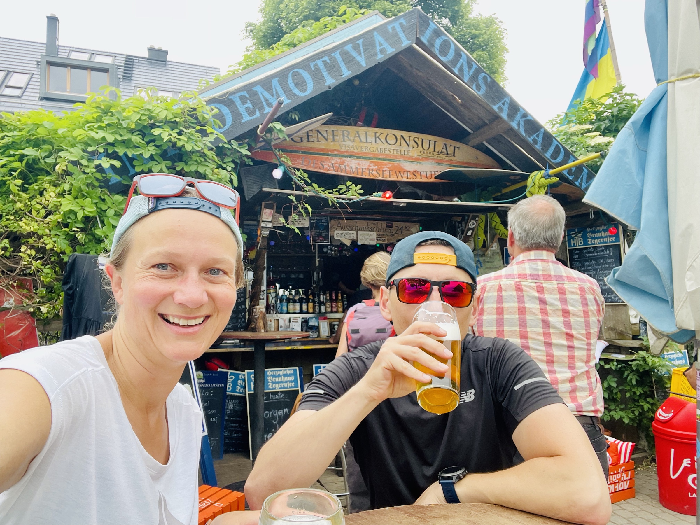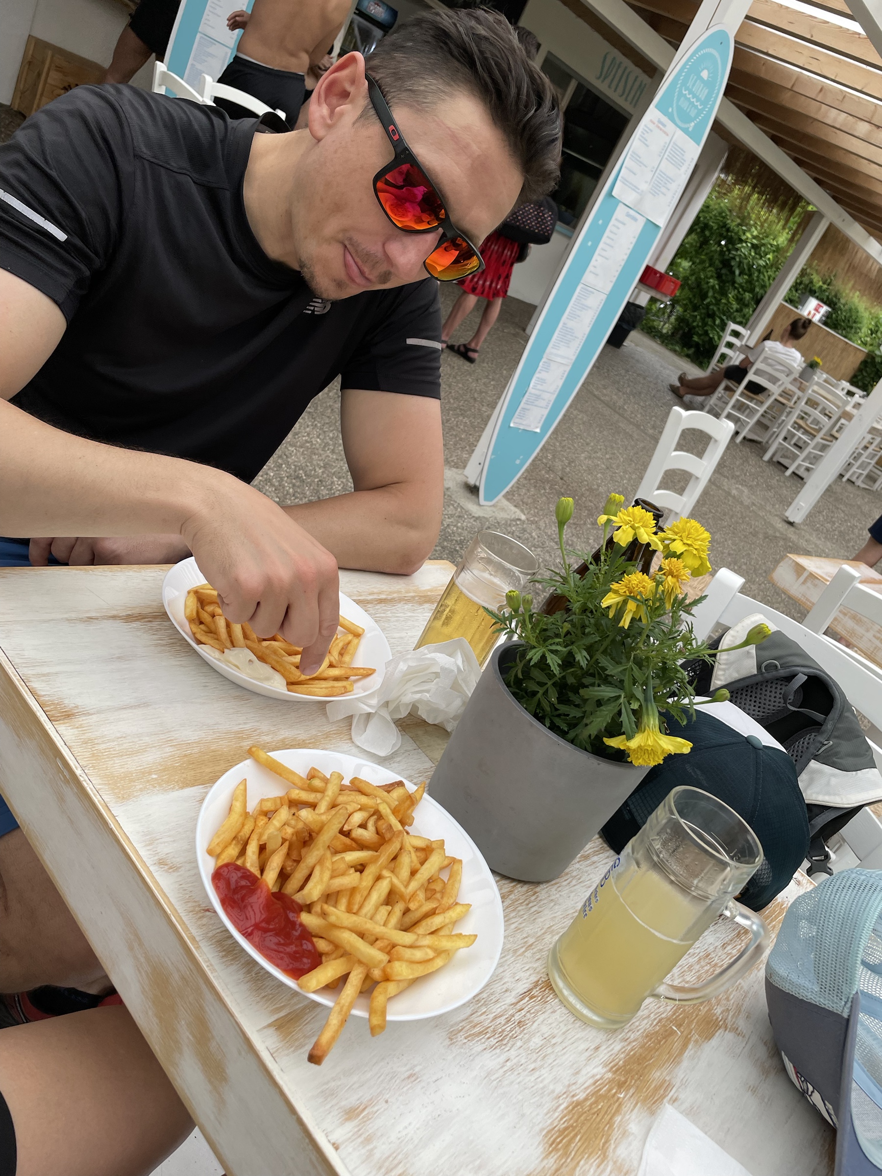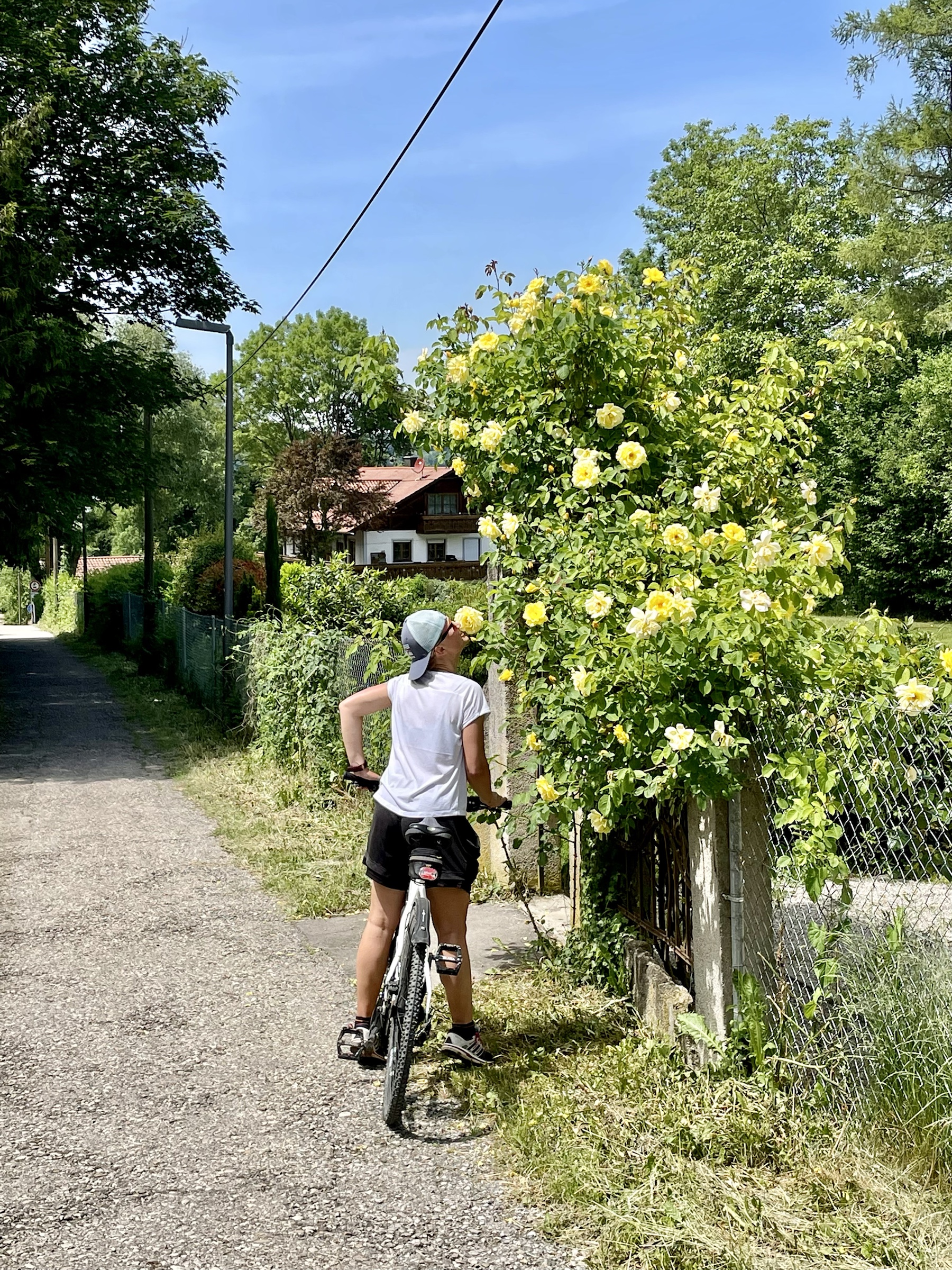 Wycieczka super, gdyż urozmaicona bardzo: najpierw pierwsza kąpiel w tym roku, zaraz za Herrsching, potem chwilę drogą, ale ruch, więc wjechaliśmy w las a tam trail na maxa, błoto i korzenie i piękna zieloność – ale duszno też. Potem trochę motania się w Breitbrunn, ale od wyjazdu na Inning już prosta sprawa. Piękne widoki po drodze, na jezioro i mega hacjendy: jery, ile tam jest pięknych willi! I wszystkie z prywatnym pomostem… Jest też kilka fajnych plaż po drodze (zanotowanych na przyszłość!) . Po 30km przystanek na frytki w St. Alban. No i na koniec browarek w Generalnym Konsulacie w Herrsching, zakupili wędzoną rybkę na kolację i wiu S8 do domu. Wpadliśmy do domu po 18 i się rozpadało na maxa – idealny timing! I idealny piątunio, cudnie było 😍