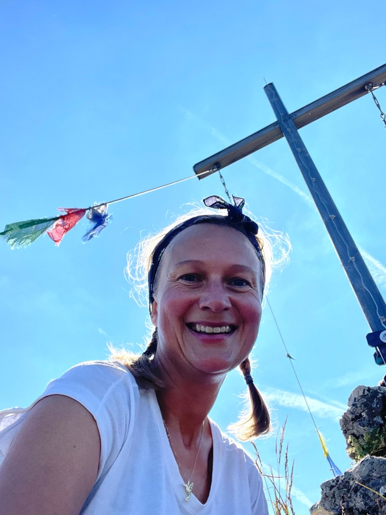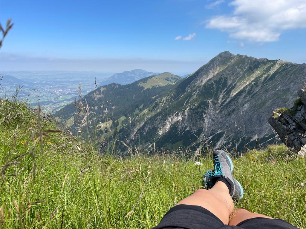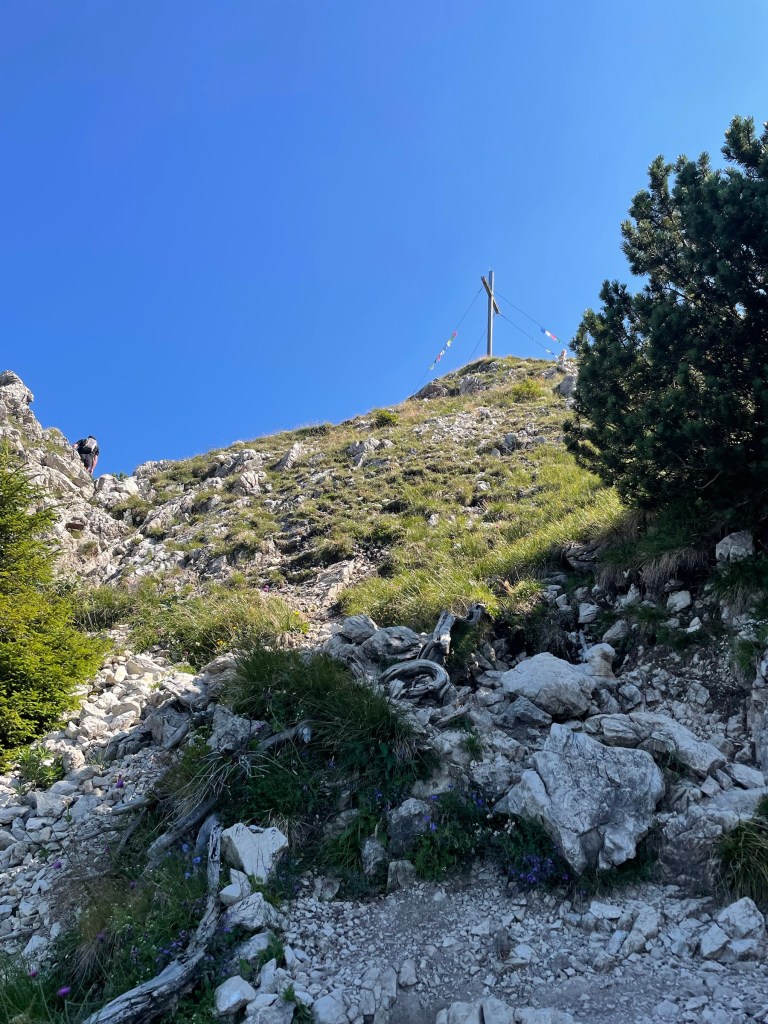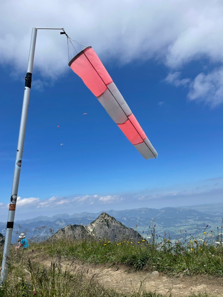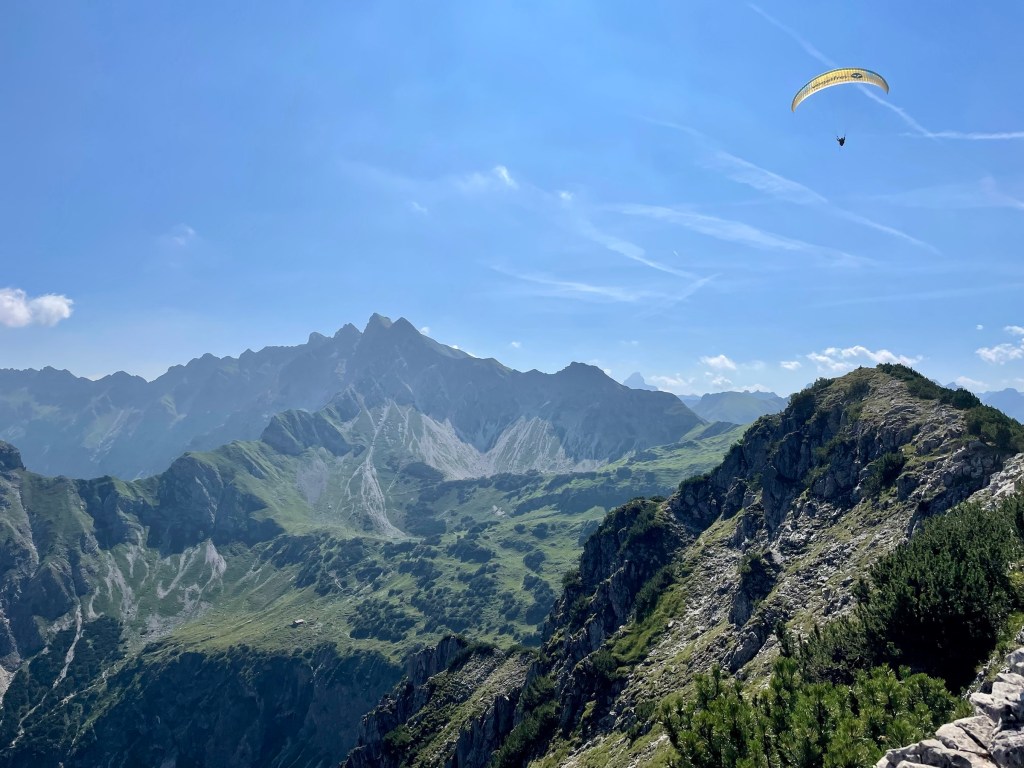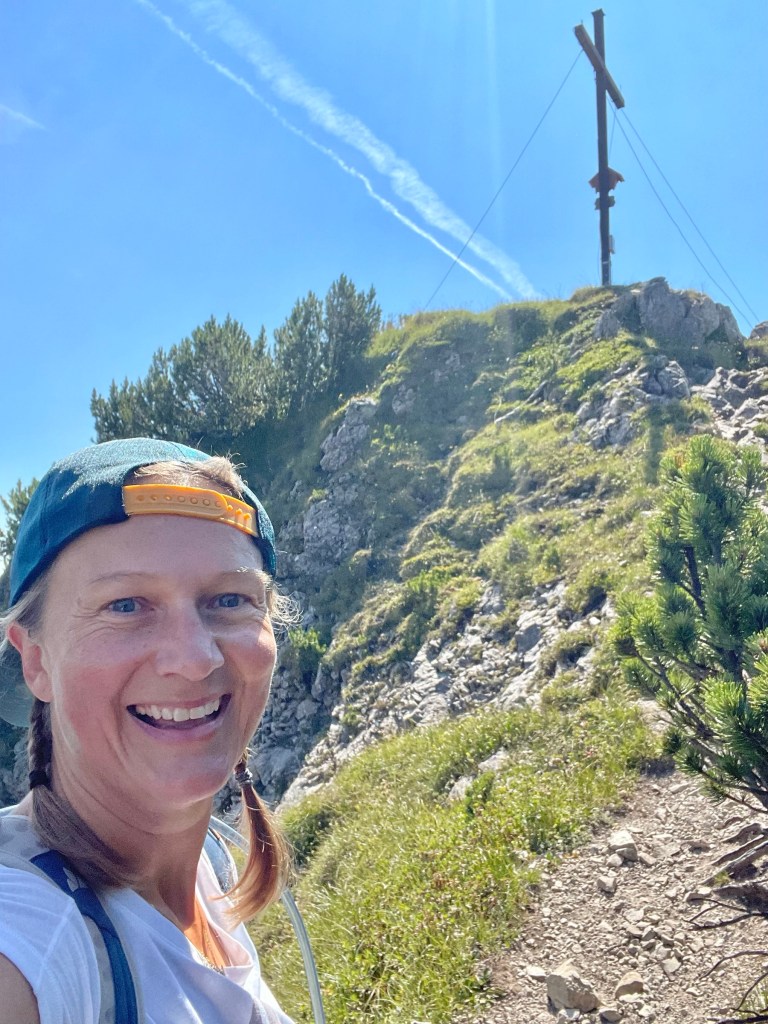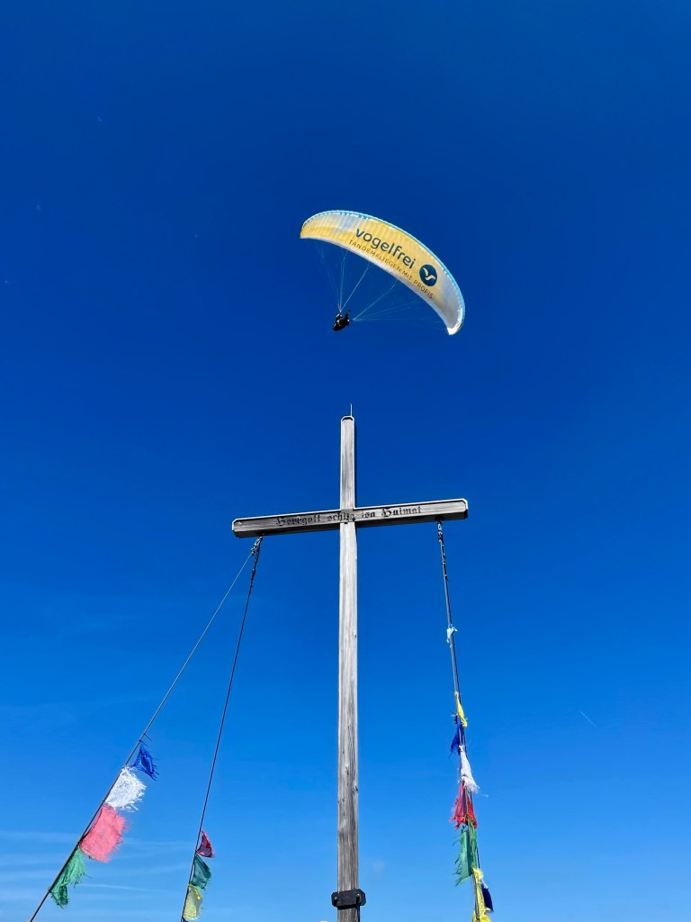 Getting to Gaisalpsee and seeing the Rubihorn and waterfall and the green meadows: how magnificent! True gem, this place! From Gaisalpsee it’s 1h up, always in the sun but there was a little breeze so it’s all good. Last meters to the cross are secured with a wire, all easy and the view from there and all the paraglides above, just wow 😍