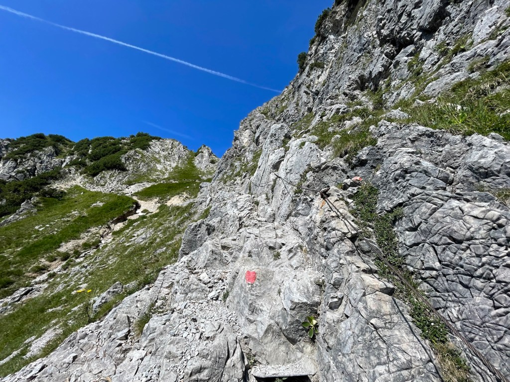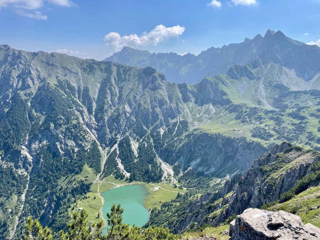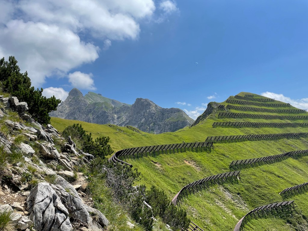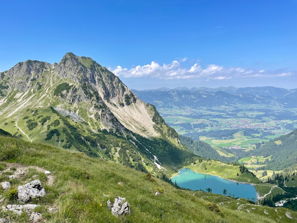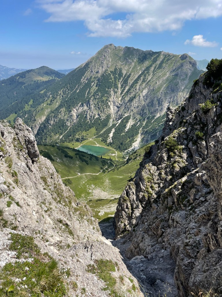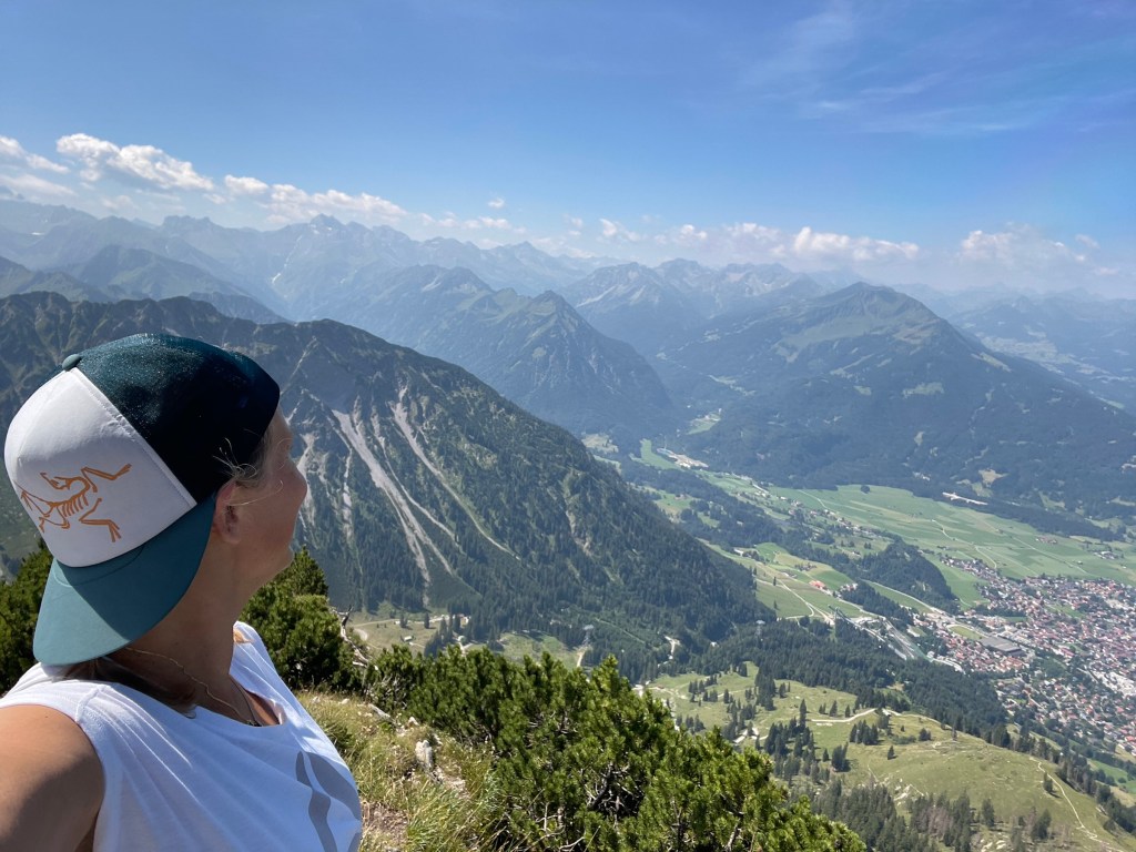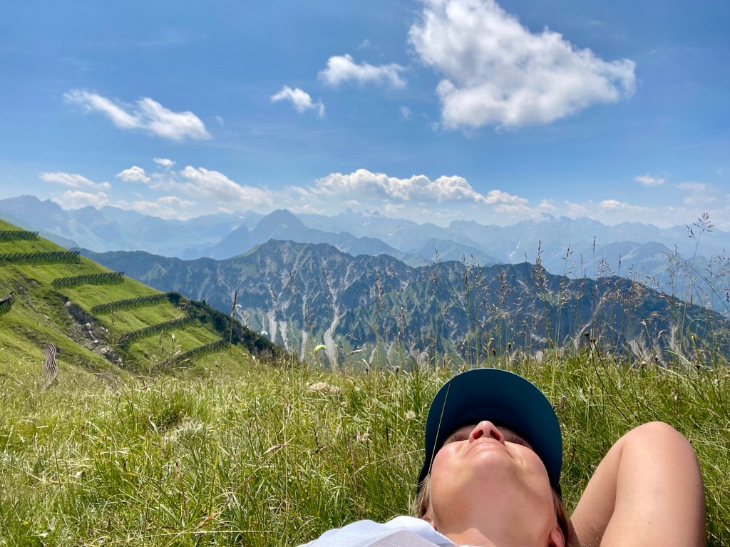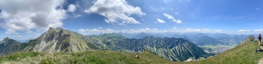 Getting to Gaisalpsee and seeing the Rubihorn and waterfall and the green meadows: how magnificent! True gem, this place! From Gaisalpsee it’s 1h up, always in the sun but there was a little breeze so it’s all good. Last meters to the cross are secured with a wire, all easy and the view from there and all the paraglides above, just wow 😍