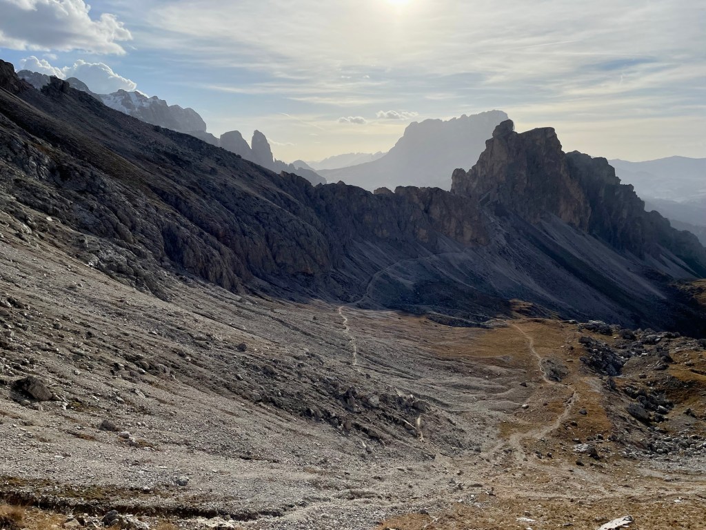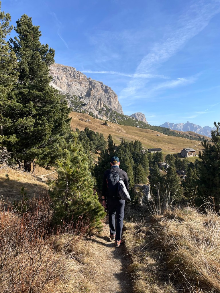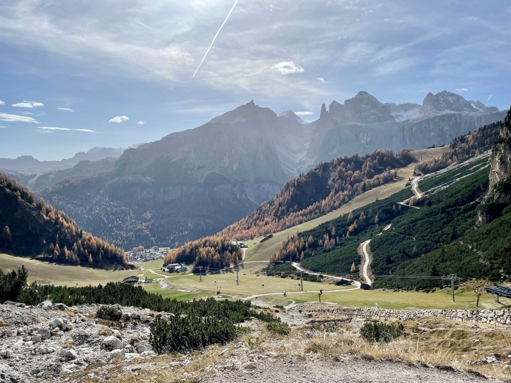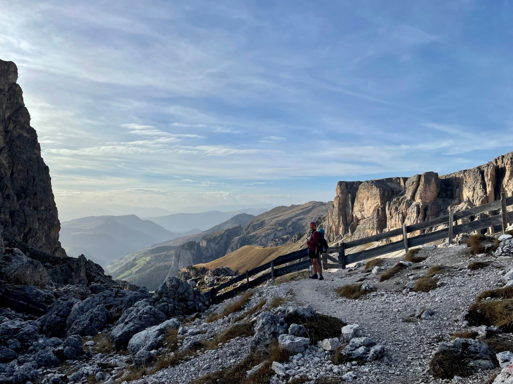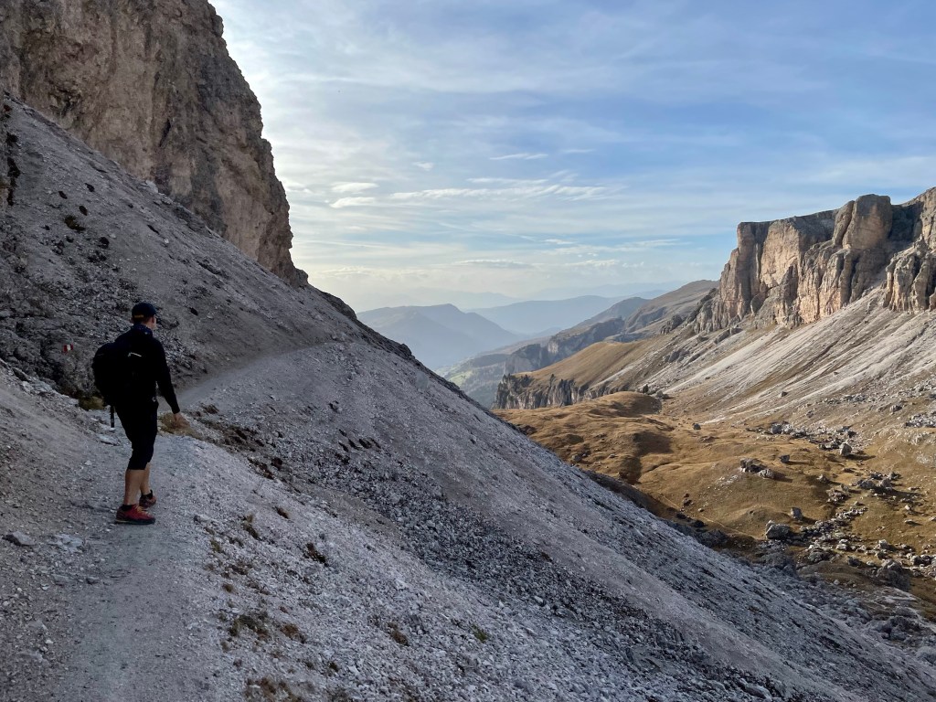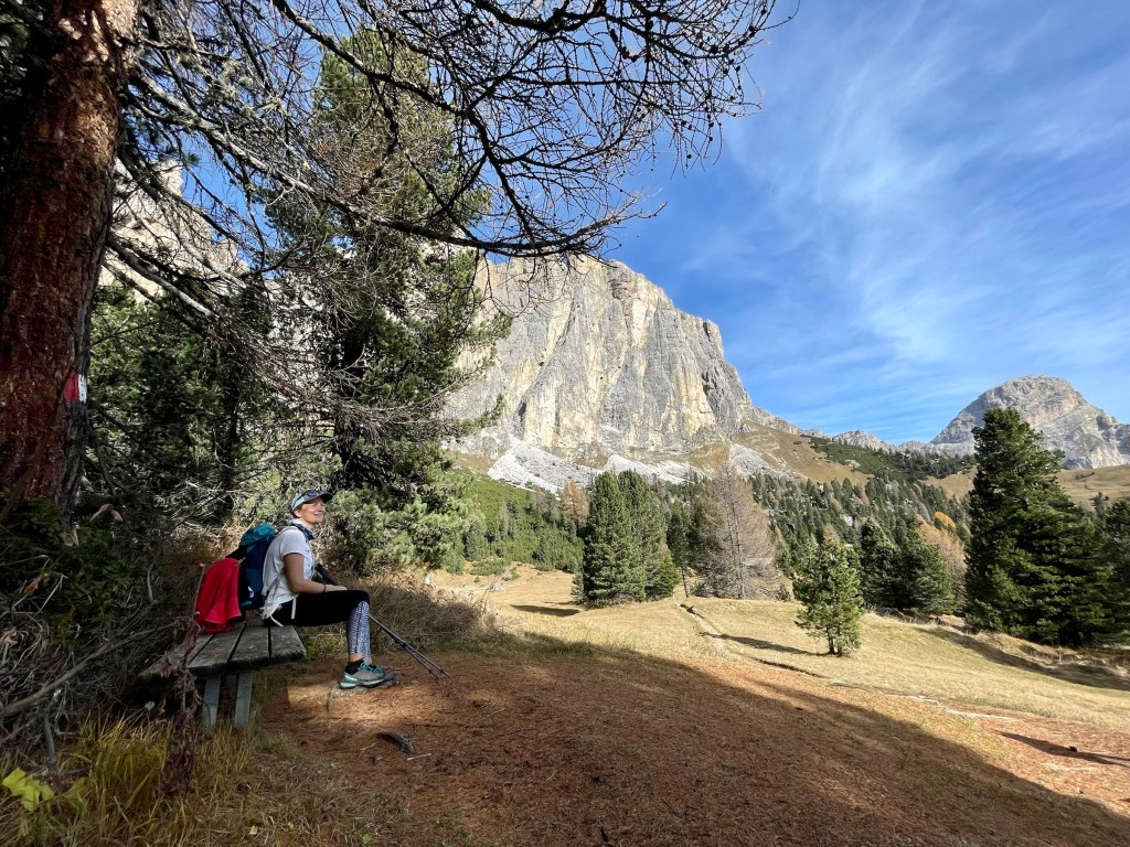 Pierwsza część trasy szła płasko i w dół – gdyż, jak się później okazało, poszliśmy odwrotnie niż sugeruje opis 😅 https://www.alpenvereinaktiv.com/de/tour/sass-da-ciampac-umrundung/40330543/, ale od stacji wyciągu Forcelles zaczęło się darcie pod górę – w pełnym słońcu… Lato pod koniec października!