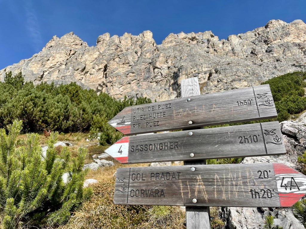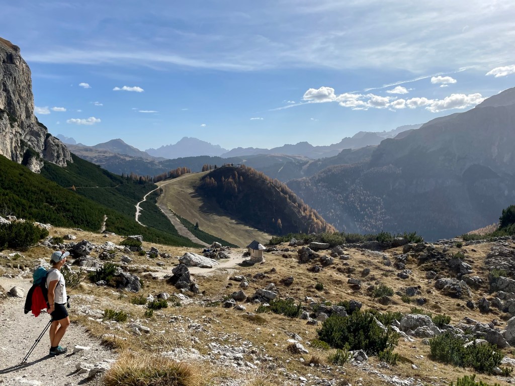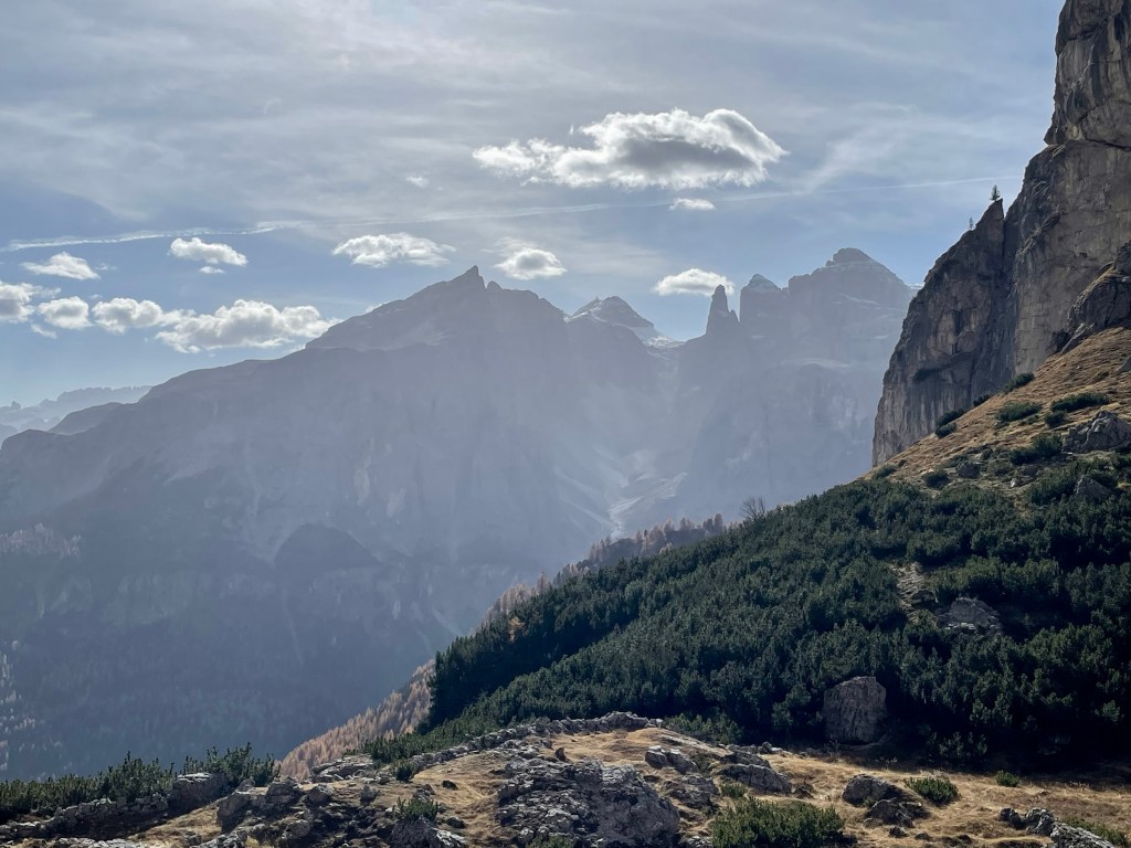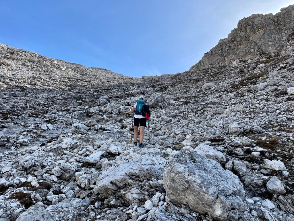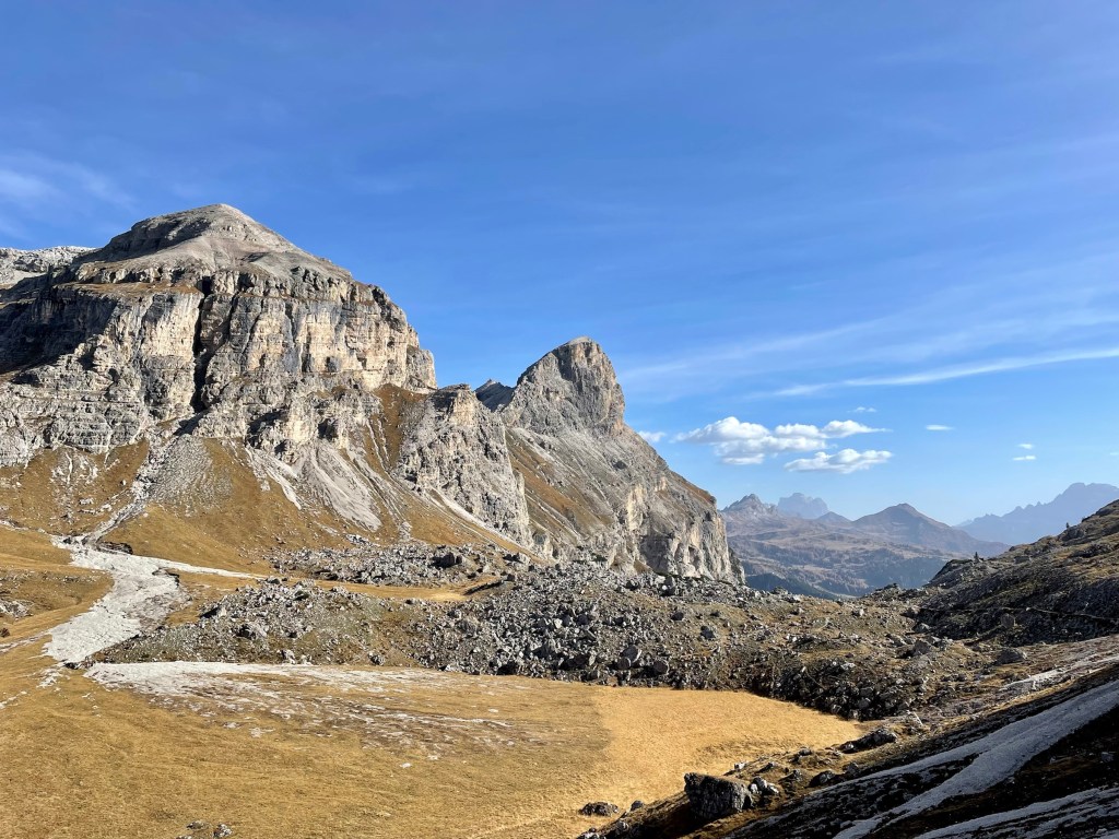 Pierwsza część trasy szła płasko i w dół – gdyż, jak się później okazało, poszliśmy odwrotnie niż sugeruje opis 😅 https://www.alpenvereinaktiv.com/de/tour/sass-da-ciampac-umrundung/40330543/, ale od stacji wyciągu Forcelles zaczęło się darcie pod górę – w pełnym słońcu… Lato pod koniec października!