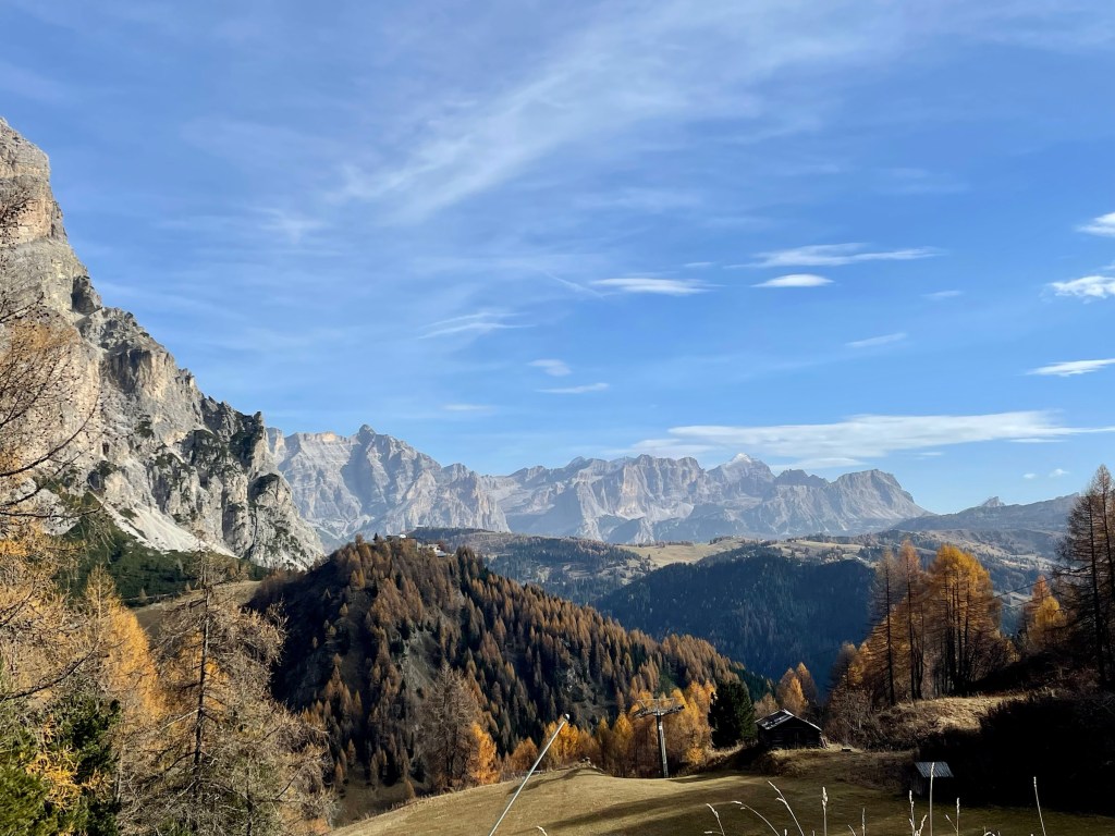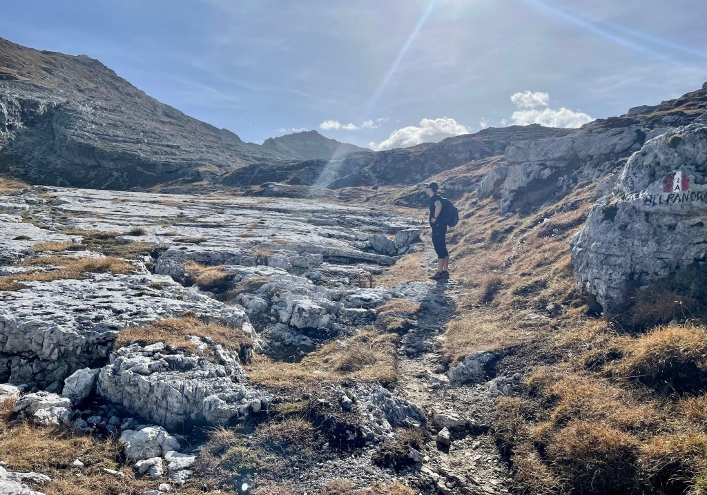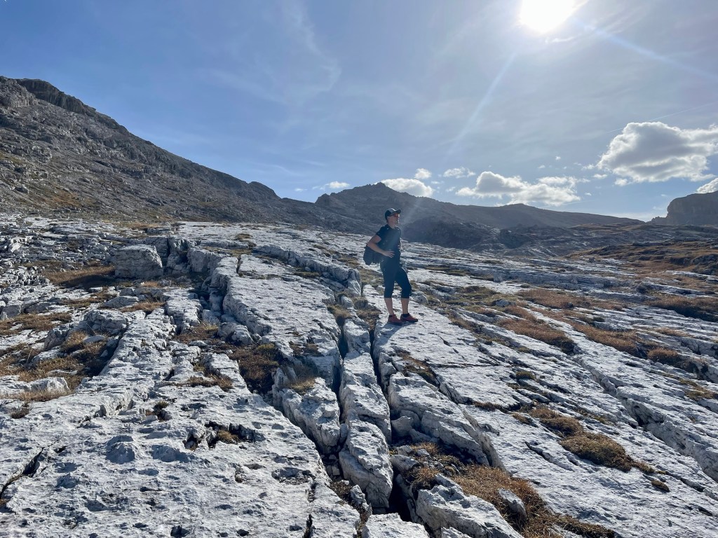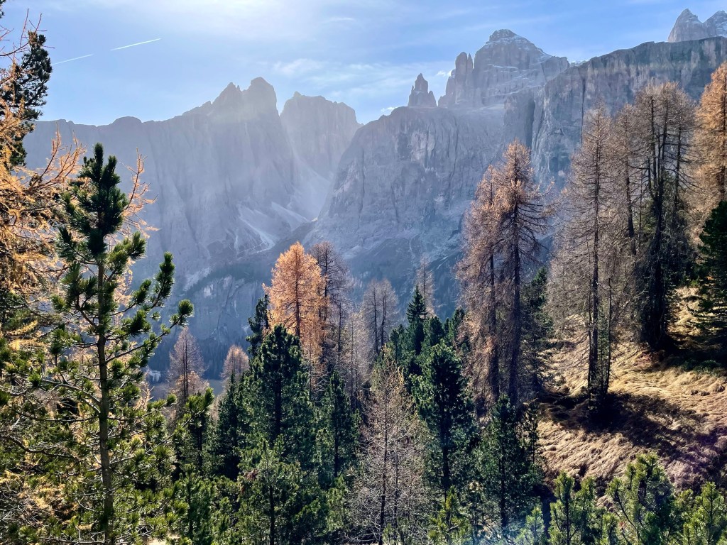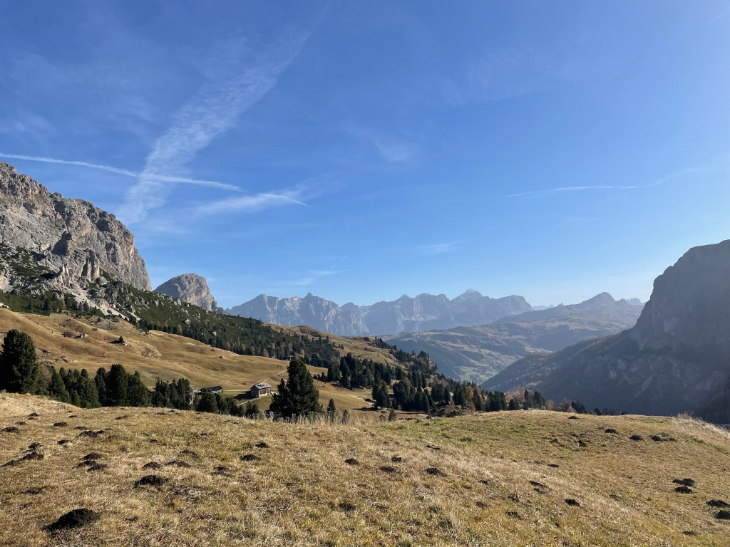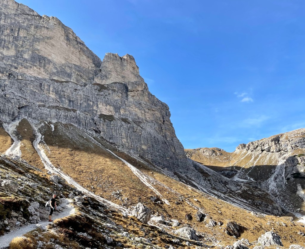Pierwsza część trasy szła płasko i w dół – gdyż, jak się później okazało, poszliśmy odwrotnie niż sugeruje opis 😅 https://www.alpenvereinaktiv.com/de/tour/sass-da-ciampac-umrundung/40330543/, ale od stacji wyciągu Forcelles zaczęło się darcie pod górę – w pełnym słońcu… Lato pod koniec października!
