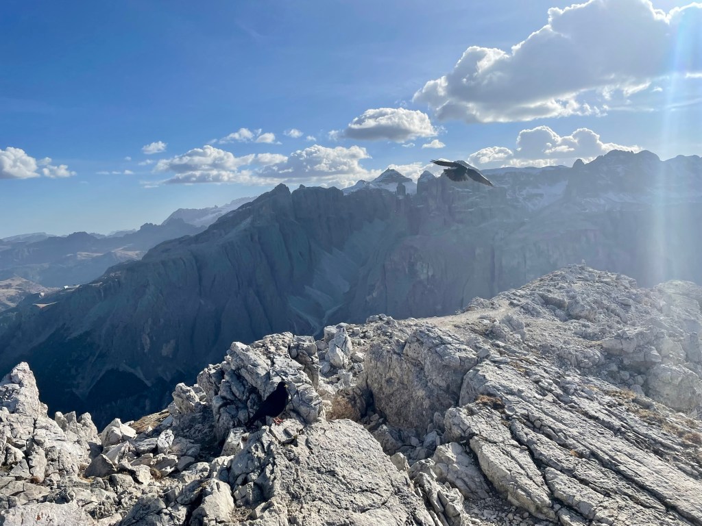 Po drodze zerkaliśmy na trasę na Piz Boé, na który weszliśmy parę lat temu – i nawet było widać parę osób na zygzaku pod górę!