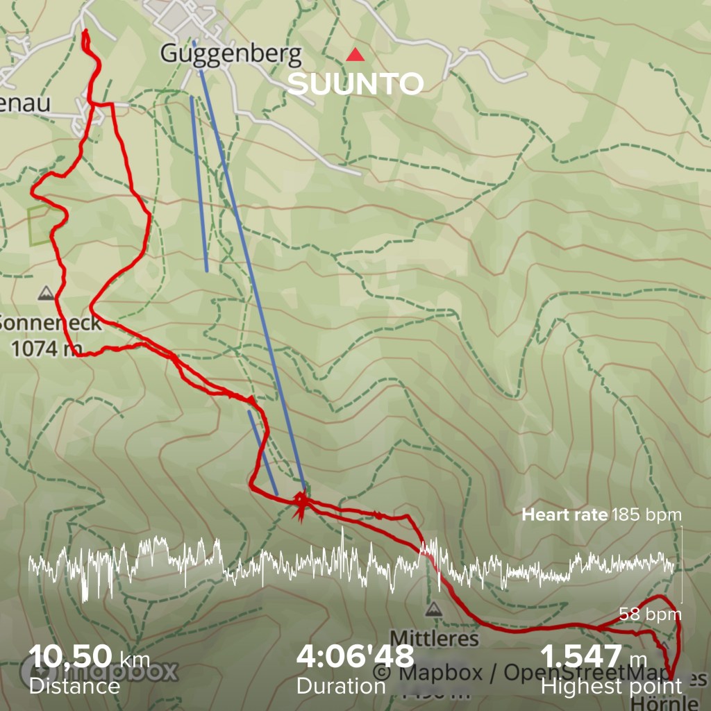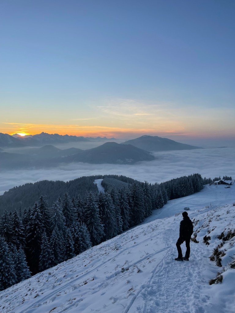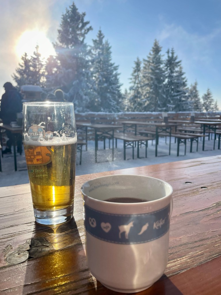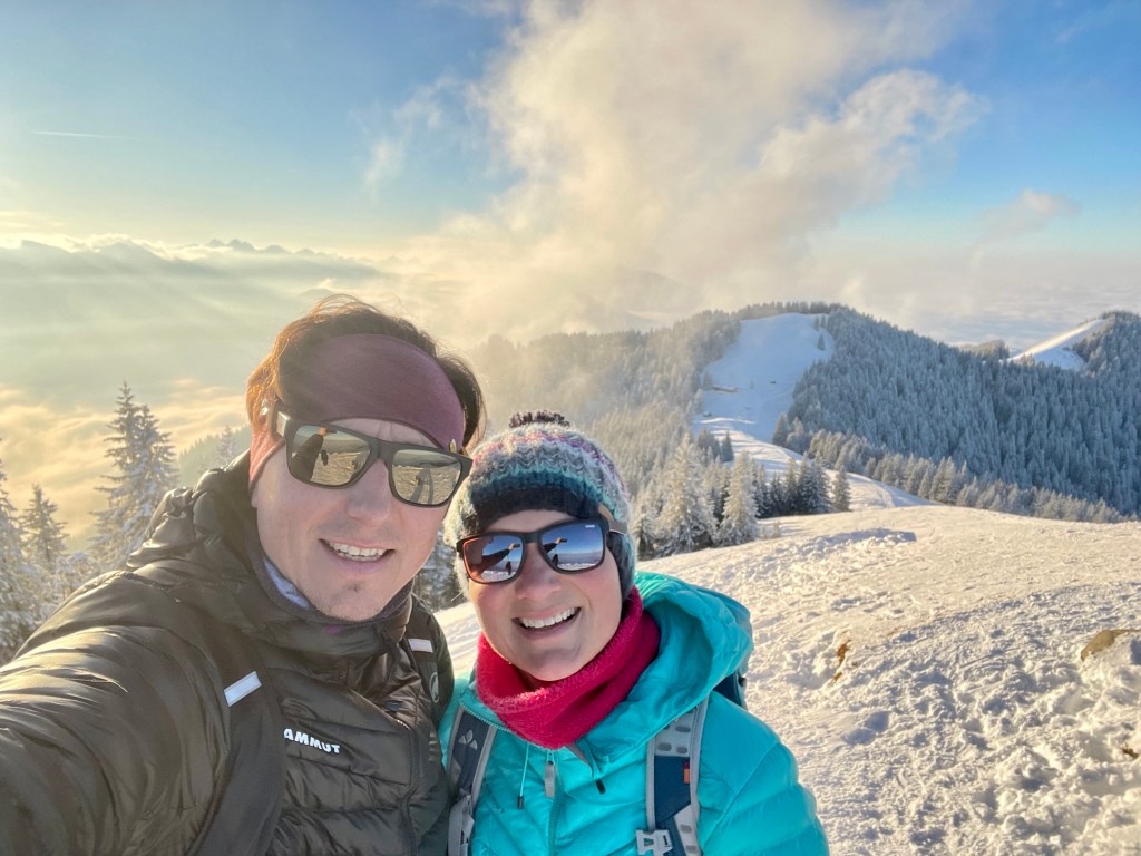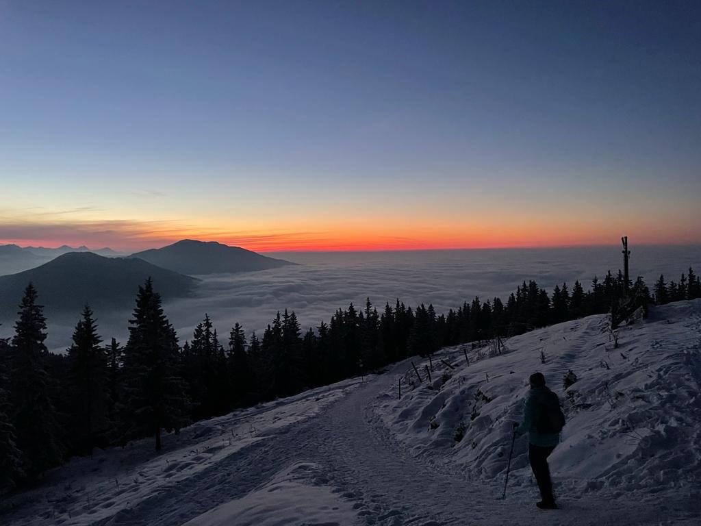 Sądząc po częstotliwości to moja ulubiona górka! W lutym sama, potem w lecie z Ellen, teraz na zachód słońca z M. Owszem, bardzo lubię wszystkie Hörnle, gdyż idealna górka, gdy się rano zerwać nie chce (czyt. ZAWSZE). Jedyne 700m przewyższenia ładnym spacerkiem przez las i po stoku, widoki piękna, fajna huta z dobrym jedzeniem, marzenie! Jak już się kiedyś dorobimy skiturów, to będzie to sobotni klasyk 🙂