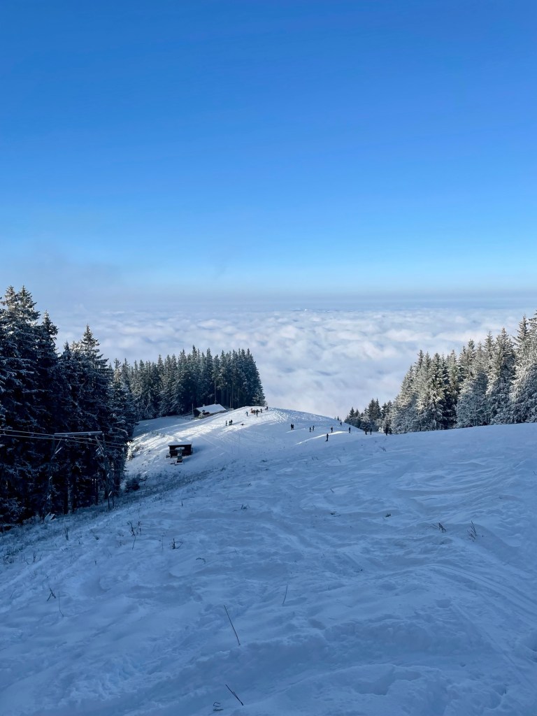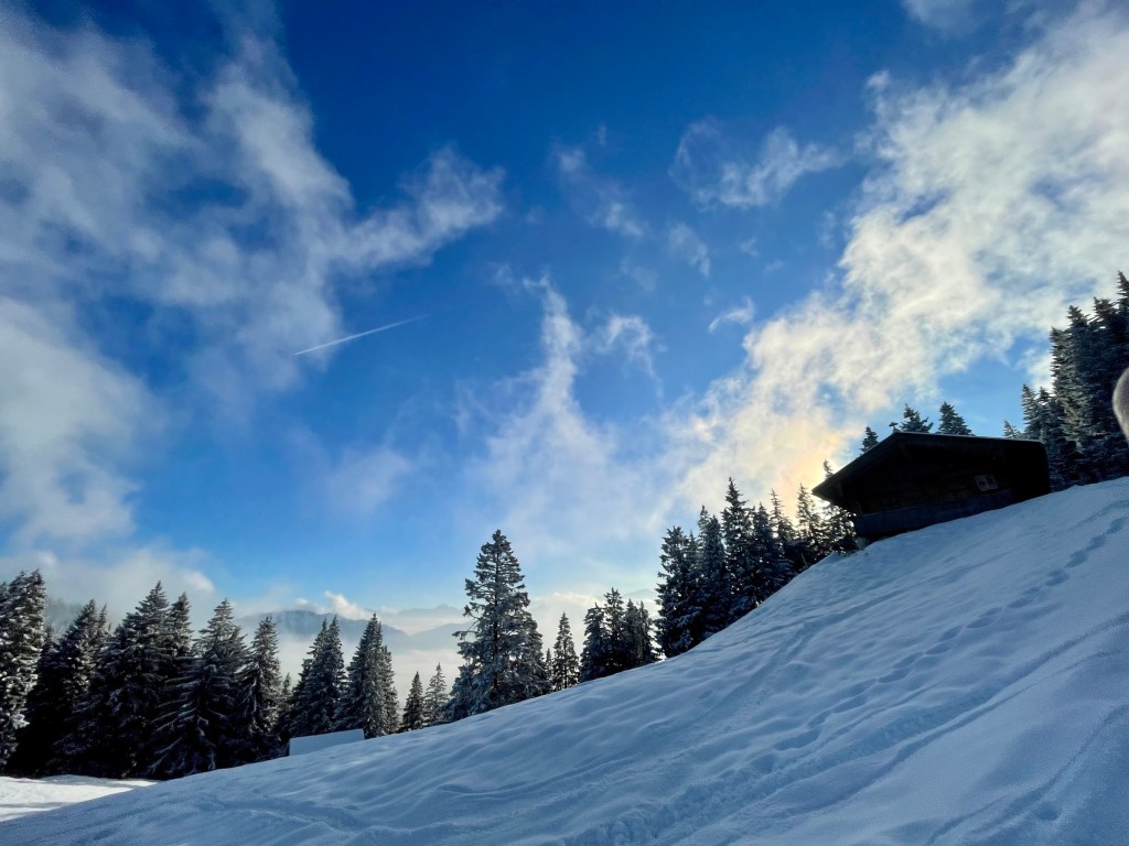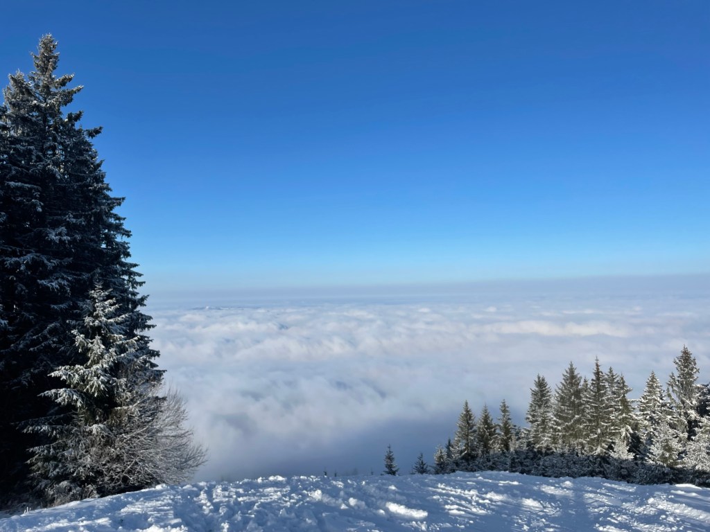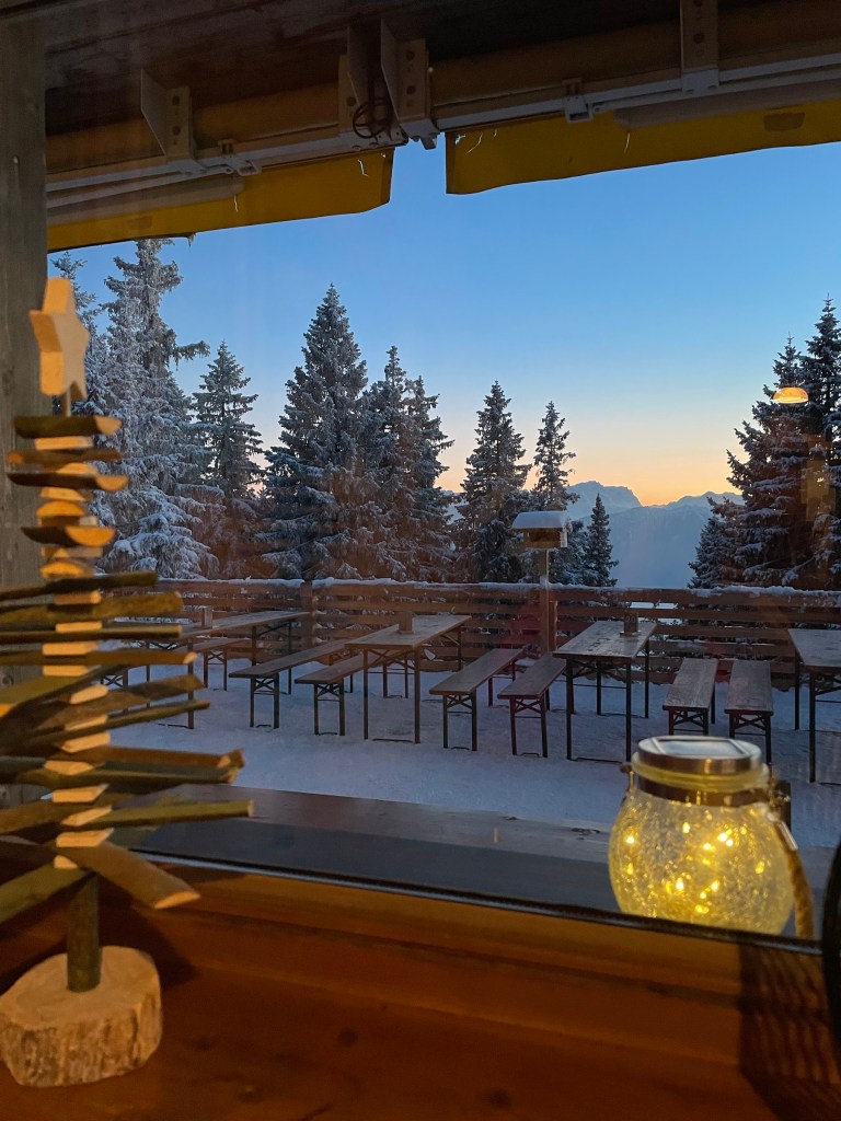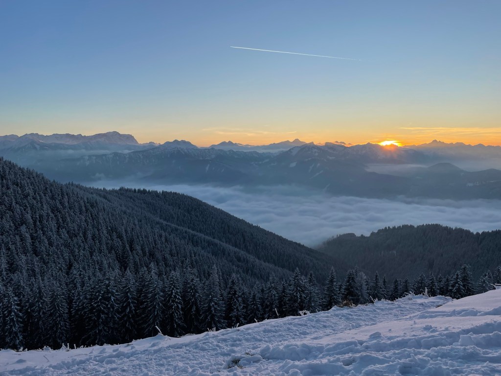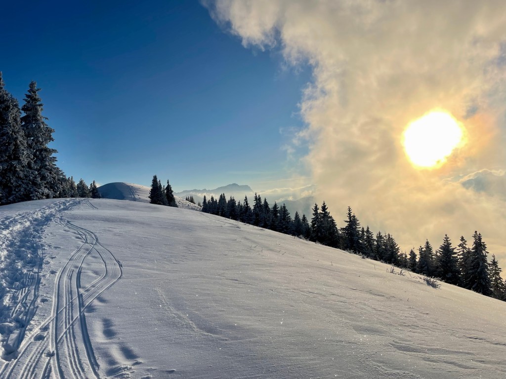 Sądząc po częstotliwości to moja ulubiona górka! W lutym sama, potem w lecie z Ellen, teraz na zachód słońca z M. Owszem, bardzo lubię wszystkie Hörnle, gdyż idealna górka, gdy się rano zerwać nie chce (czyt. ZAWSZE). Jedyne 700m przewyższenia ładnym spacerkiem przez las i po stoku, widoki piękna, fajna huta z dobrym jedzeniem, marzenie! Jak już się kiedyś dorobimy skiturów, to będzie to sobotni klasyk 🙂