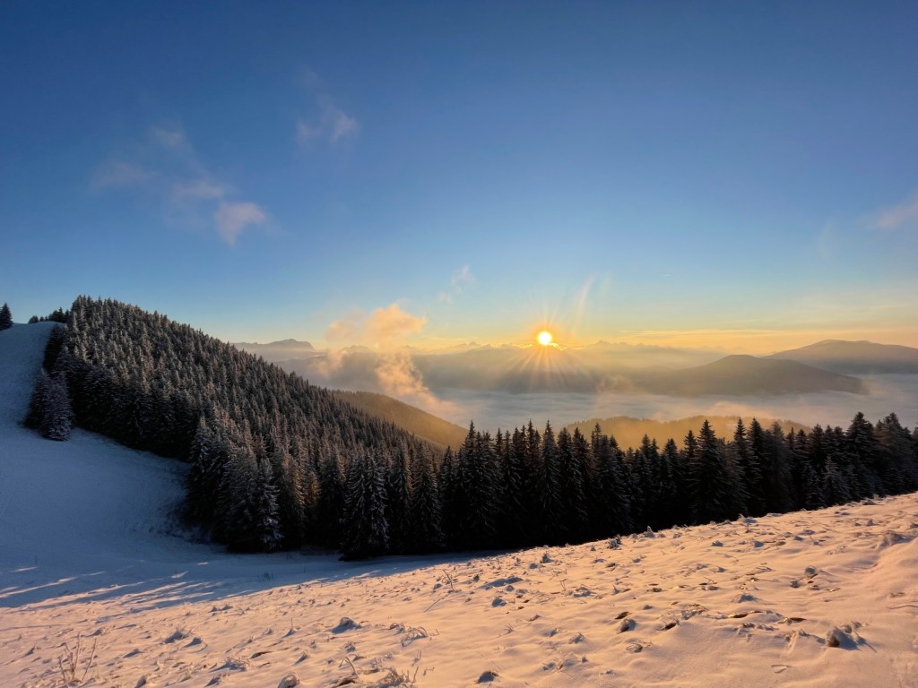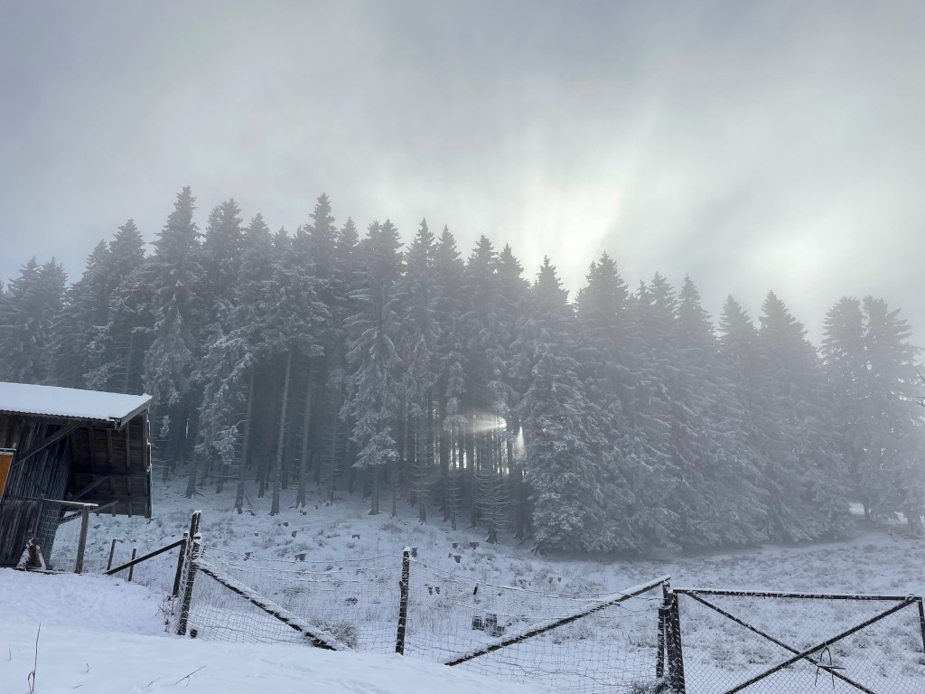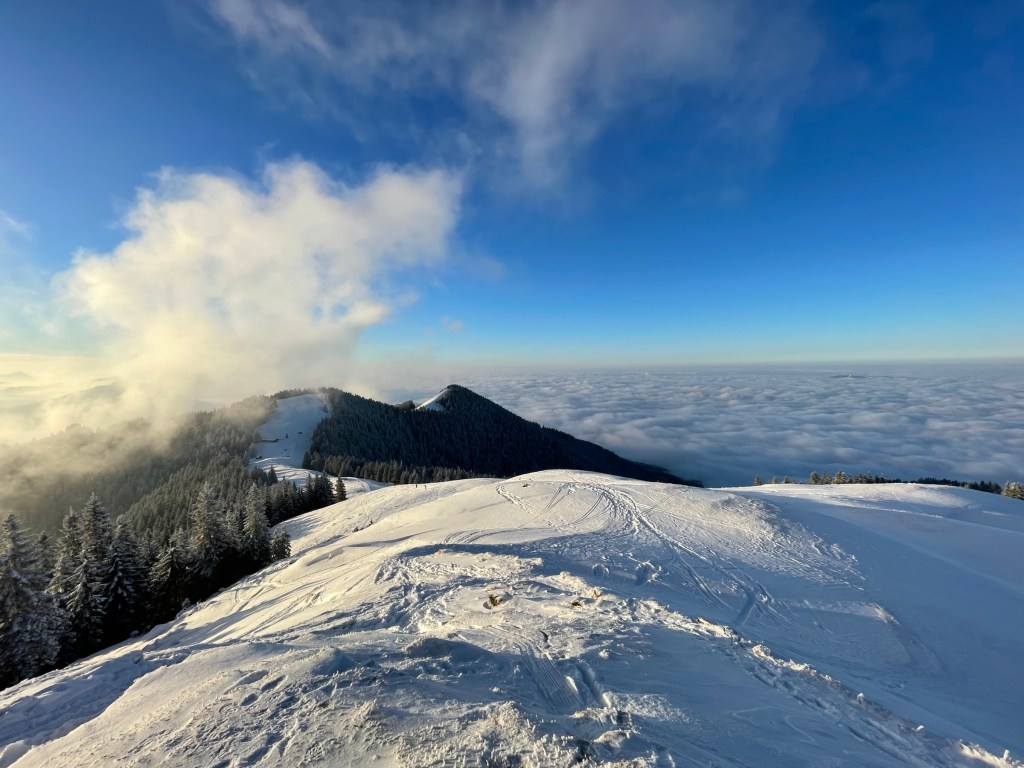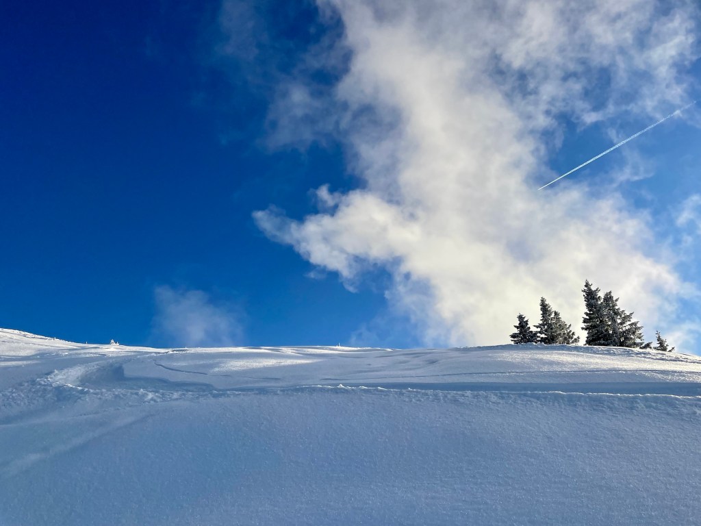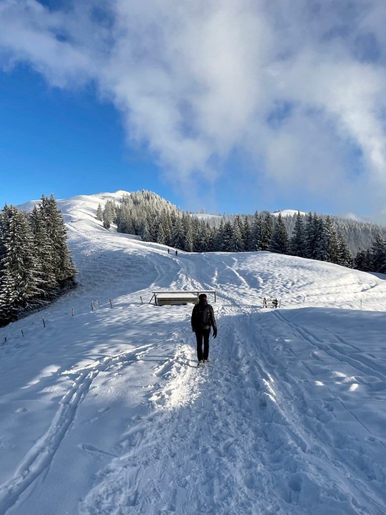 Sądząc po częstotliwości to moja ulubiona górka! W lutym sama, potem w lecie z Ellen, teraz na zachód słońca z M. Owszem, bardzo lubię wszystkie Hörnle, gdyż idealna górka, gdy się rano zerwać nie chce (czyt. ZAWSZE). Jedyne 700m przewyższenia ładnym spacerkiem przez las i po stoku, widoki piękna, fajna huta z dobrym jedzeniem, marzenie! Jak już się kiedyś dorobimy skiturów, to będzie to sobotni klasyk 🙂