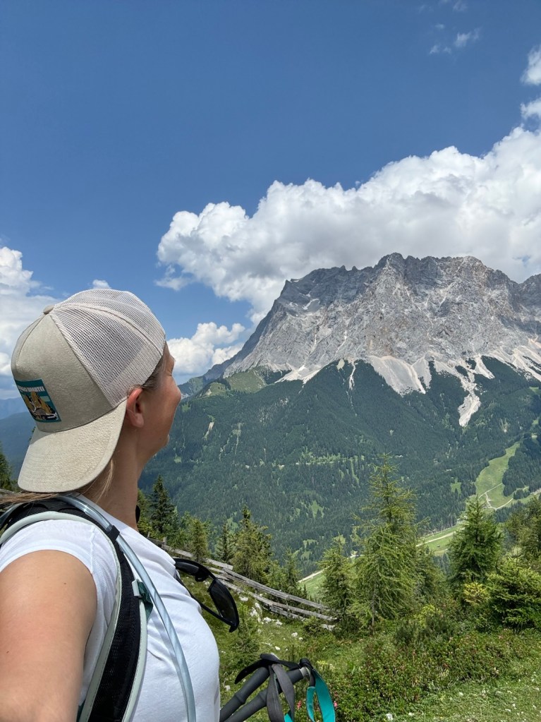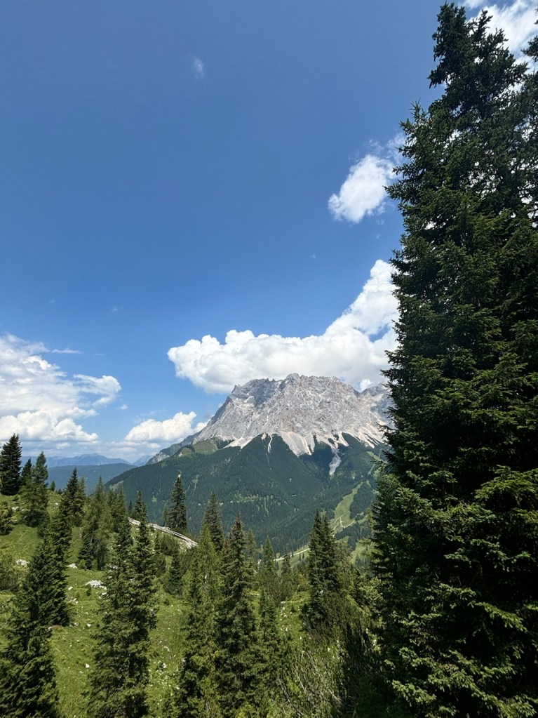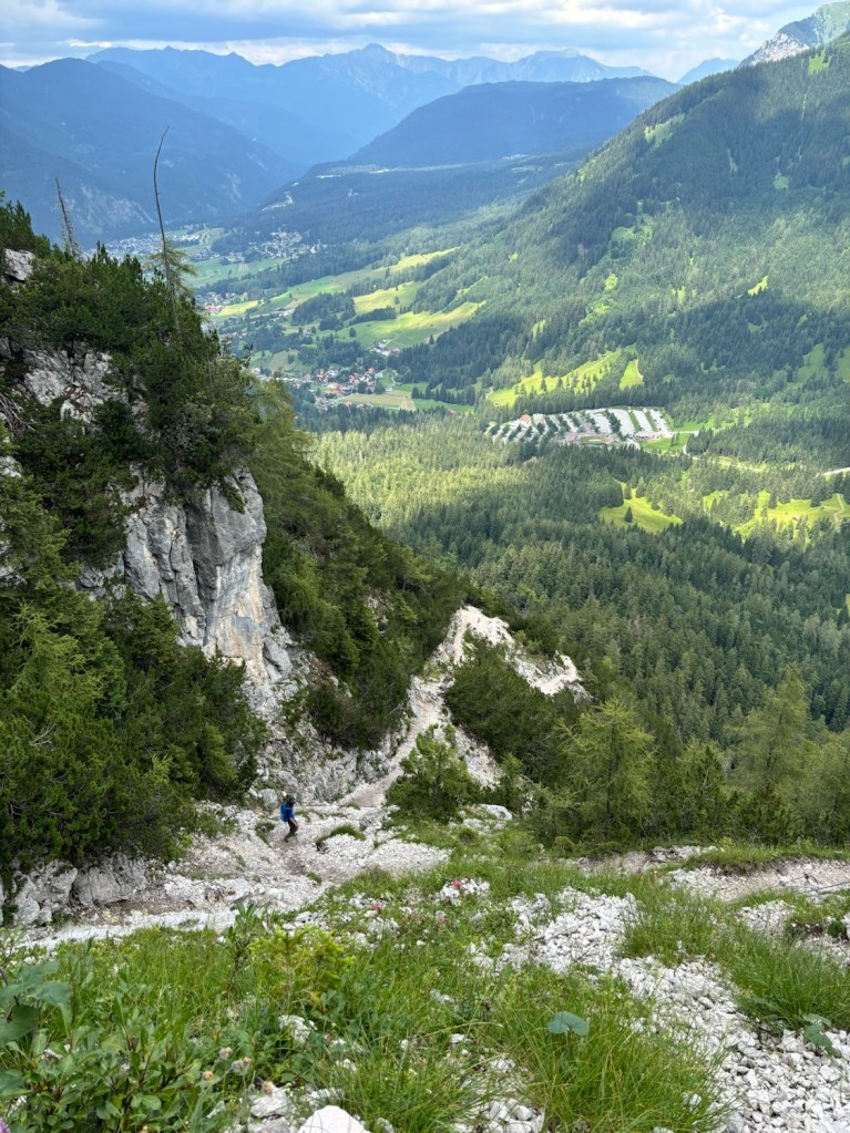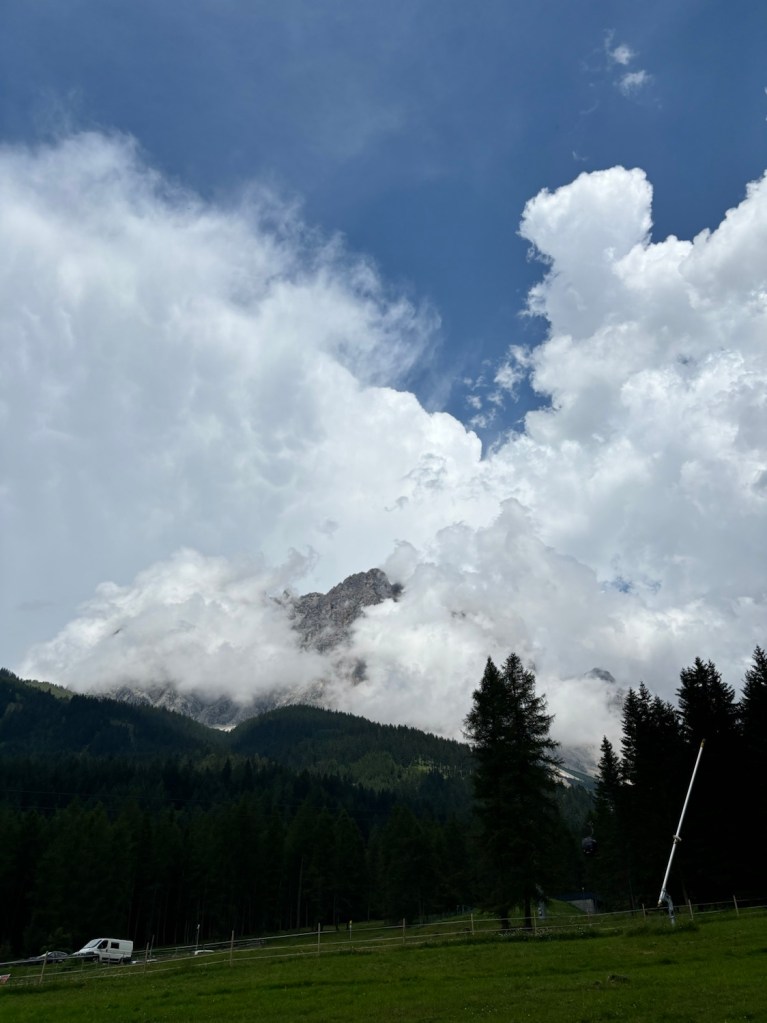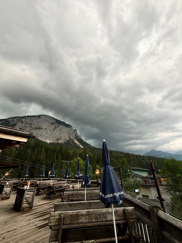 Jery, jaka ulga! Wychodzę z lasu już na piękną pogodę prosto na łąkę z widokiem na Zuga i dopiero tutaj są znaki na „nur für geübter (oder Watt) – dzięki, dobrze wiedzieć 😅 Zaś się chmurzy, ale mimo to postanawiam usiąść w Alm, gdyż głód i zasłużyłam na Radlera! Załatwiam sprawę w 20min, bo niebo zaciąga się w takim tempie, że ledwo dopadam auta i zaczyna padać – a po drodze lać, wiać i sypać gradem! W aucie spędzam 3H – absolutny rekord długości powrotu z Ehrwald. Zmęczenie max, ale warto było! Hoher Gang do powtórki na spokojnie – bo warto 😎