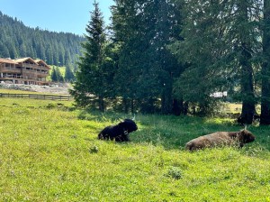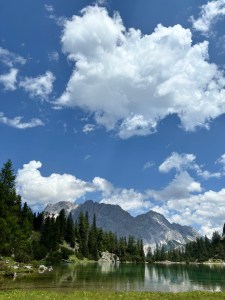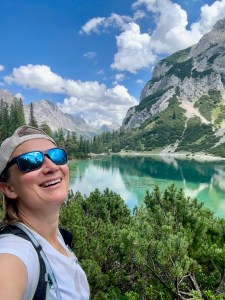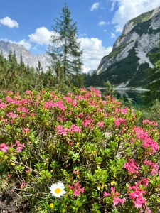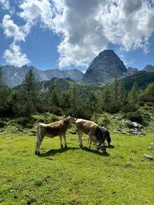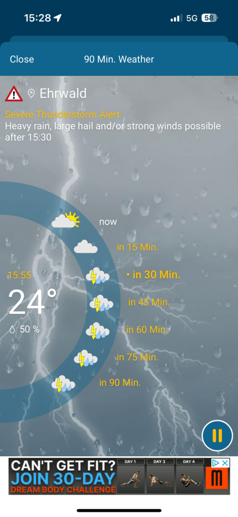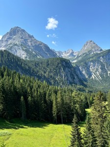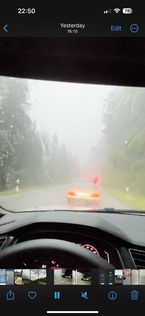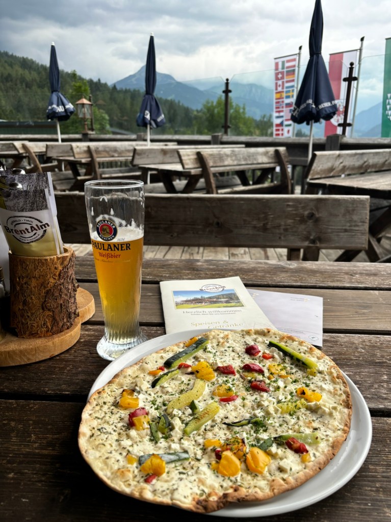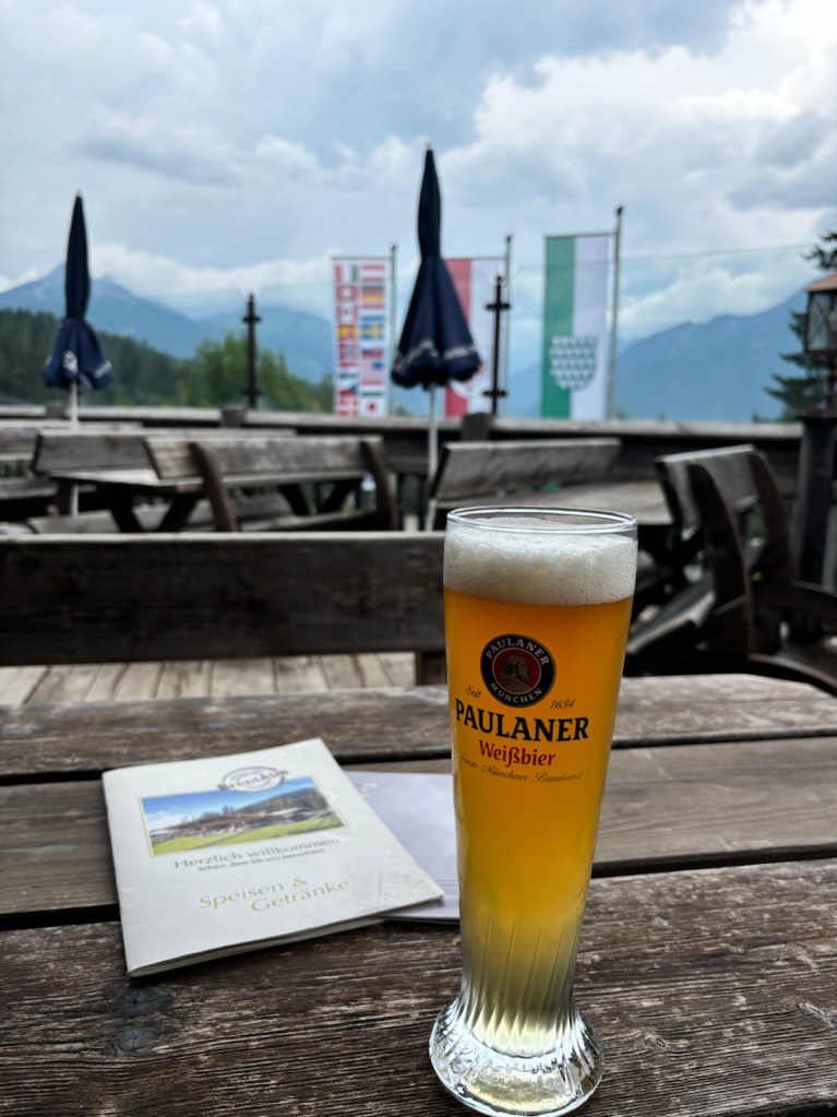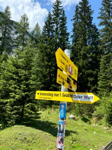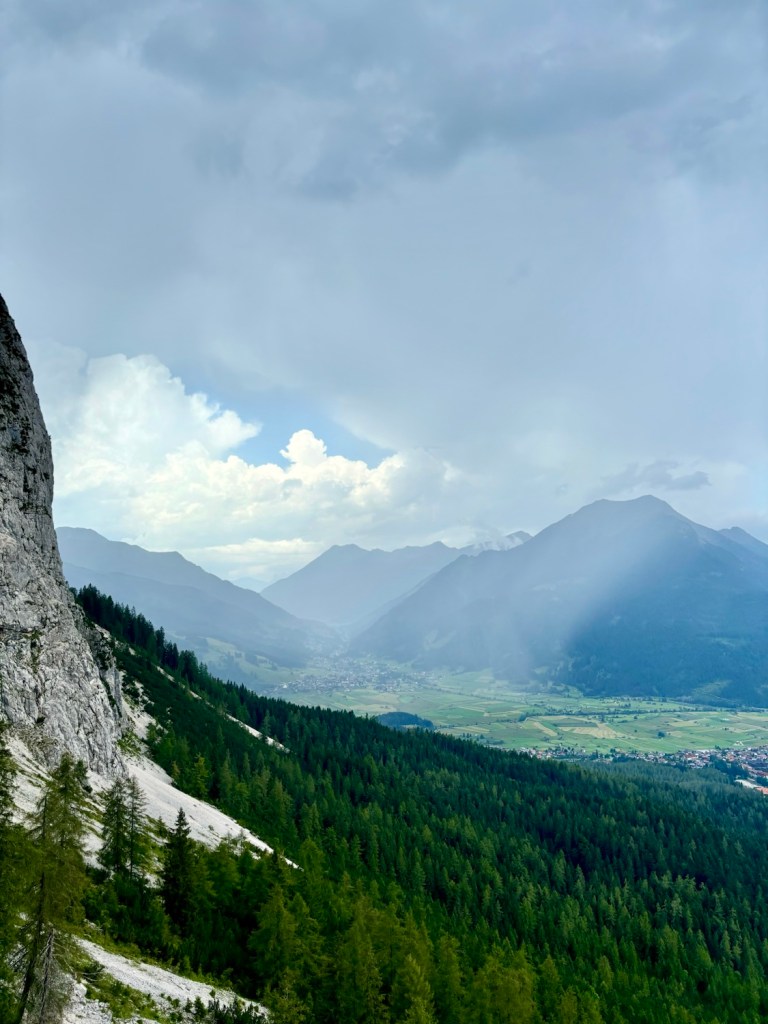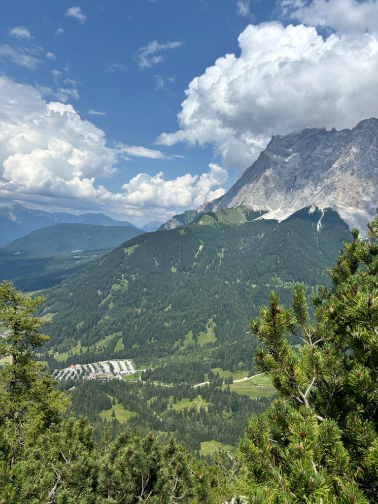 Jery, jaka ulga! Wychodzę z lasu już na piękną pogodę prosto na łąkę z widokiem na Zuga i dopiero tutaj są znaki na „nur für geübter (oder Watt) – dzięki, dobrze wiedzieć 😅 Zaś się chmurzy, ale mimo to postanawiam usiąść w Alm, gdyż głód i zasłużyłam na Radlera! Załatwiam sprawę w 20min, bo niebo zaciąga się w takim tempie, że ledwo dopadam auta i zaczyna padać – a po drodze lać, wiać i sypać gradem! W aucie spędzam 3H – absolutny rekord długości powrotu z Ehrwald. Zmęczenie max, ale warto było! Hoher Gang do powtórki na spokojnie – bo warto 😎