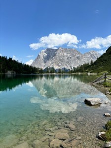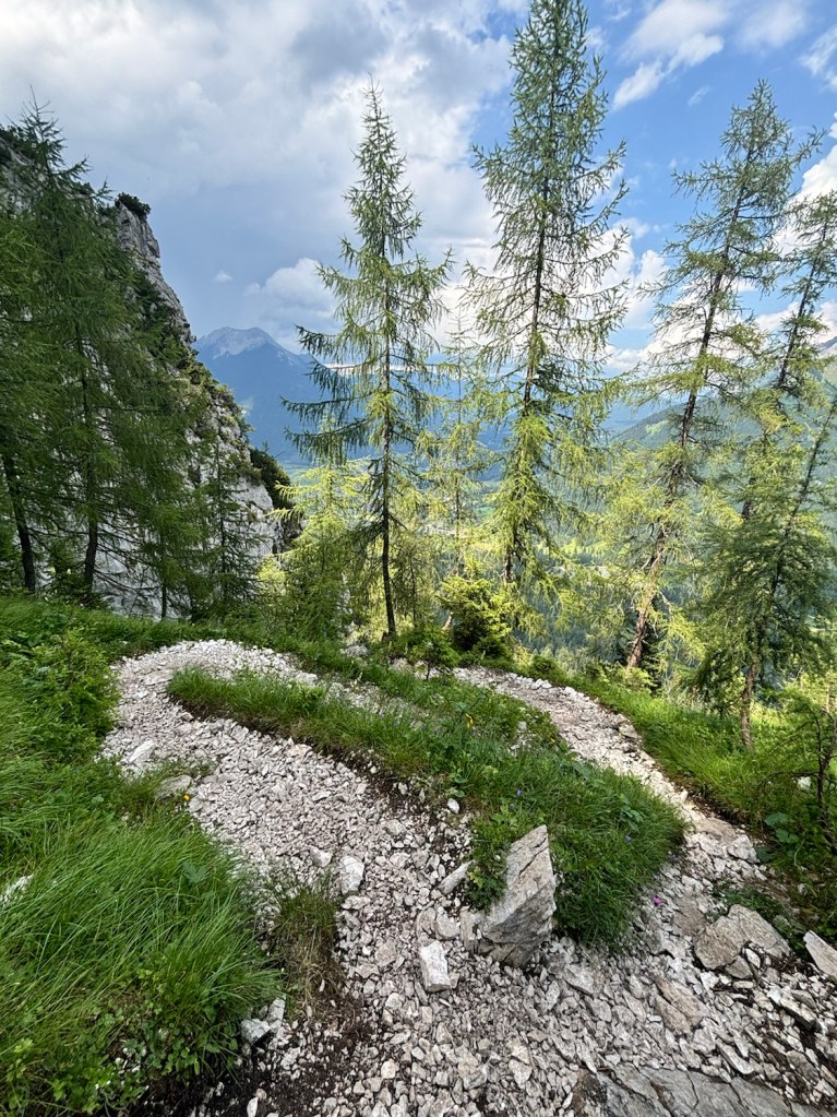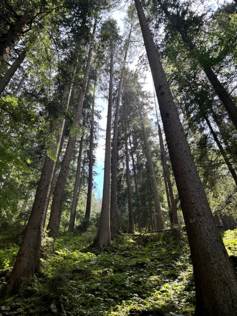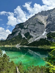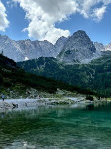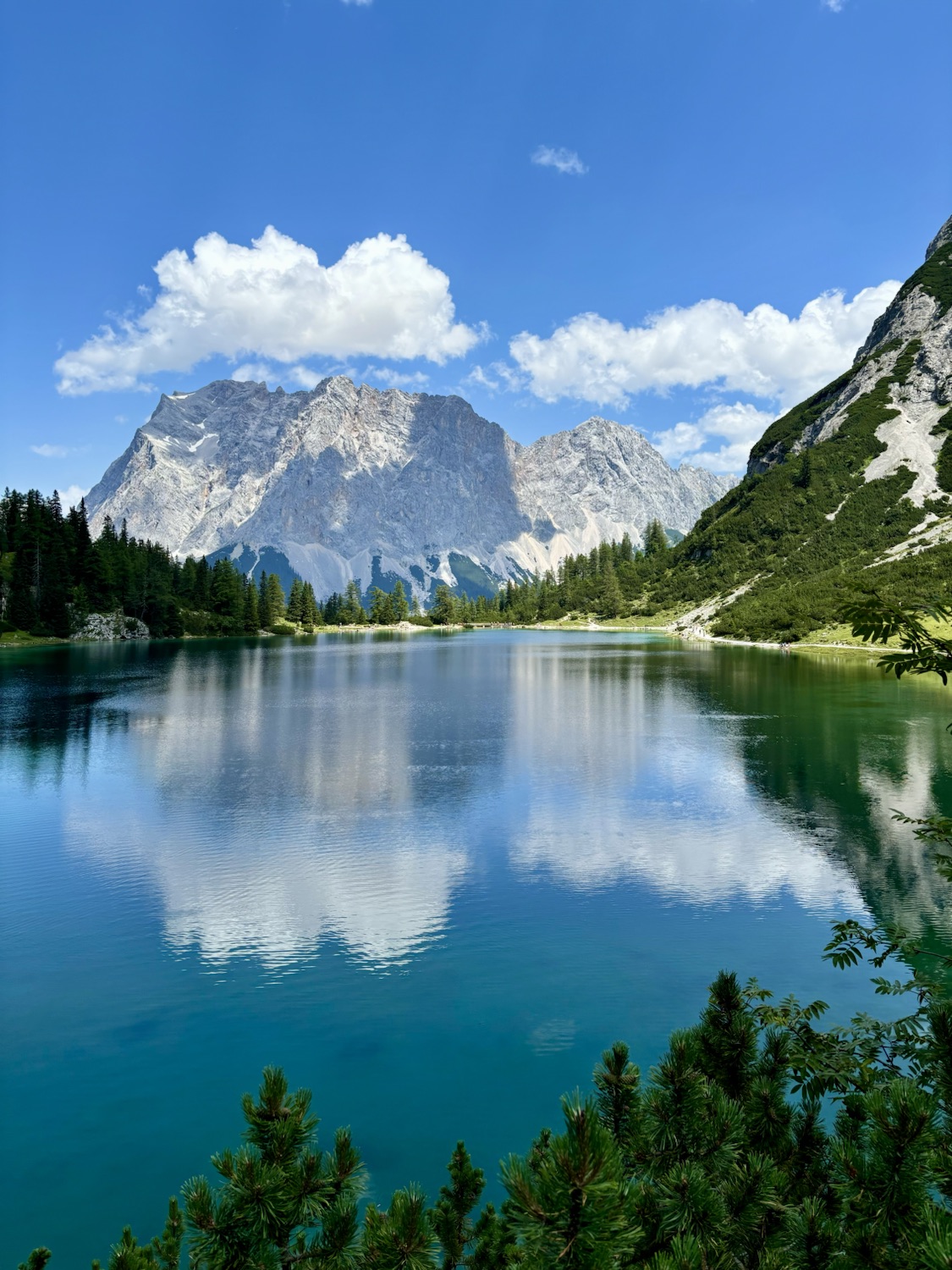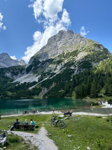 Fiu fiu, tej wycieczki to na pewno nie zapomnę… Zapowiadało się idealnie sielsko: 11.30 gondolą na górę, pogoda cudowna, tłumów brak, dosko. Odbijam spacerkiem na Koatiger Weg i powoli pnę się do góry – cisza, spokój, zielony las, pachnie. Przecinam drogę – sporo ebików, jak zawsze i znowu ścieżką równolegle do drogi dalej, aż do wyjścia na to zapierające dech otwarcie: Sonnenspitz&Drachenkopf w tle, w dole droga, po prawej Seeben Alm. Jeszcze parę minut i jest i ono! Seebensee 🩵💚💙 Absurdalnie nierealnie przepiękne, krajobraz absolutnie pocztówkowy. Rozważam podejść do Coburger Hutte, ale jednak zostaję przy oryginalnym planie: okrążam jezioro i schodzę.