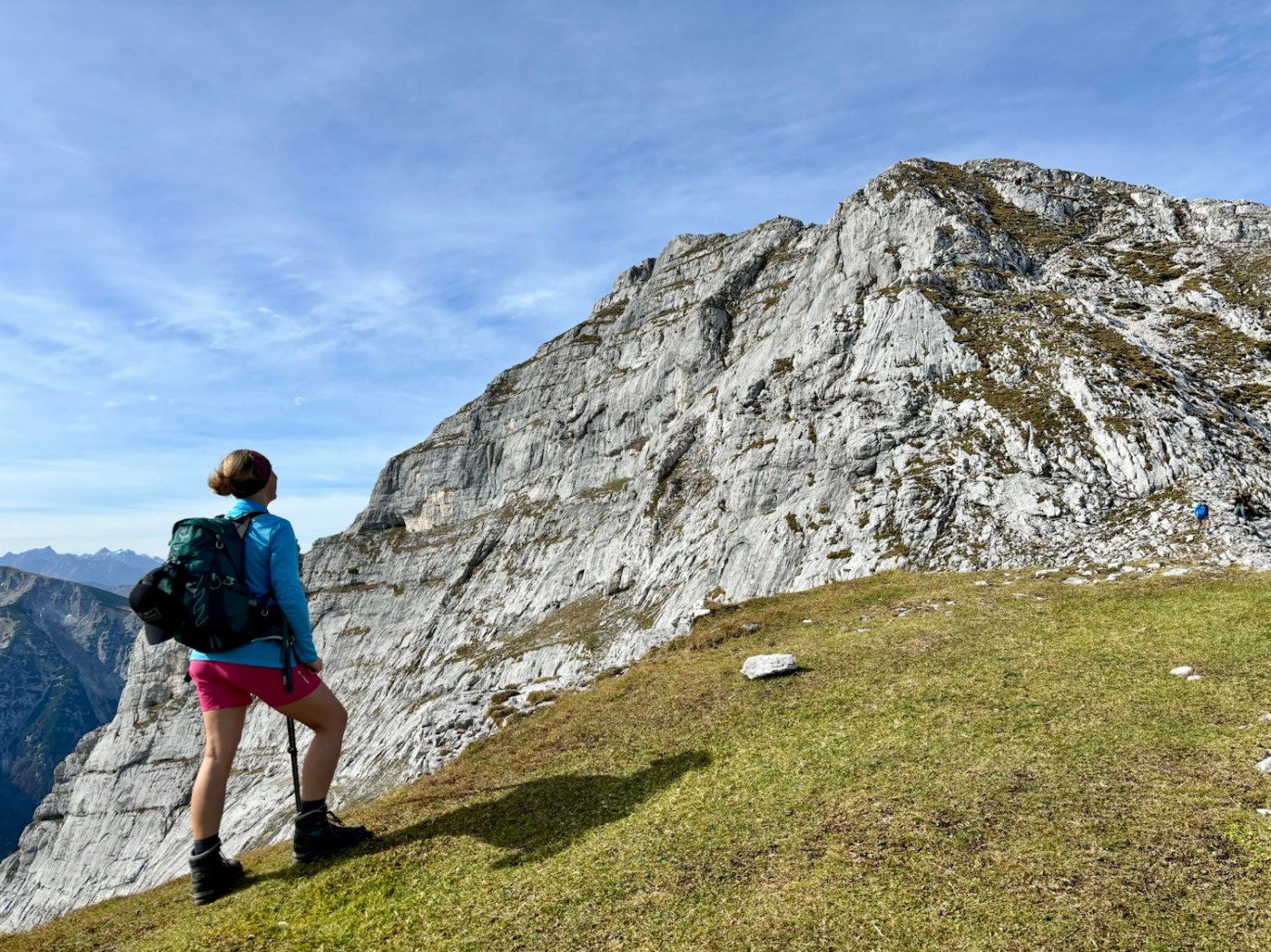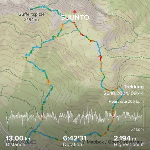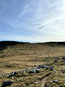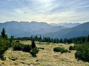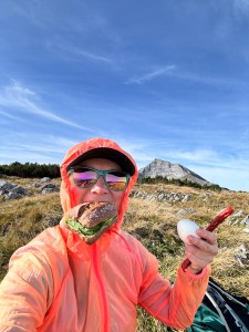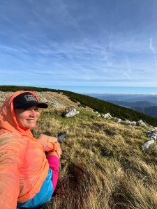 Wszystko w dole tonie w chmurach – warto było uciec z miasta! Schodzę początkowo tą samą trasą: najpierw granią w dół, potem do rozgałęzienia i postanawiam pójść przez Guffertspitze, coby zatoczyć rundę. Jest cudownie! Idę przez połoniny, trawy falują, w oddali jakby morze a dalej ośnieżone 3tysieczniki. Robię jeszcze popas z extra widokiem i ruszam w dół – i jak to zwykle bywa, trasa w dół daje mocniej w kość, niż w górę. Jak w końcu dochodzi duże do ubitej drogi, to uśmiecham się od ucha do ucha! Guffercie, byłeś cudowny! Chętnie kiedyś zawitam znowu ☺️