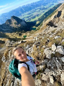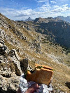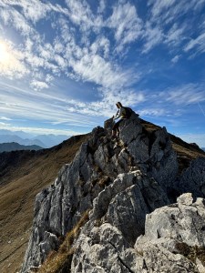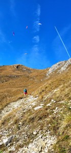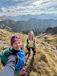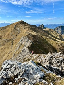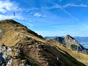 Po drodze przypomina mi się, że już tu jakby byłam: 2 lata temu robiłam Rubihorn, (z mini kleterka na Gaisalphorn…) i schodziłam w dół z siodła, z którego teraz wchodzimy na grań prowadzącą do Nebelhorn. Mały przystanek na popas i ruszamy! Trasa kompletnie nieoznaczona, mimo to parę osób podąża tą ścieżynką. Przejście cudowne: jest trochę Kraxelei, jest wąską ścieżką i są widoki! Na paralotniarzy i jeziorka i piękne postrzępione szczyty. Po 5h docieramy na Nebelhorna, juhuuu! Super było. Teraz obiad na szczycie, spacerkiem do dolnej stacji kolejki i luksusowo w dół. Przepiękna góra i okolica, Allgäu zawsze zachwyca! 🤩